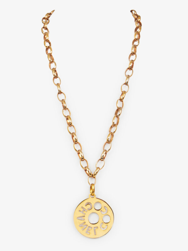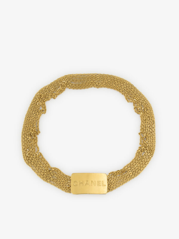 Ce bijou Chanel vintage à double usage se porte aussi bien en ceinture qu’en collier, selon les envies. Composé de plusieurs rangs de chaînes dorées à maille serrée, il est orné d’un imposant médaillon central perforé formant le mot "CHANEL" sur un fond matelassé en relief, clin d’œil au cuir signature de la maison. Un médaillon rond pendant gravé "Chanel Paris" apporte une touche finale à la silhouette. La pièce est en très bon état, avec une dorure brillante homogène et sans défaut majeur.
