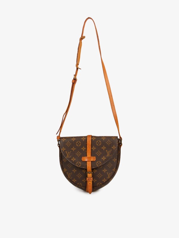 Sac Chantilly Louis Vuitton en toile monogramme et cuir de vache naturel. Porté épaule ou crossbody avec une bandoulière ajustable (au plus court 102cm, au plus long 120cm). En bon état. Le cuir est patiné et présente quelques marques d'usure dû à son grand âge.