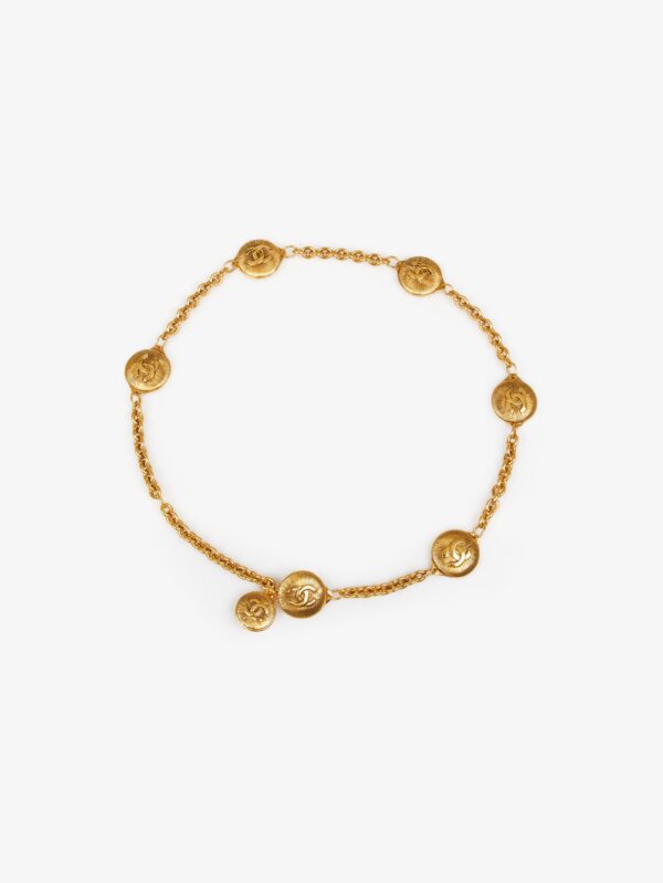 Cette ceinture chaîne Chanel vintage se distingue par sa construction à double rangs en métal plaqué or 24K, formée de gros maillons ovales entrelacés au fini lustré. Elle est ornée d’un médaillon rond gravé du logo emblématique "CC", suspendu à l’extrémité de la chaîne. Conçue pour être portée à la taille ou sur les hanches, cette pièce incarne l’esprit des accessoires Chanel des années passées, à la fois marquants et fonctionnels. Elle est en très bon état général, avec une patine légère sur le métal, caractéristique de son authenticité vintage.