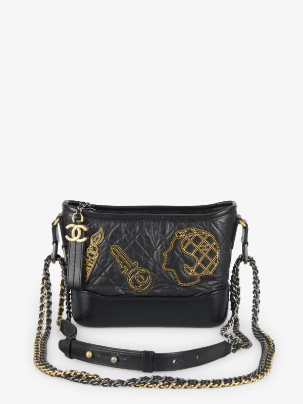4300€Ce sac Chanel Gabrielle en version petit modèle (PM) est conçu en cuir noir vieilli à surpiqûres losangées, caractéristique du style matelassé de la maison. Orné d’écussons brodés dorés sur la face avant, il s’inscrit dans une esthétique collector aux accents graphiques et symboliques. La base rigide en cuir lisse contraste avec la texture souple du haut du sac. Il est équipé d’une bandoulière double chaîne bicolore entrelacée de cuir, dotée d’un renfort en cuir ajustable pour un confort de porté. L’intérieur en toile bordeaux propose une organisation simple et efficace. En très bon état.
