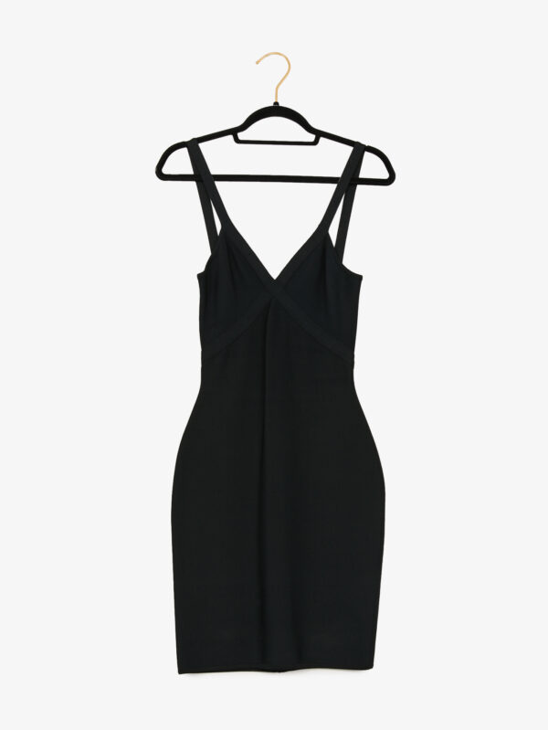 Vintage Hervé Léger "Bandage" midi-length dress in black rayon. V-neck gives a glimpse of cleavage for a very sexy look. Very close to the body. Size 36. Zipped back closure. It hugs the body to perfection. In very good condition.