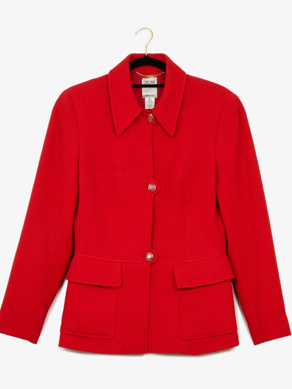 Vintage Christian Lacroix evening suit in size 38 consists of a long jacket and matching pencil skirt, made in a red brocade fabric adorned with gold and black baroque motifs. Featuring an integrated vest under the jacket, it has an intricate construction and refinement characteristic of the house's couture creations. The jacket, structured by a cinched waist, is fastened by a series of gold jeweled buttons with black cabochons. The straight skirt, with its sober cut, balances the ensemble. The interior is fully lined in black silk. In very good condition, this suit stands out for the richness of its pattern, the quality of its finishing and its assertive theatrical spirit.