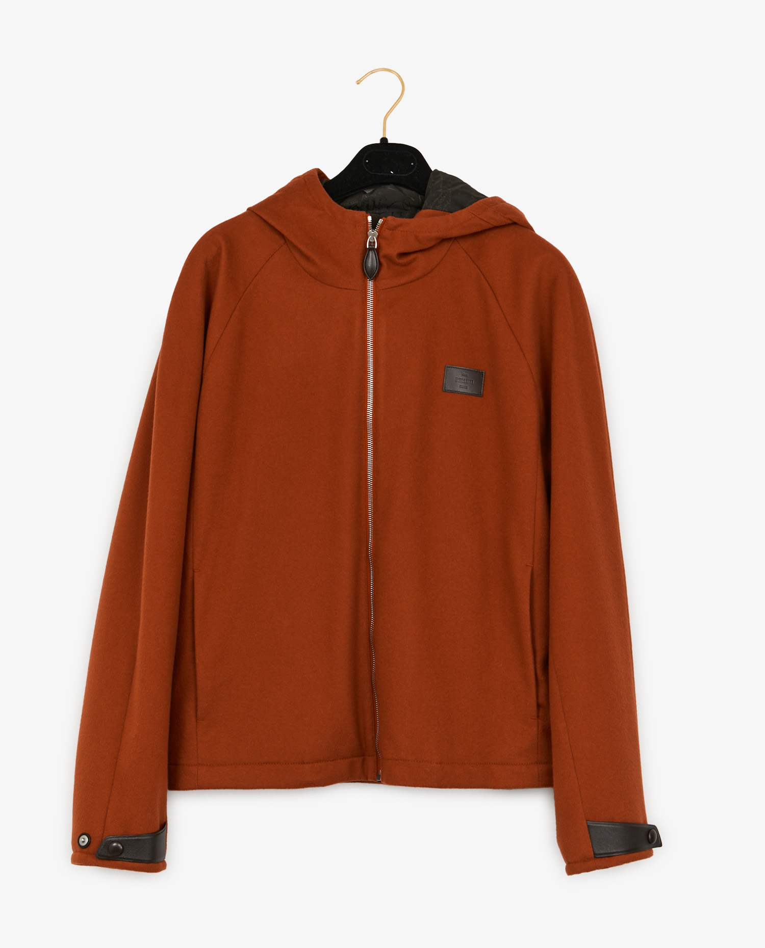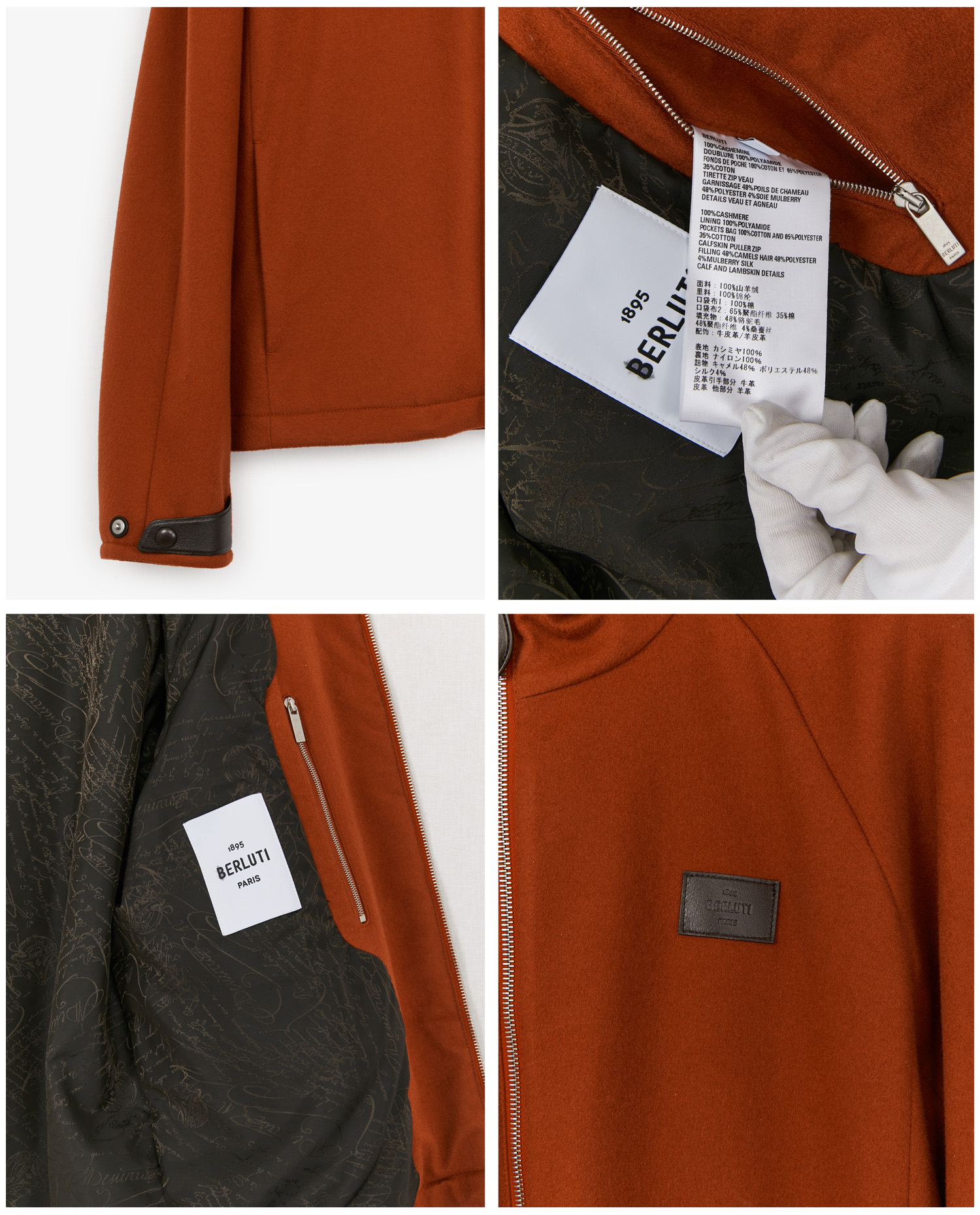 Berluti cashmere hooded B-Way jacket in ochre. Size 44. It closes with a silver-tone metal zipper. Two front patch pockets. The lining is Monogram brown canvas. In very good condition.