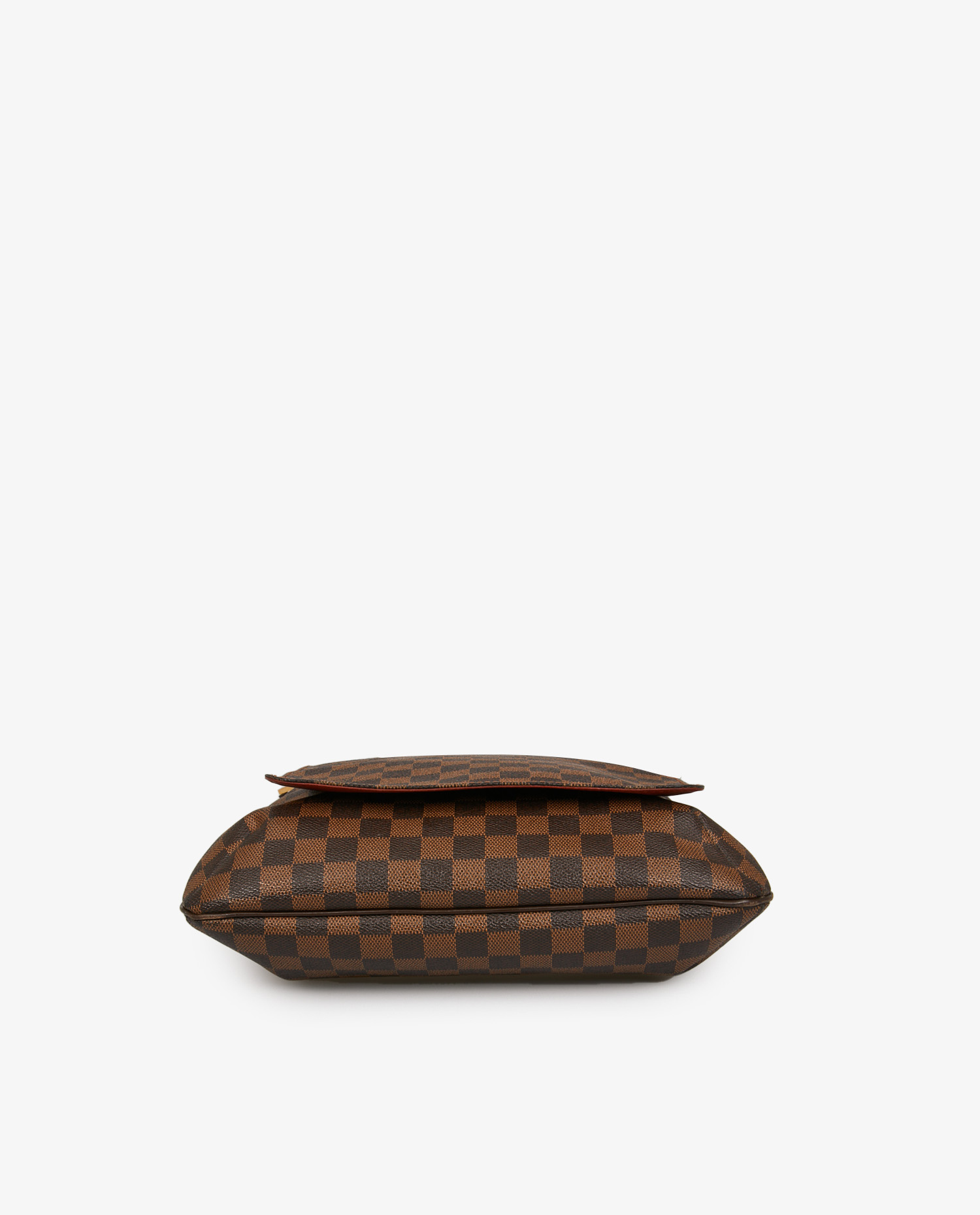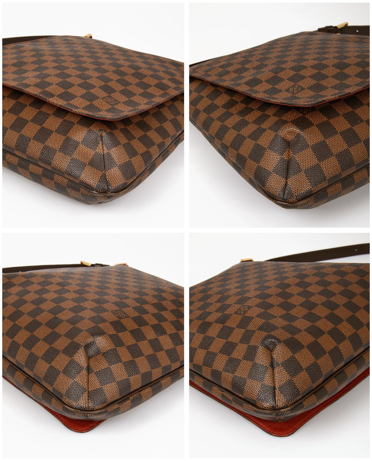 The bag is made from moisture- and scratch-resistant Ebony checkerboard-coated canvas. Its flap without zipper reinforces its fluidity of use, while the flat base guarantees a good hold when empty. The corners are reinforced by sturdy stitching, and the slim shoulder strap in smooth brown leather is adjustable with a Louis Vuitton engraved gold buckle. The metal finish has a light patina consistent with regular use. There are no ostentatious logos on the front, contributing to the sobriety of the design.