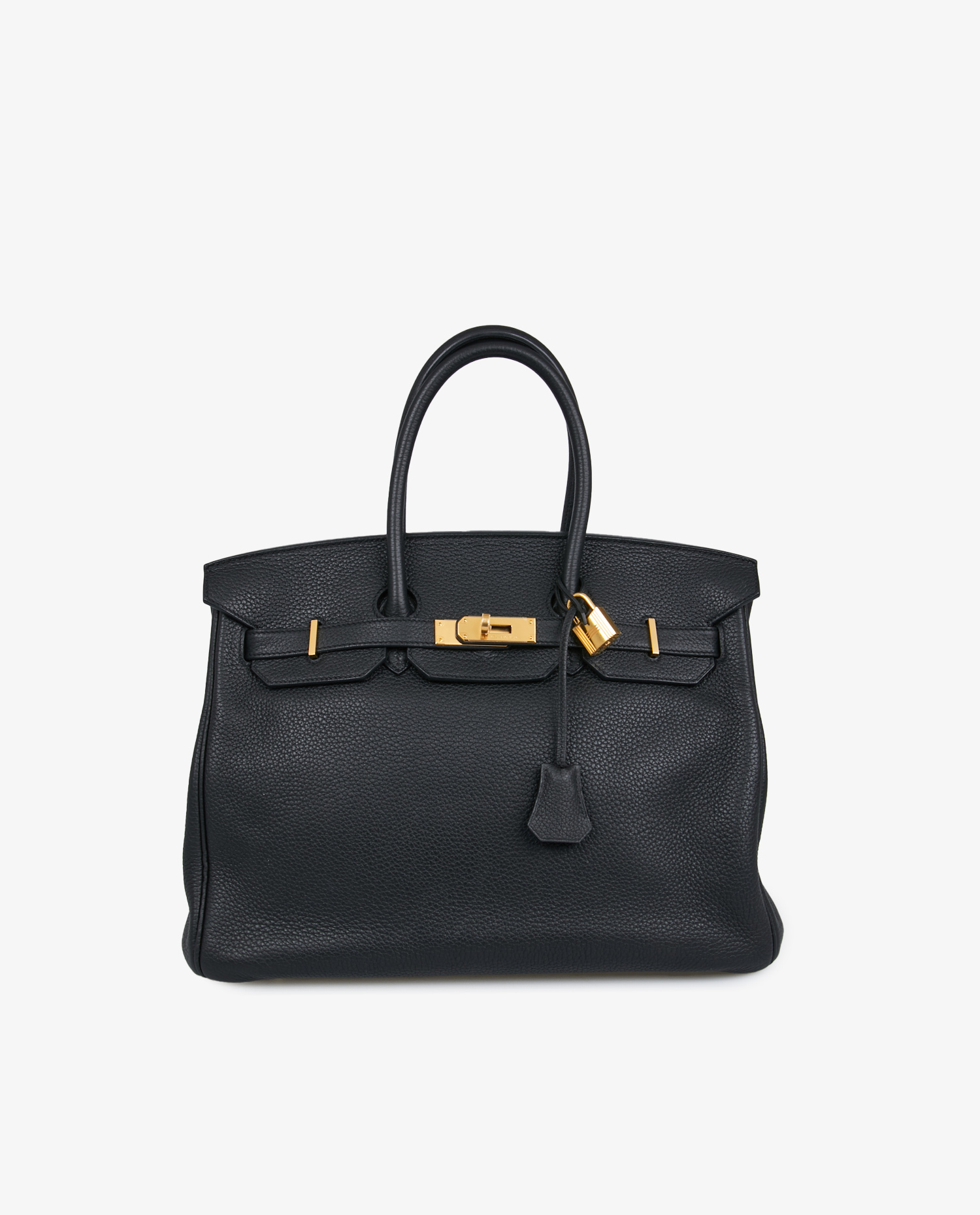 This 2012 Birkin 35 is in excellent condition. The leather retains its original grain with no major signs of wear. The corners are sharp, the handles stiff and the shape of the bag remains perfectly structured. The gold elements have an intact shine, and the original plastic protectors are still present on the hardware, a sign of very limited use. The interior is clean, with no visible marks or scratches.