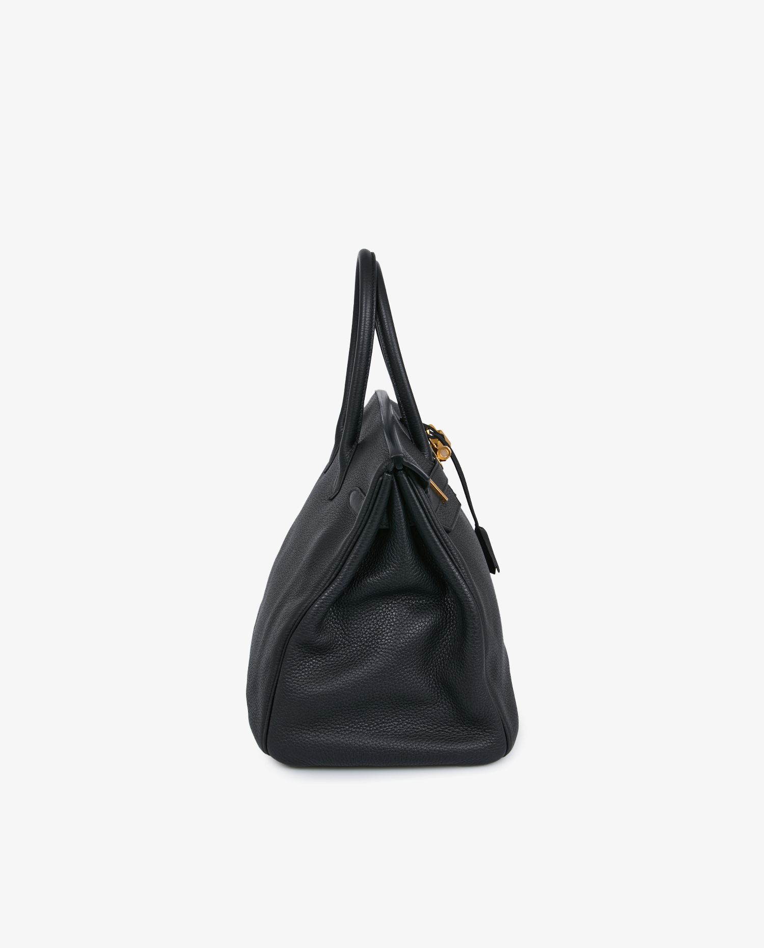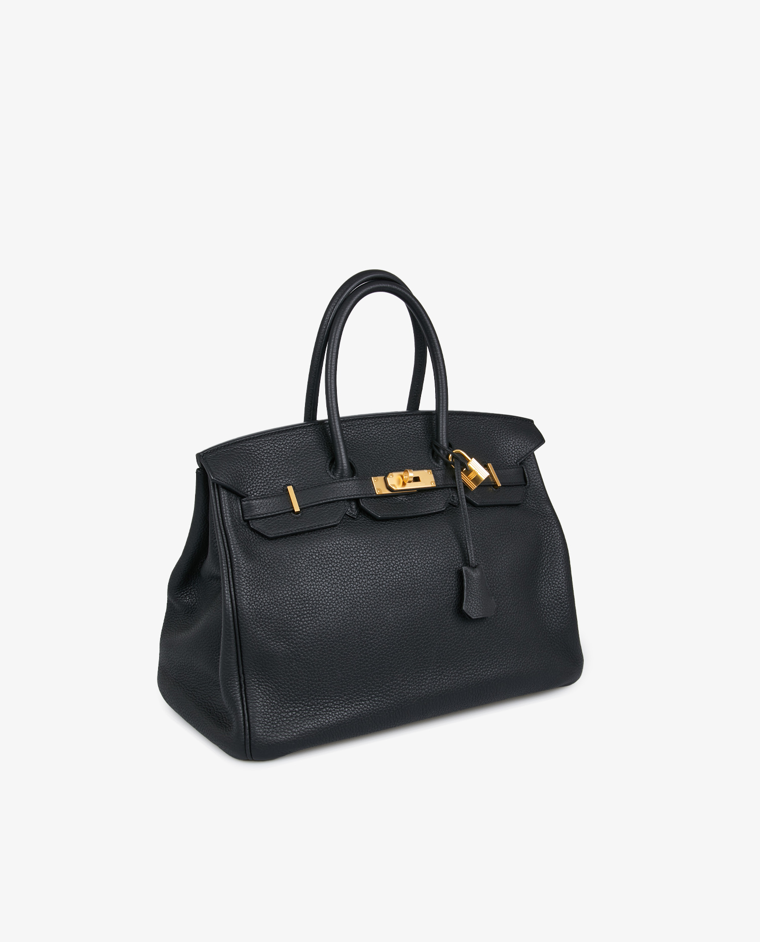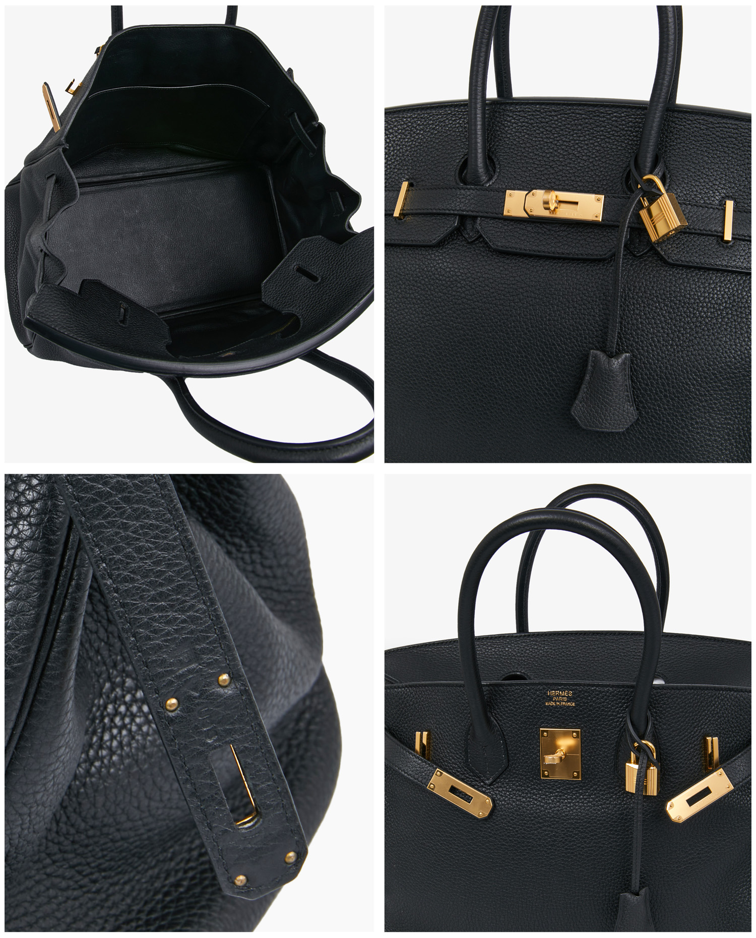 Black Togo leather has a fine, even grain that is both supple and sufficiently rigid to guarantee long-lasting durability. The golden metallic elements, shiny without excess, add warmth and sophistication. The tone-on-tone saddle stitching is hand-crafted using Hermès artisanal techniques. The bag measures approximately 35 cm long, 25 cm high and 18 cm deep, with a handle height of around 12 cm, suitable for comfortable hand-carrying.