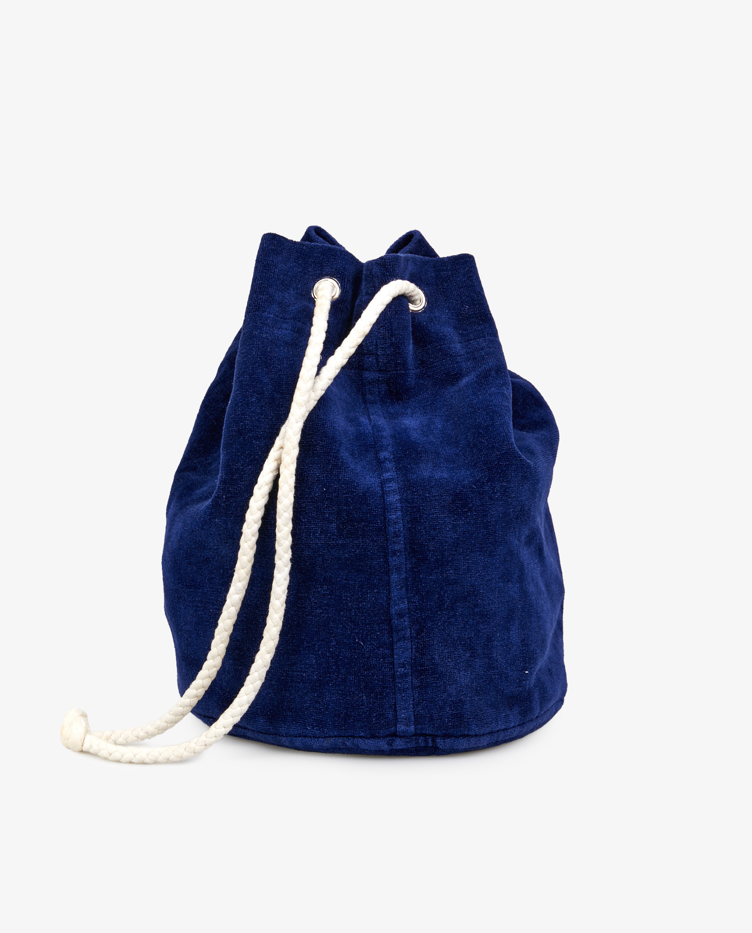 The exterior of the bag is made of thick cotton terry in an intense royal blue hue, with a soft, velvety texture. The fabric, though soft, has a certain hold, allowing the bag to retain its shape when filled. The fastening system is based on a twisted white cord slipped through sturdy metal eyelets, ensuring smooth, resistant use. The front is embroidered with a figurative motif in yellow and white, evoking a world halfway between university sports and nautical emblems. The overall effect is one of assertive vintage spirit, both utilitarian and stylish.