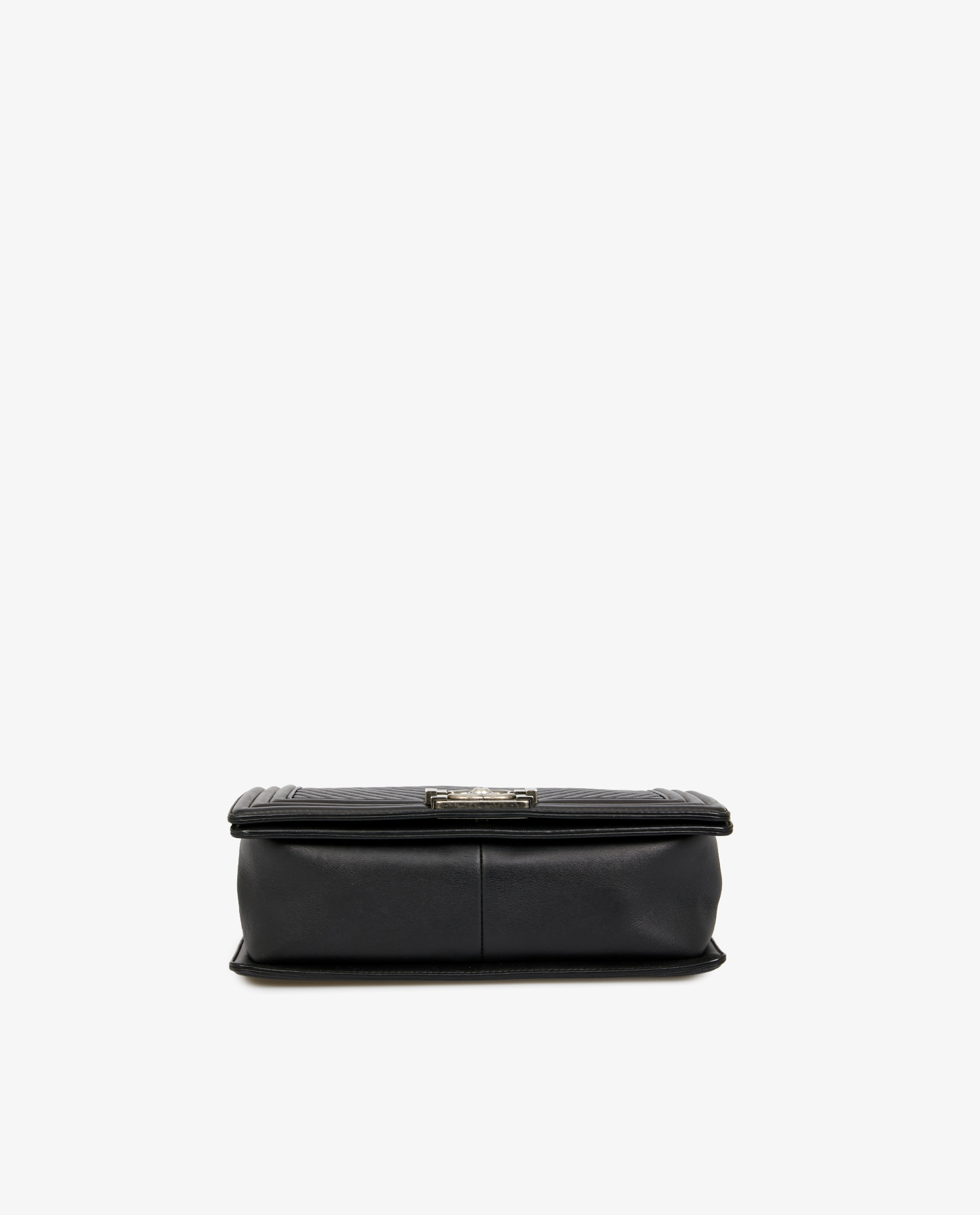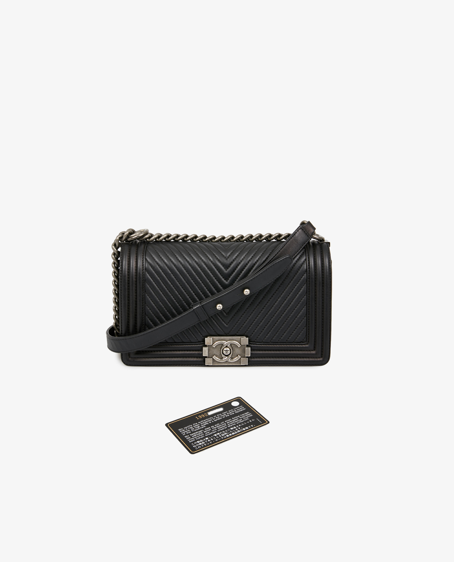 Chanel Boy bag in black herringbone leather. Carried on the shoulder or across the body (108cm). The interior is in burgundy leather. Antique silver jewelry. In very good condition.