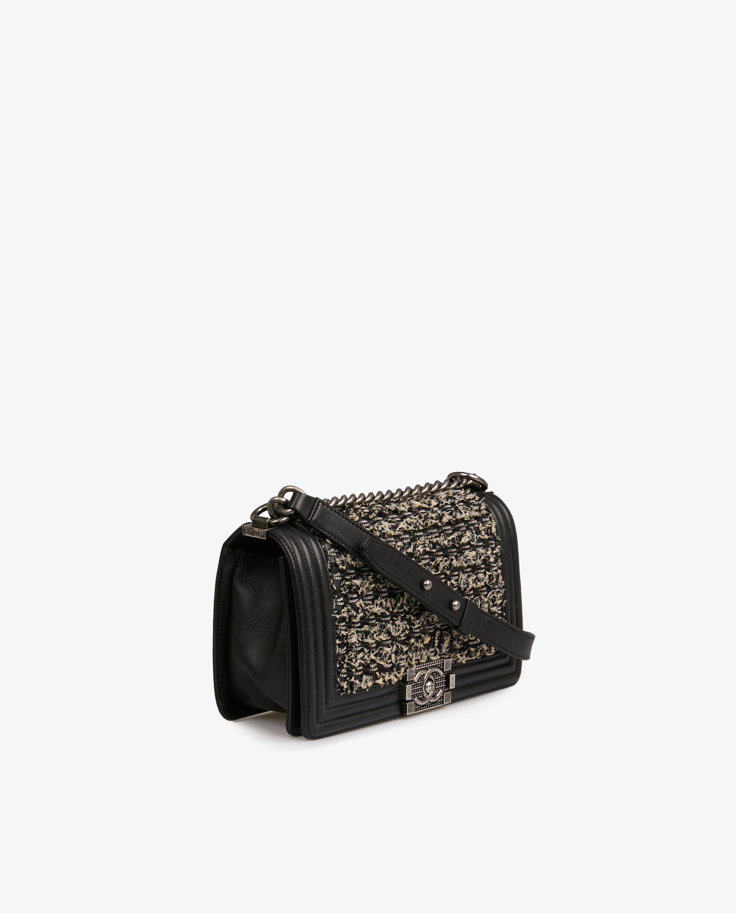 Chanel Médium Boy bag in black lambskin leather with gray tweed and intertwined silver chains. The jewelry is in aged silver metal. The interior is in black fabric with a patch pocket. Worn on the shoulder or double-shouldered. In very good condition.