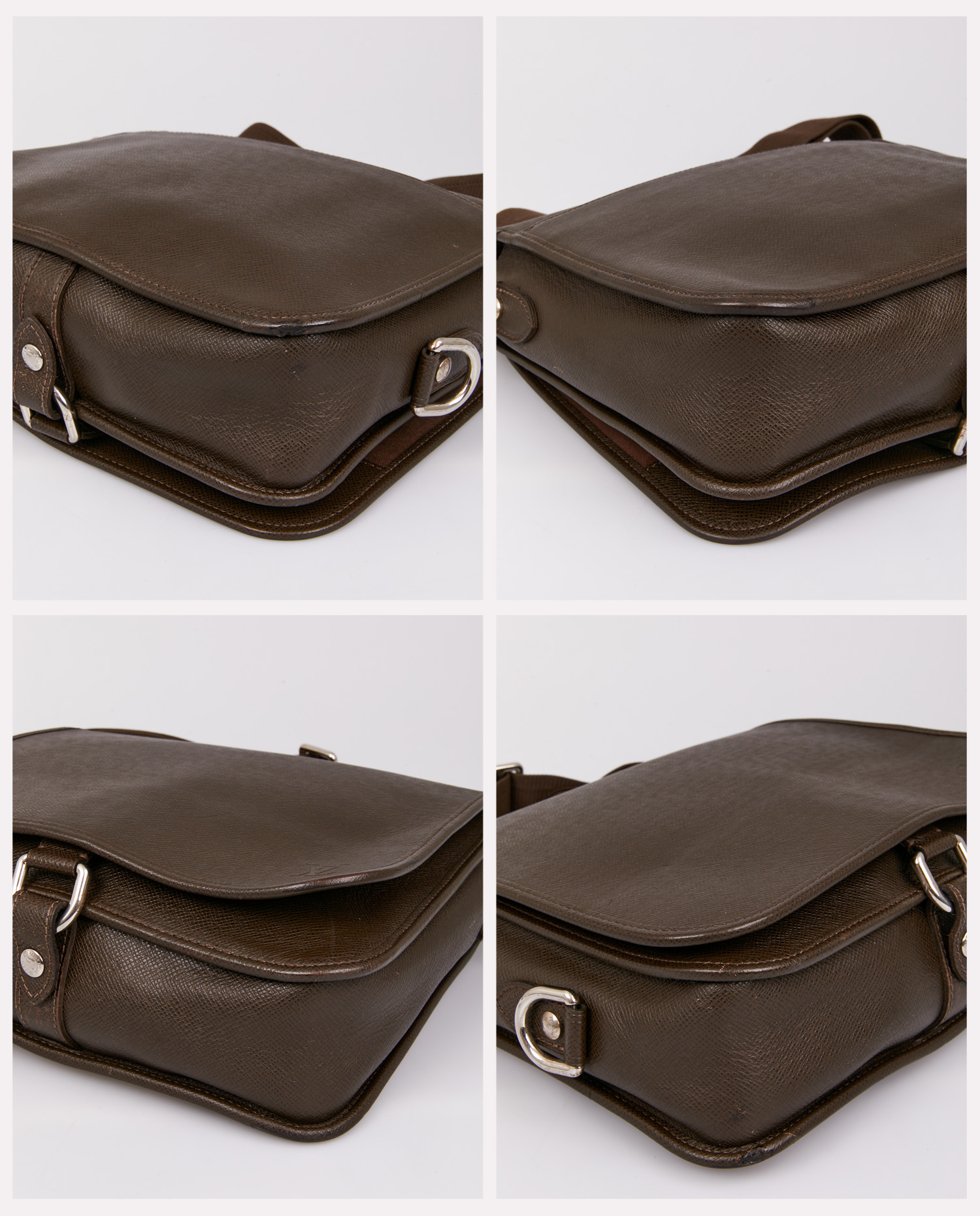 Crafted in dark brown Taiga leather, the surface has an even grain and good hold. The design is deliberately uncluttered, with a small LV logo embossed in the lower right-hand corner. The distinctive feature of this model is its closure: a snap fastener concealed beneath the bottom of the bag, invisible to the naked eye when worn. The adjustable shoulder strap is made of sturdy brown canvas with leather reinforcements and silver-finish metal buckles. The back features a flat pocket for quick storage.