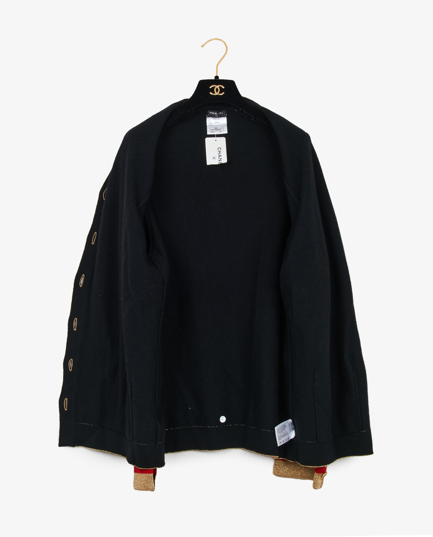 Chanel black cashmere cardigan with gold collar. Métiers d’arts “Paris-Moscou” collection, Autumn/Winter 2009. Size 44. V-neck. In very good condition.