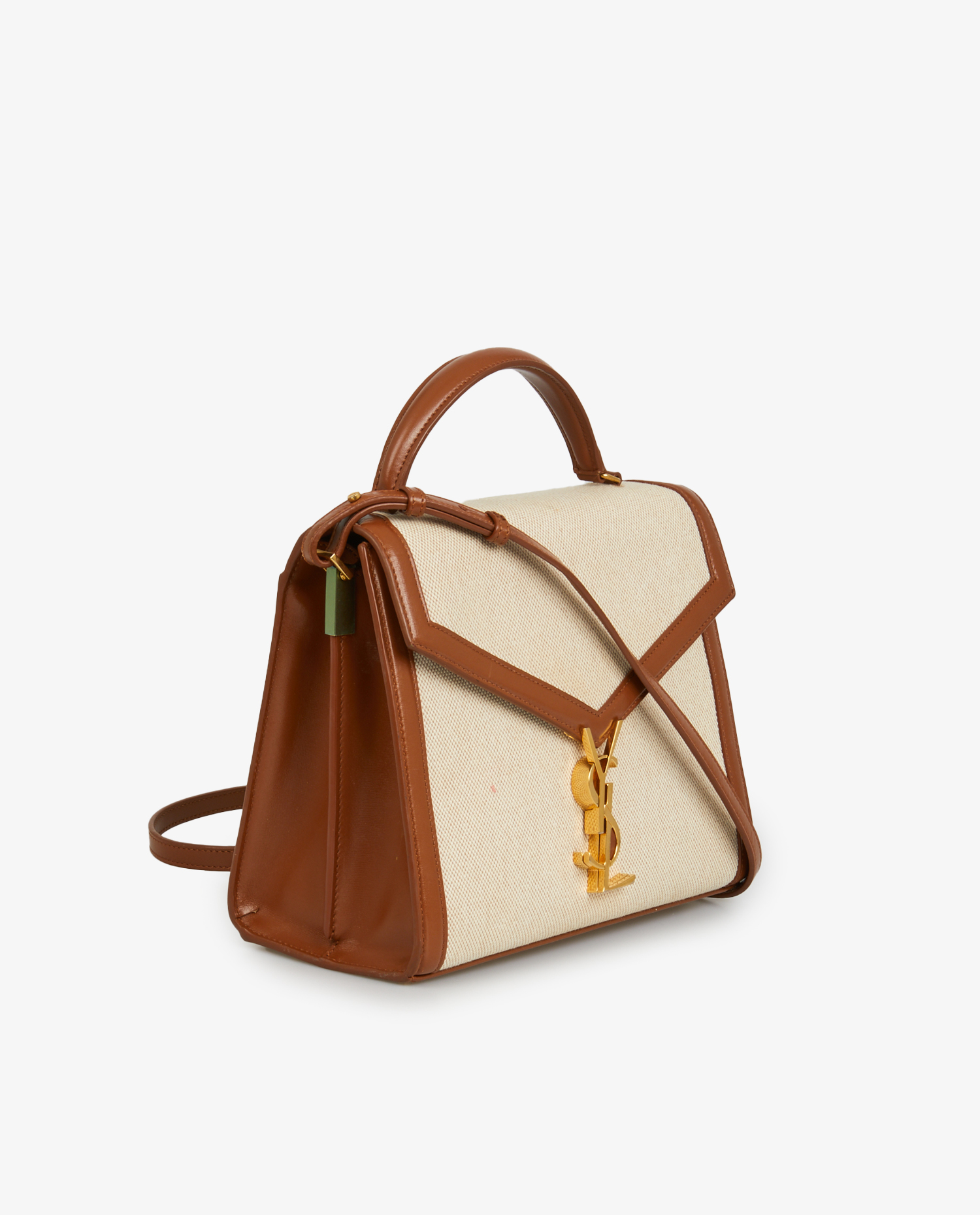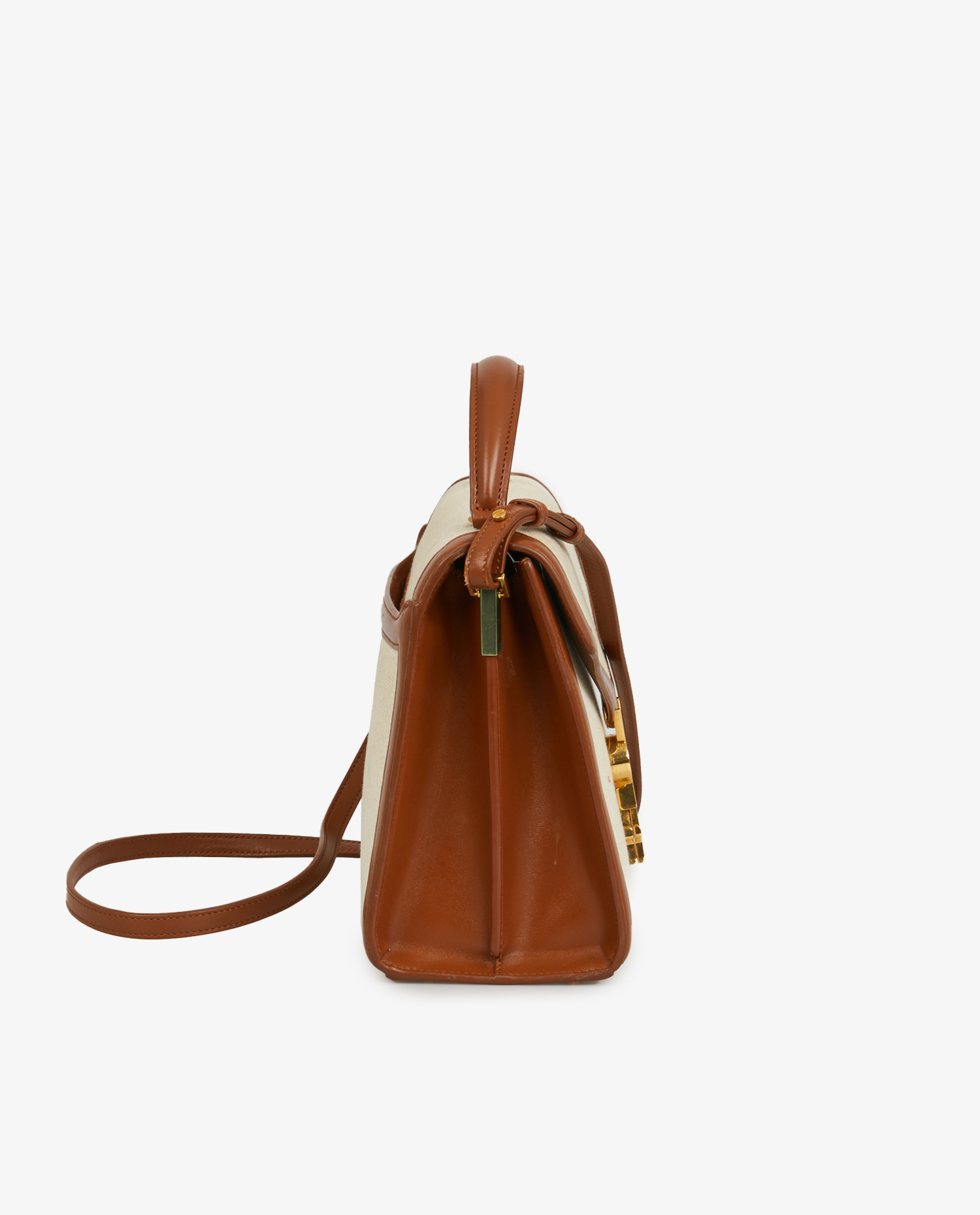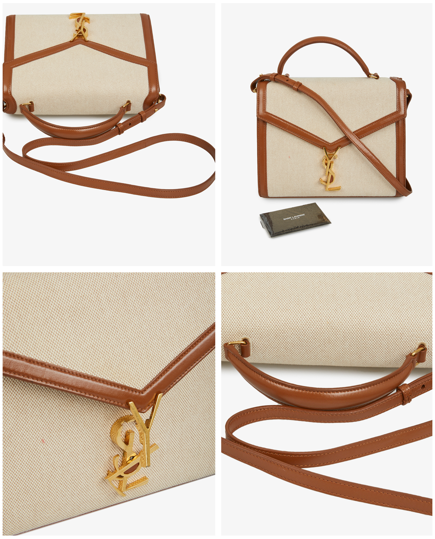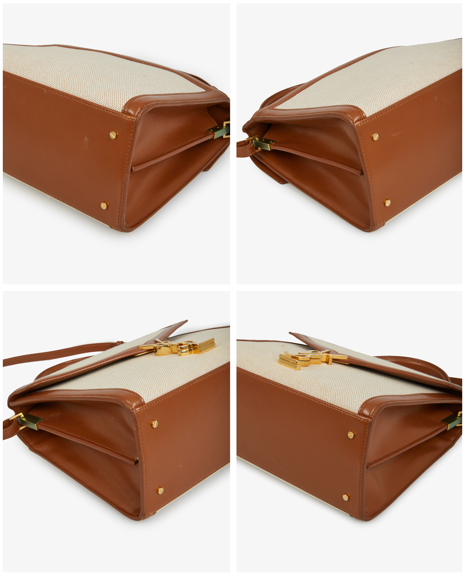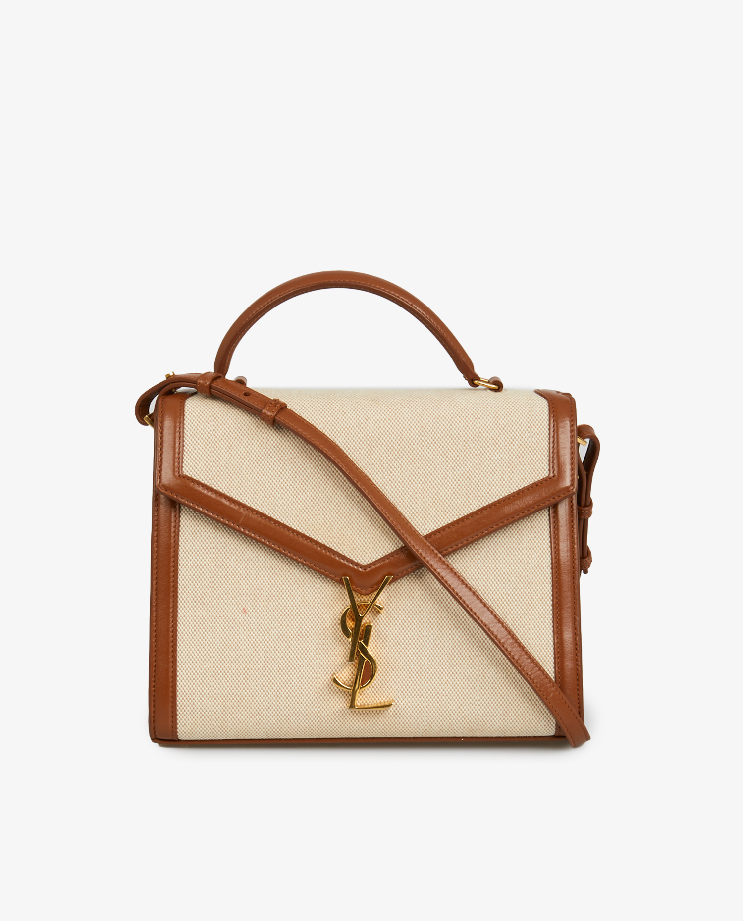 Yves Saint Laurent Cassandra bag in beige canvas and brown leather. Gold-plated YSL clasp. Carried by hand or on the shoulder. In very good condition.