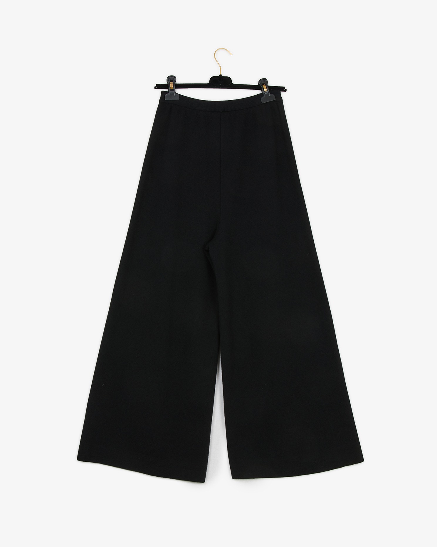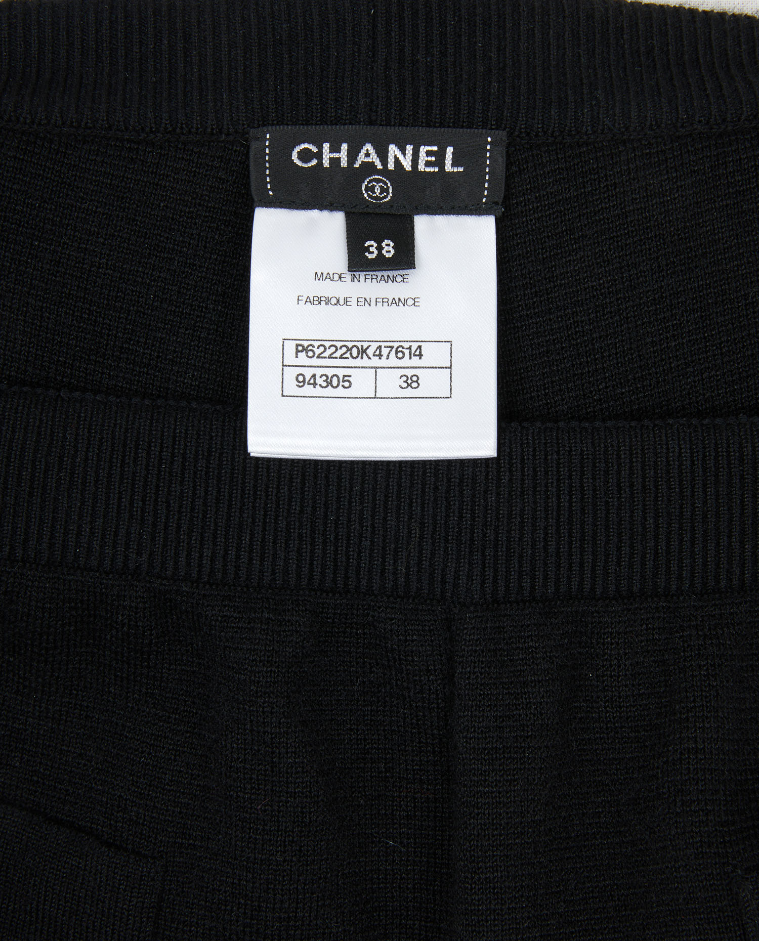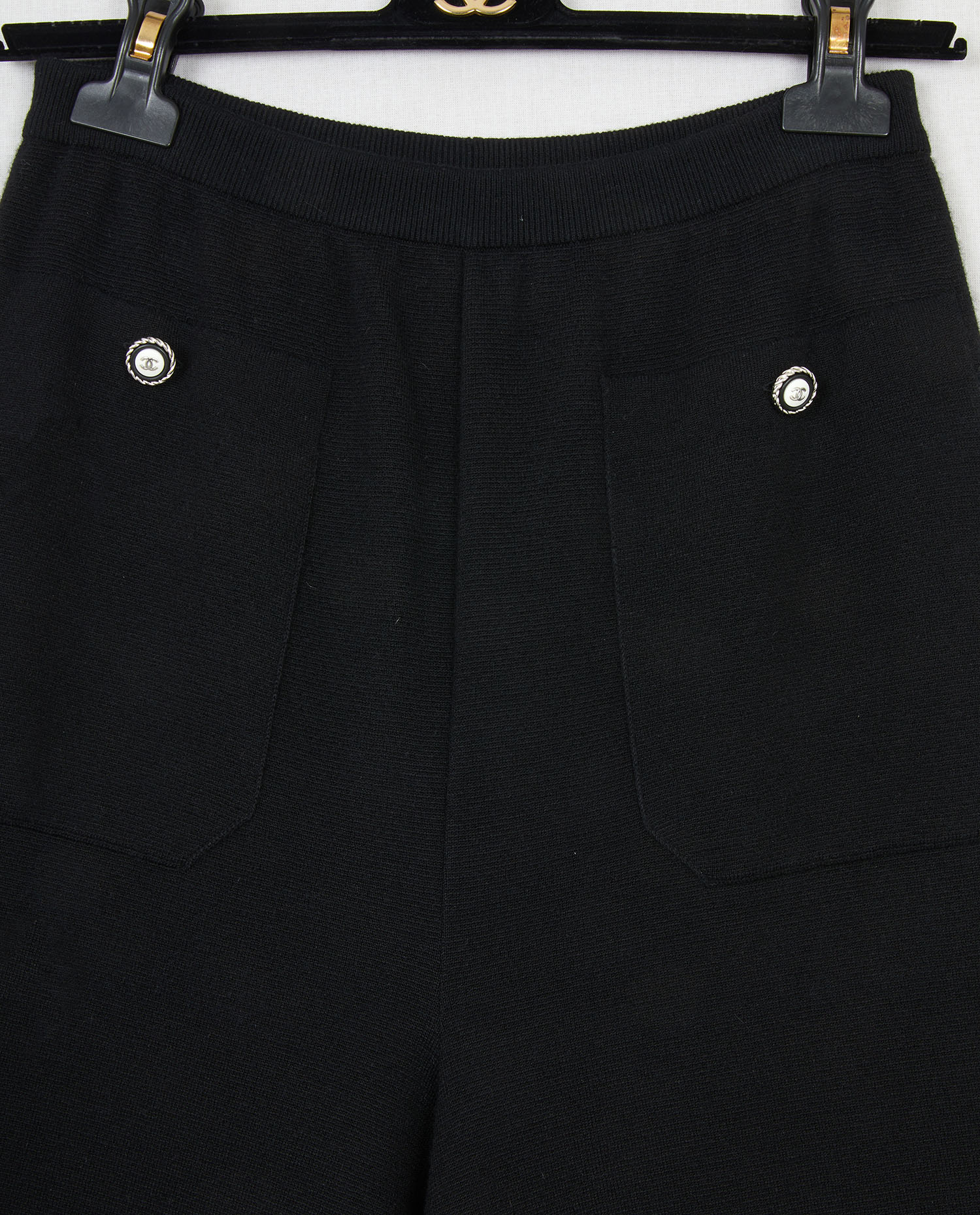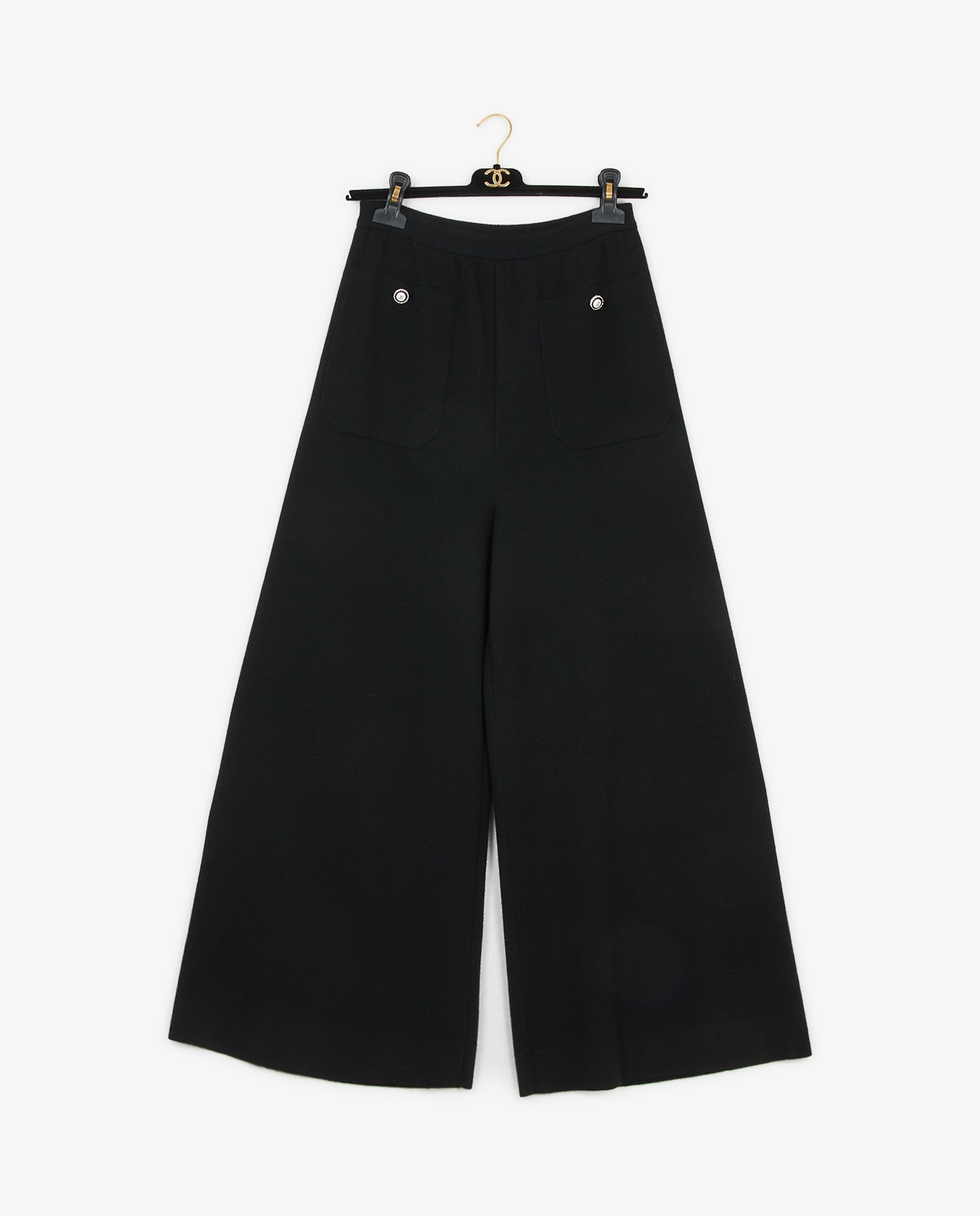 Chanel pants in black cashmere and cotton. Size 38. Two false front pockets marked with two CC buttons. Elastic waistband. In very good condition.