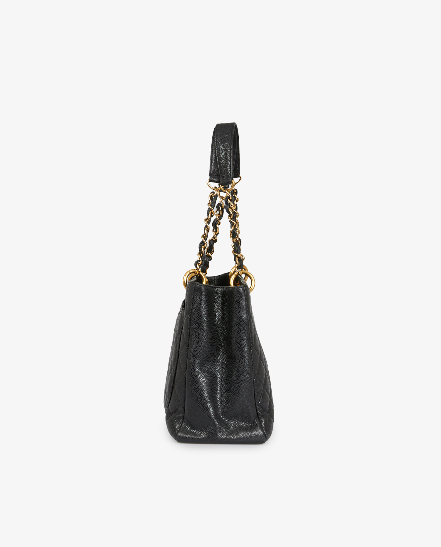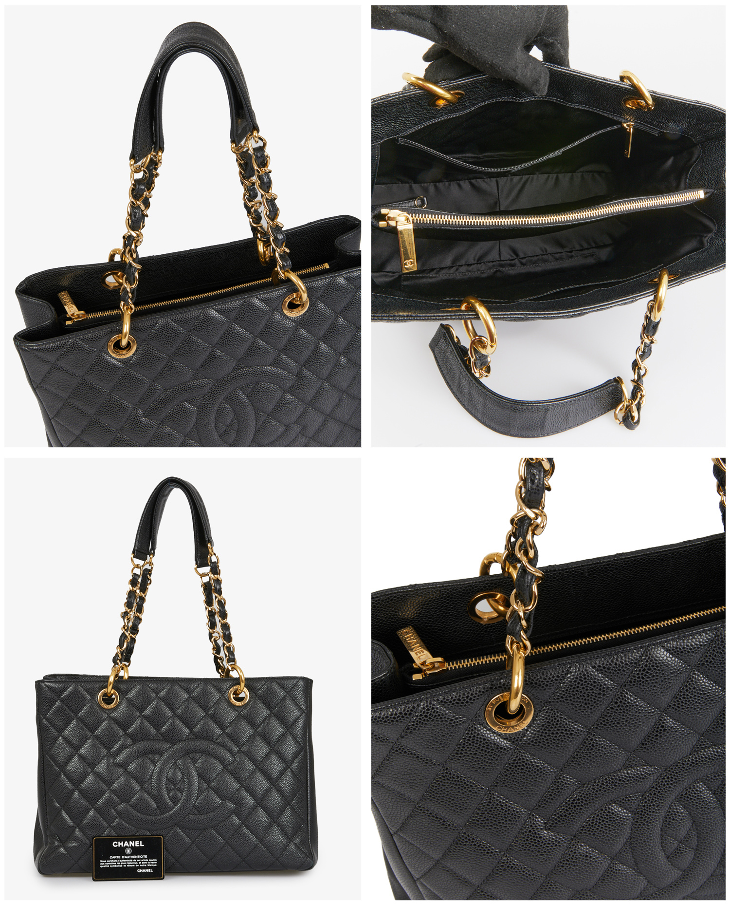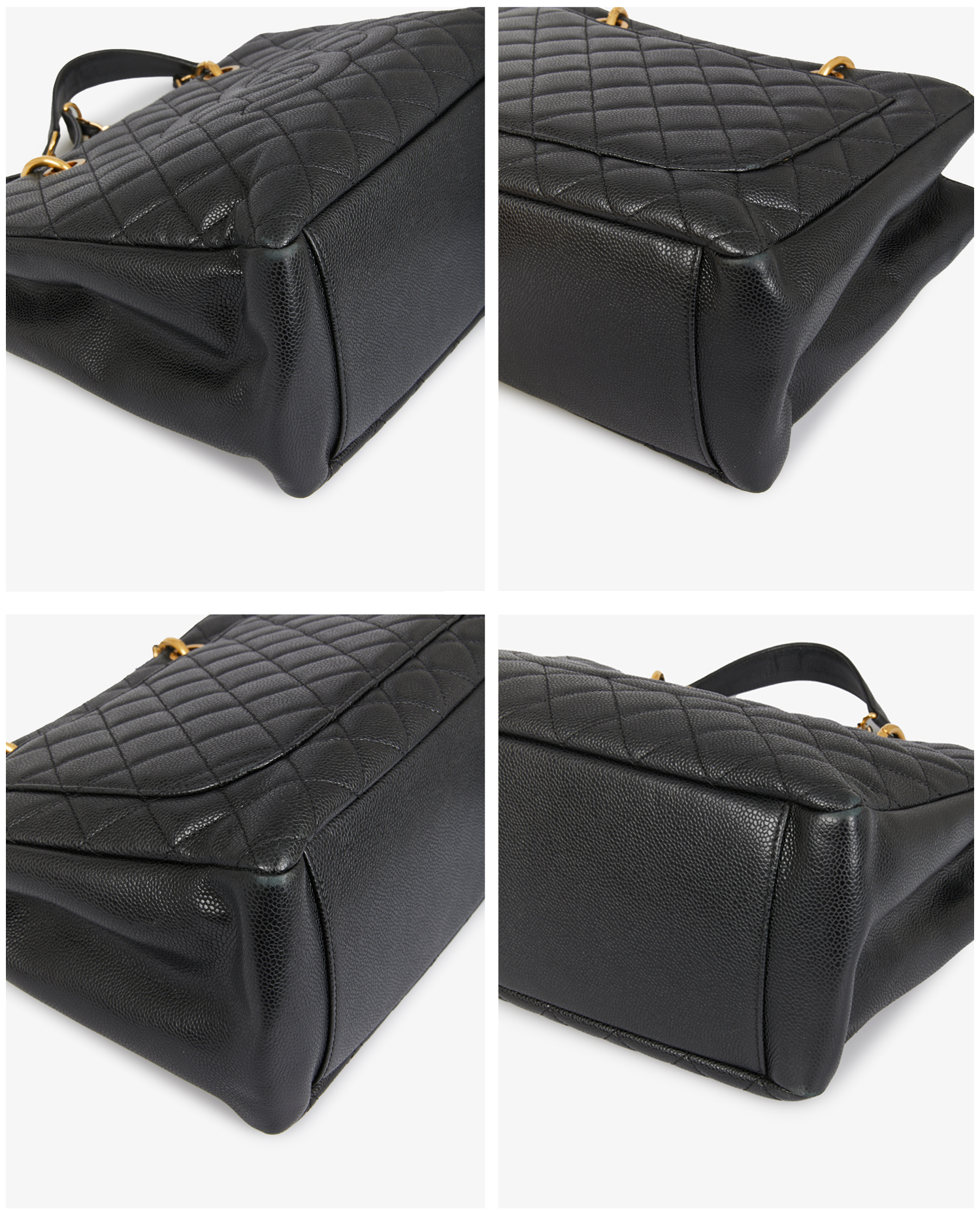 Chanel tote bag in black quilted grained leather. Golden jewelry. Carried on the shoulder. The interior is in black satin with two storage compartments separated by a large zipped pocket. In very good condition. Slight wear to corners under bag.