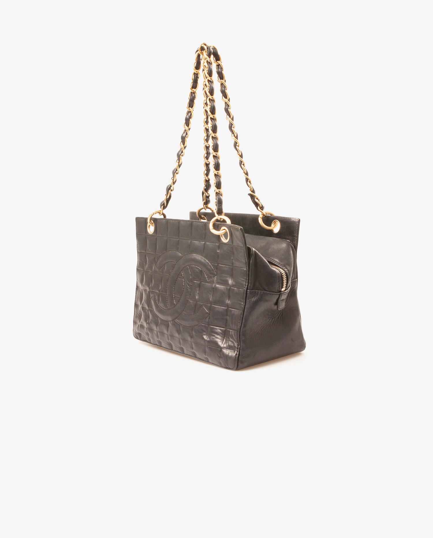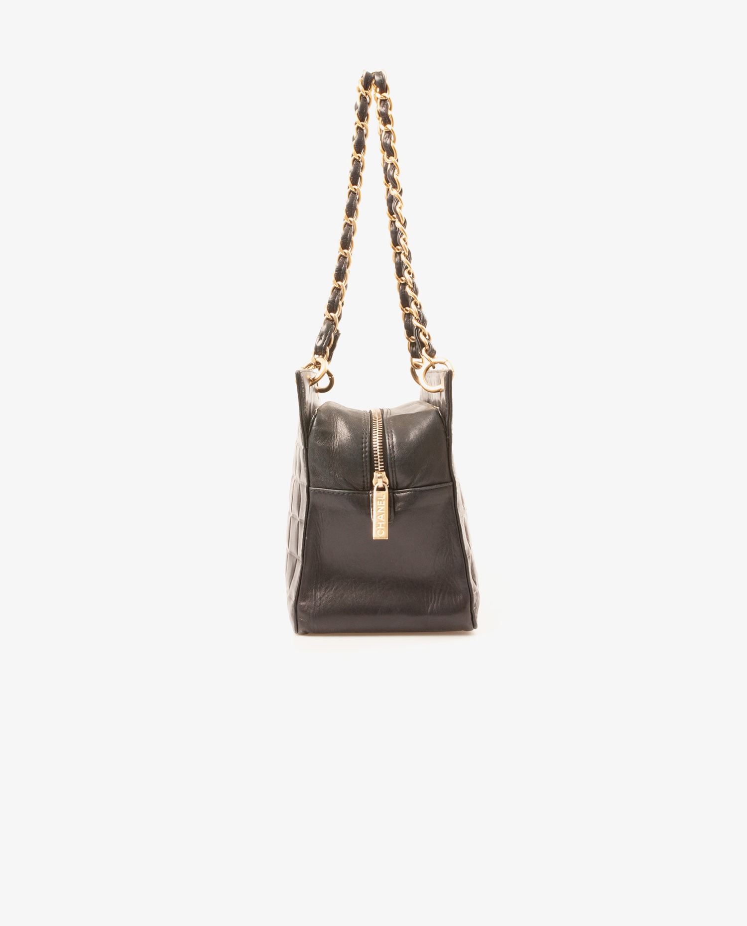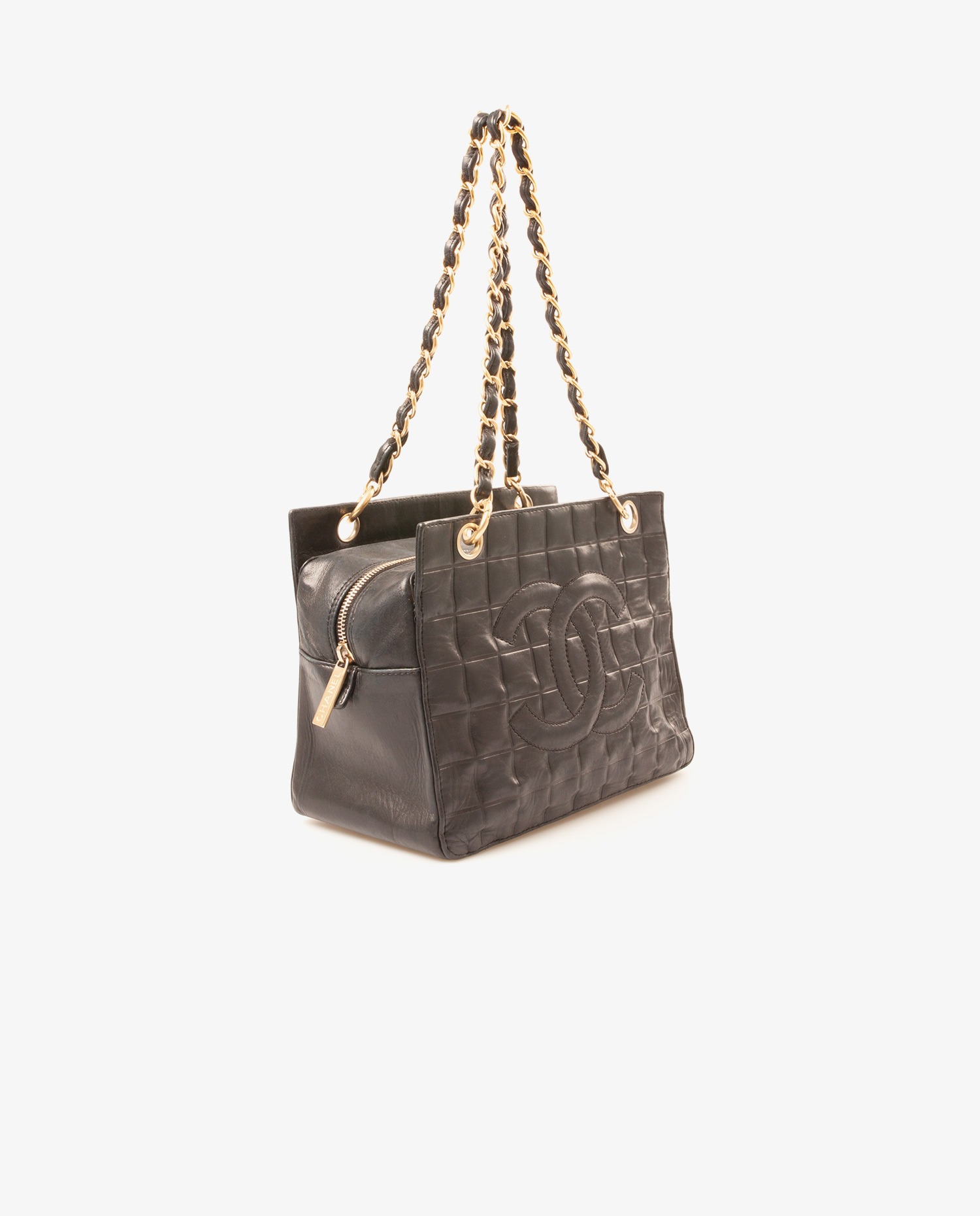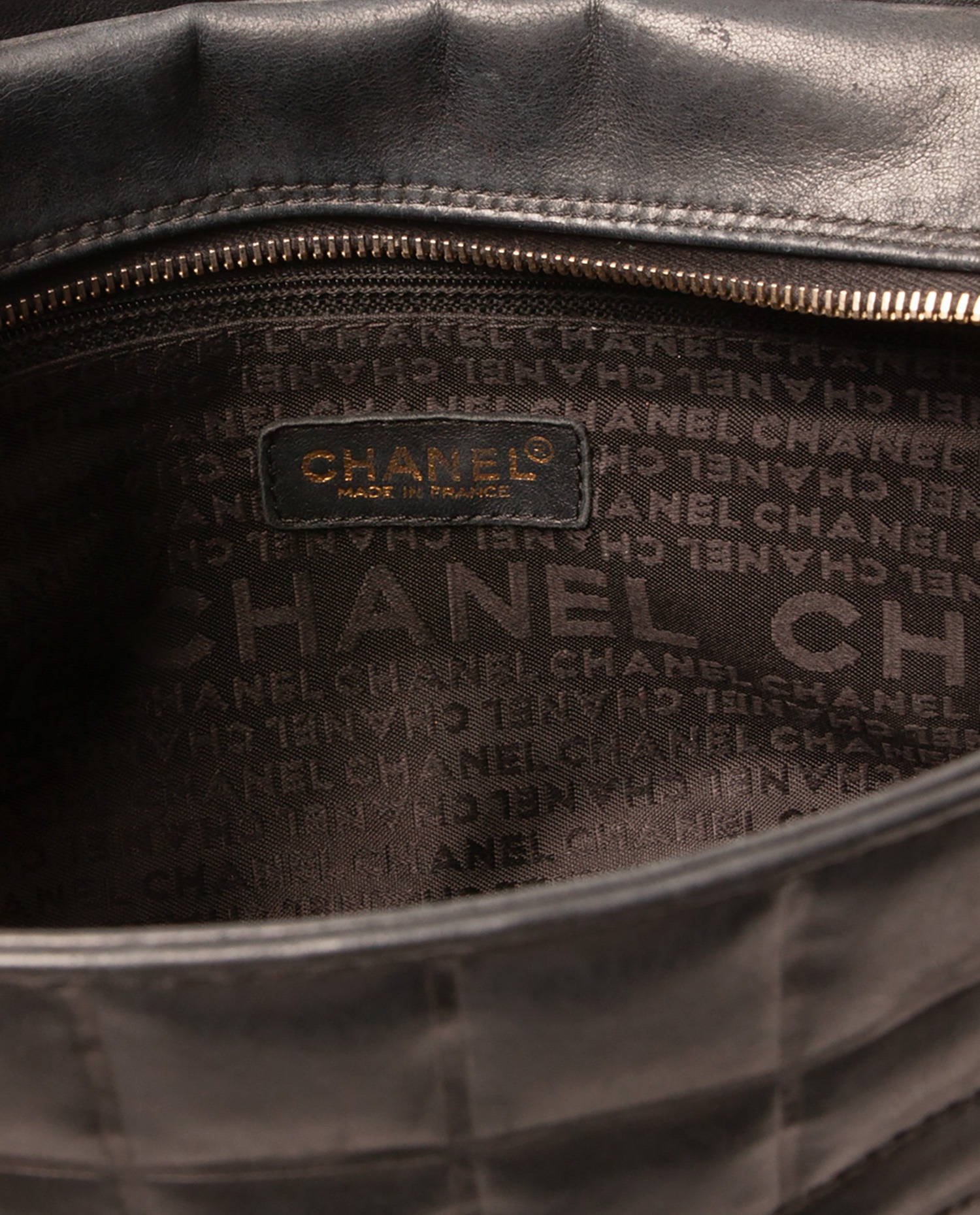 Chanel shoulder bag in black quilted lambskin. The interior is in black canvas with the CHANEL logo. Zipper closure. The handles measure 52 cm. It is in very good condition. A few traces of wear are visible near the clasp.