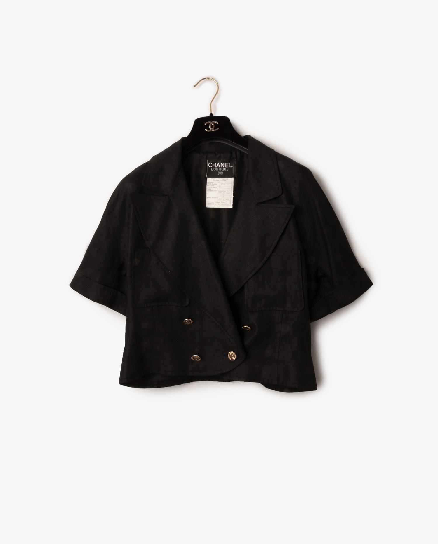 Perfect for summer! Chanel black linen short double-breasted jacket. Black silk “CC” lining. Four gold buttons on the front, signed “COCO MADEMOISELLE”.