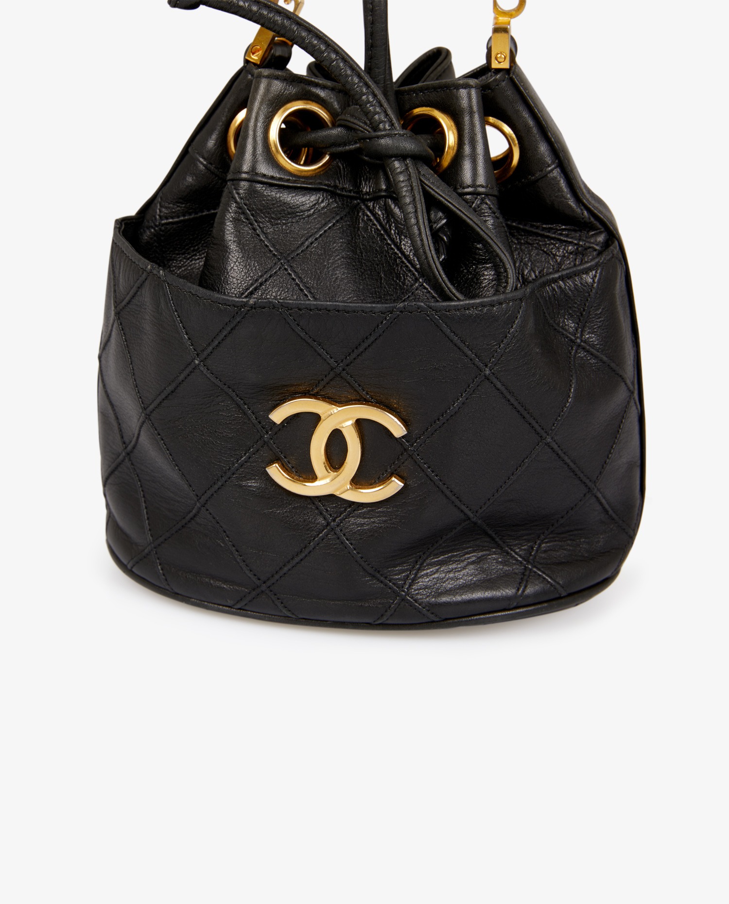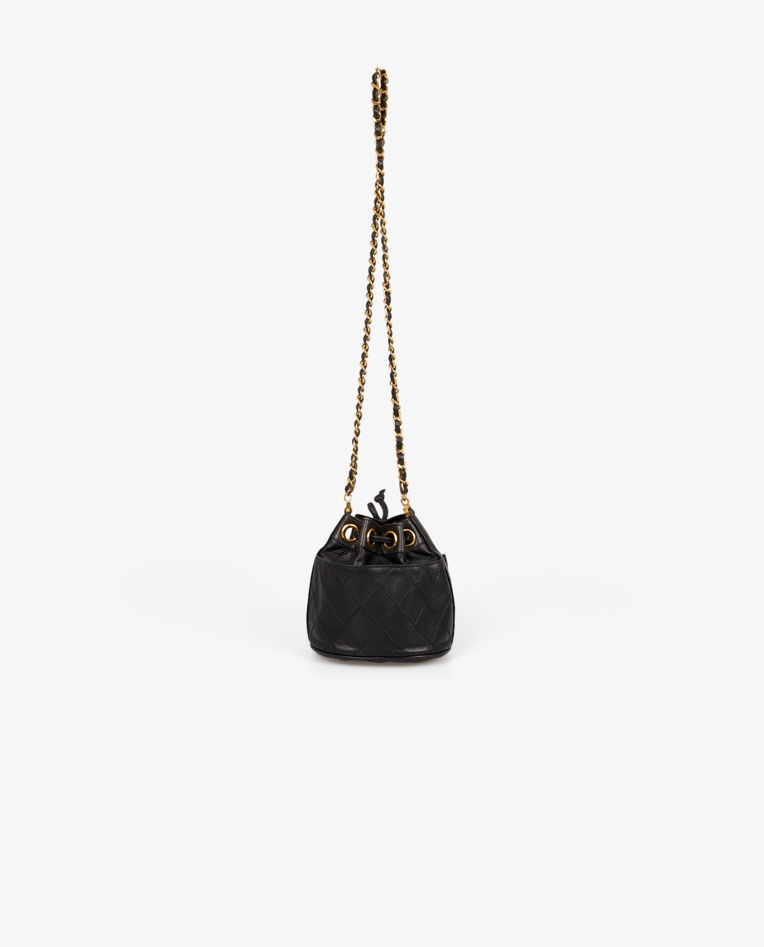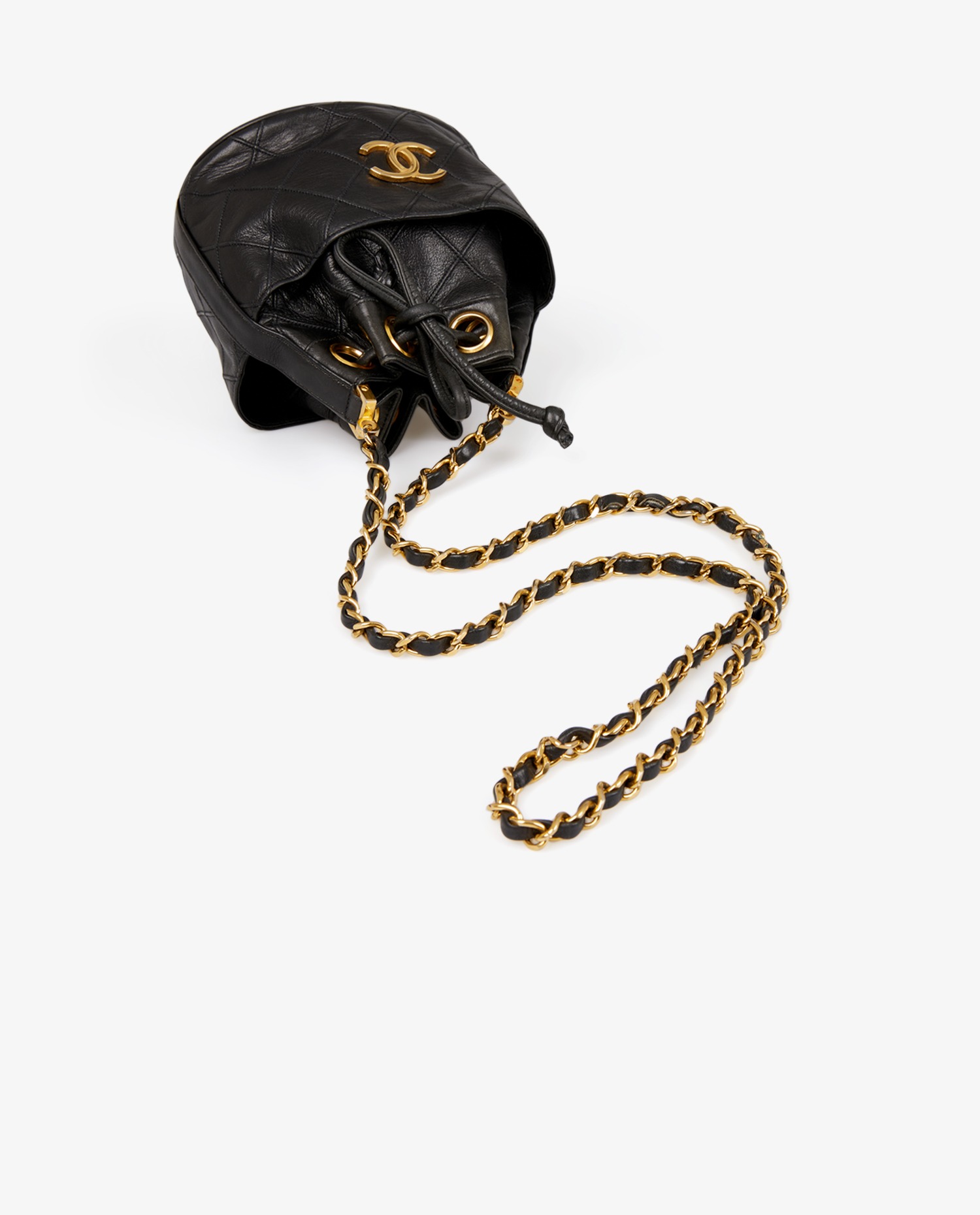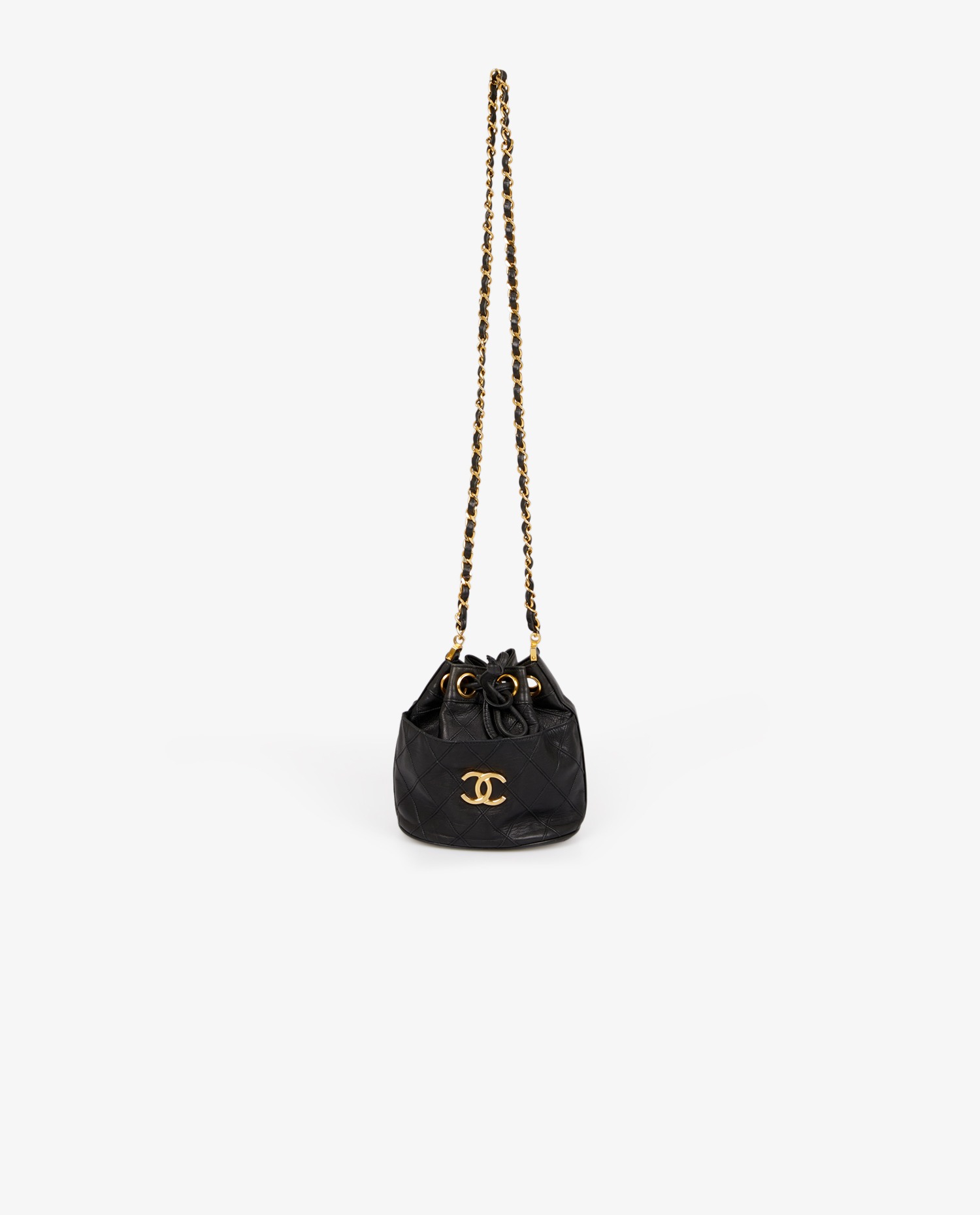 Vintage Chanel quilted leather mini purse. Worn on the shoulder or crossbody. The shoulder strap is in leather and gold chain and measures 99cm. A tie closes the bag. In very good condition.