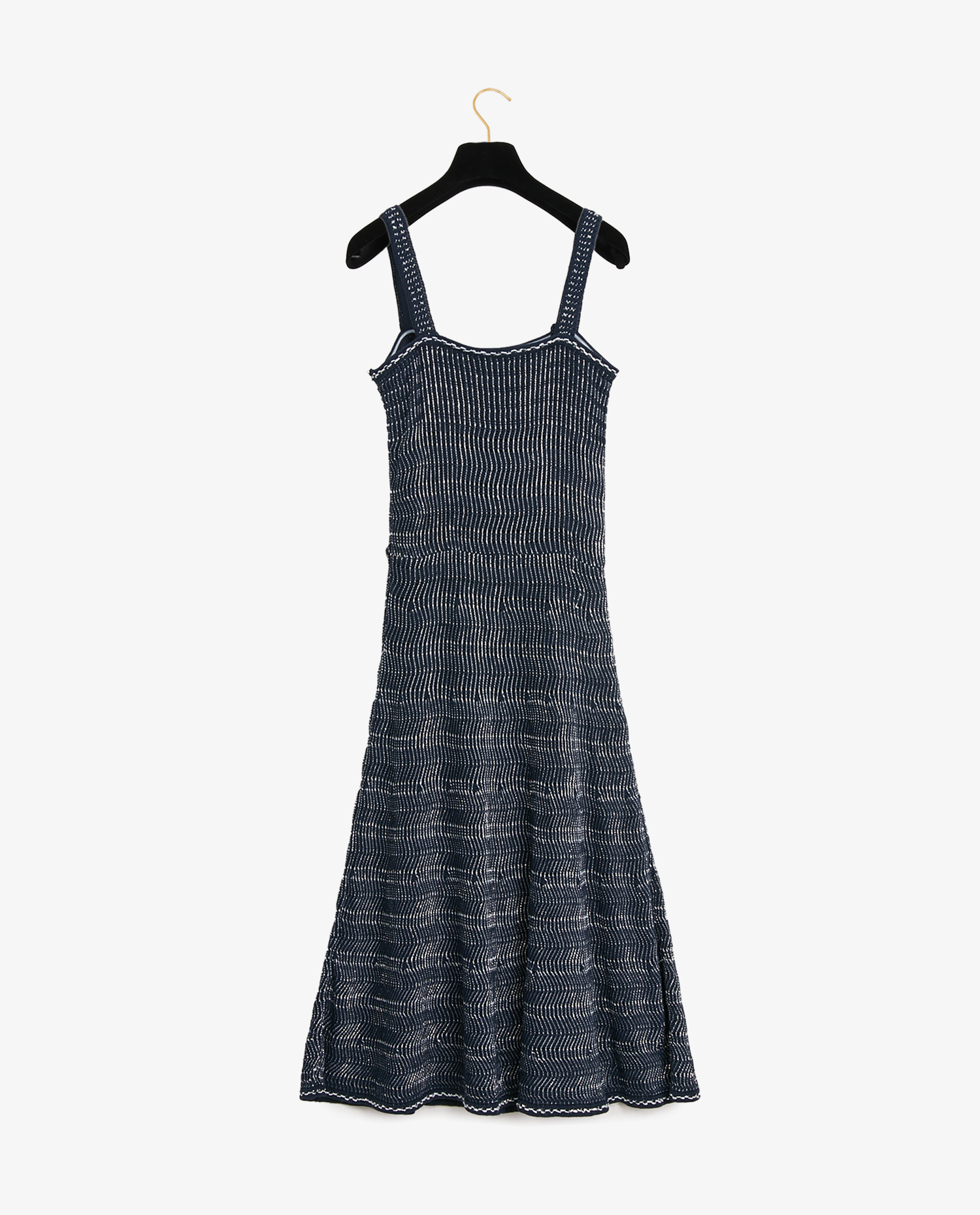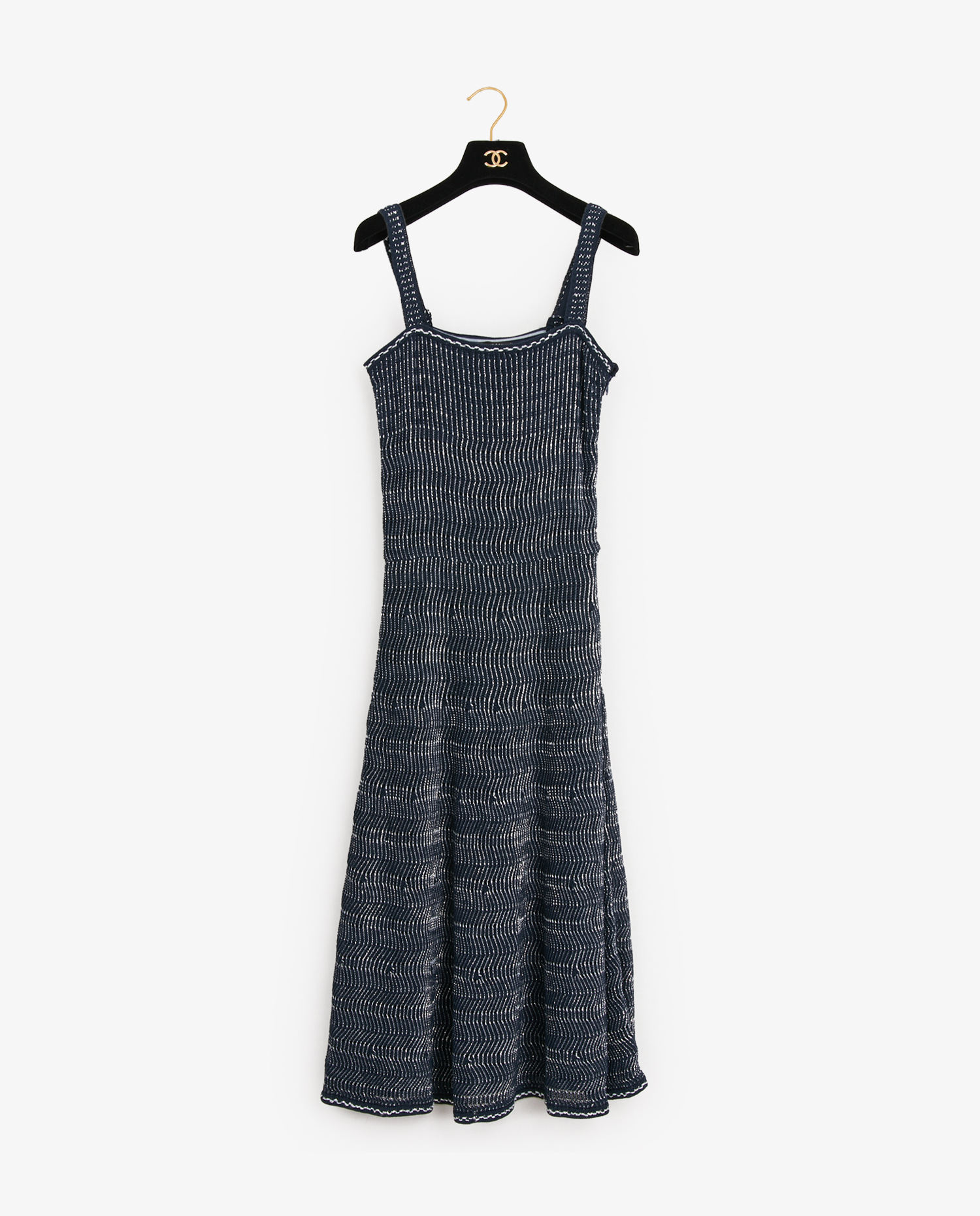 Chanel long dress in navy blue cotton and silver thread. The lining is in silk of the same color. Size 36. Side zipper closure. It is curved at the bust and ruffled at the bottom. In very good condition.