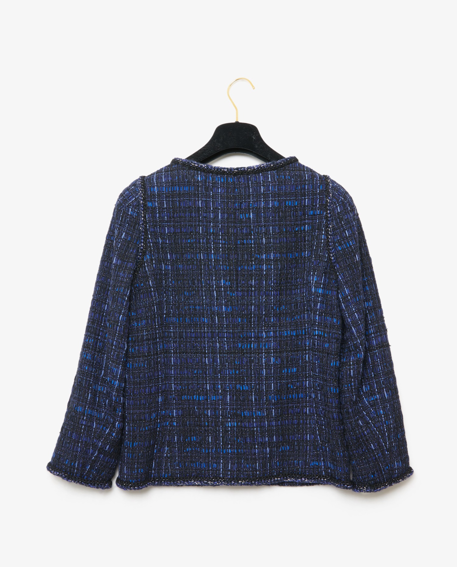 Chanel tweed blue jacket. Size 38. Closes with small hooks for a hidden effect. Black silk lining. In very good condition.