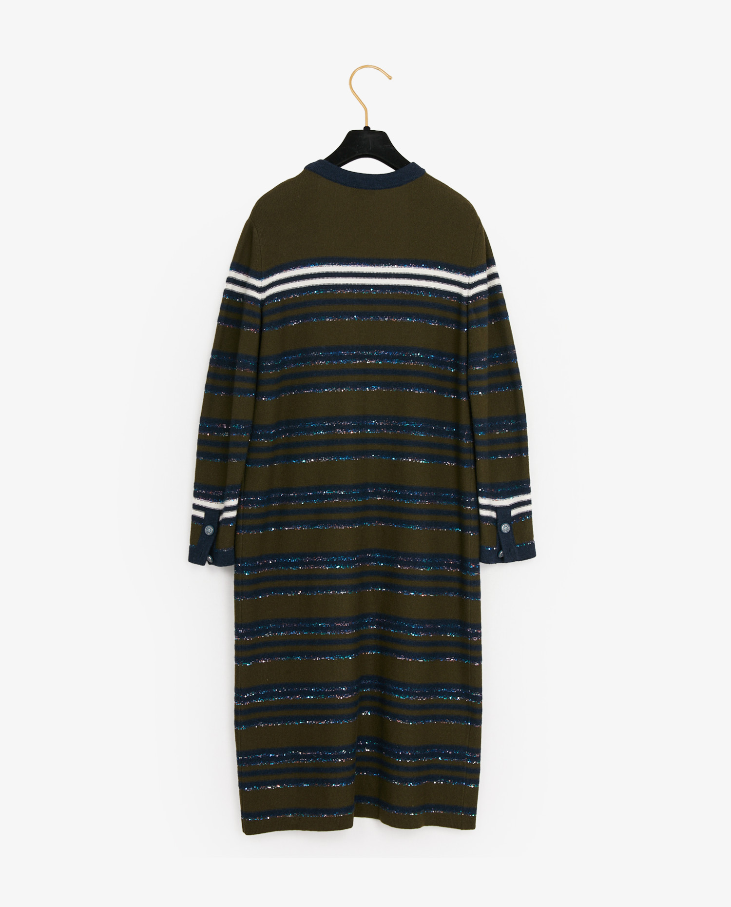 Chanel long cardigan in khaki, white and navy blue striped cashmere. Sequins are embroidered. V-neck. Size 38. In very good condition.
