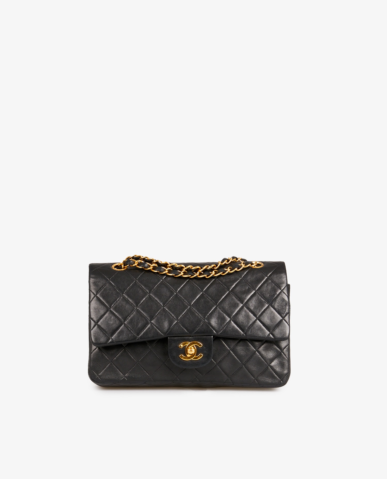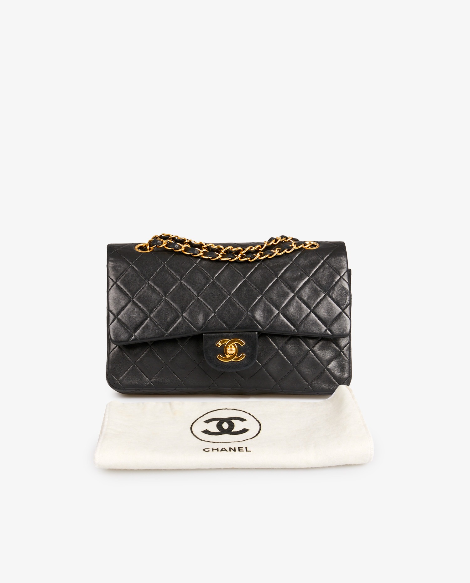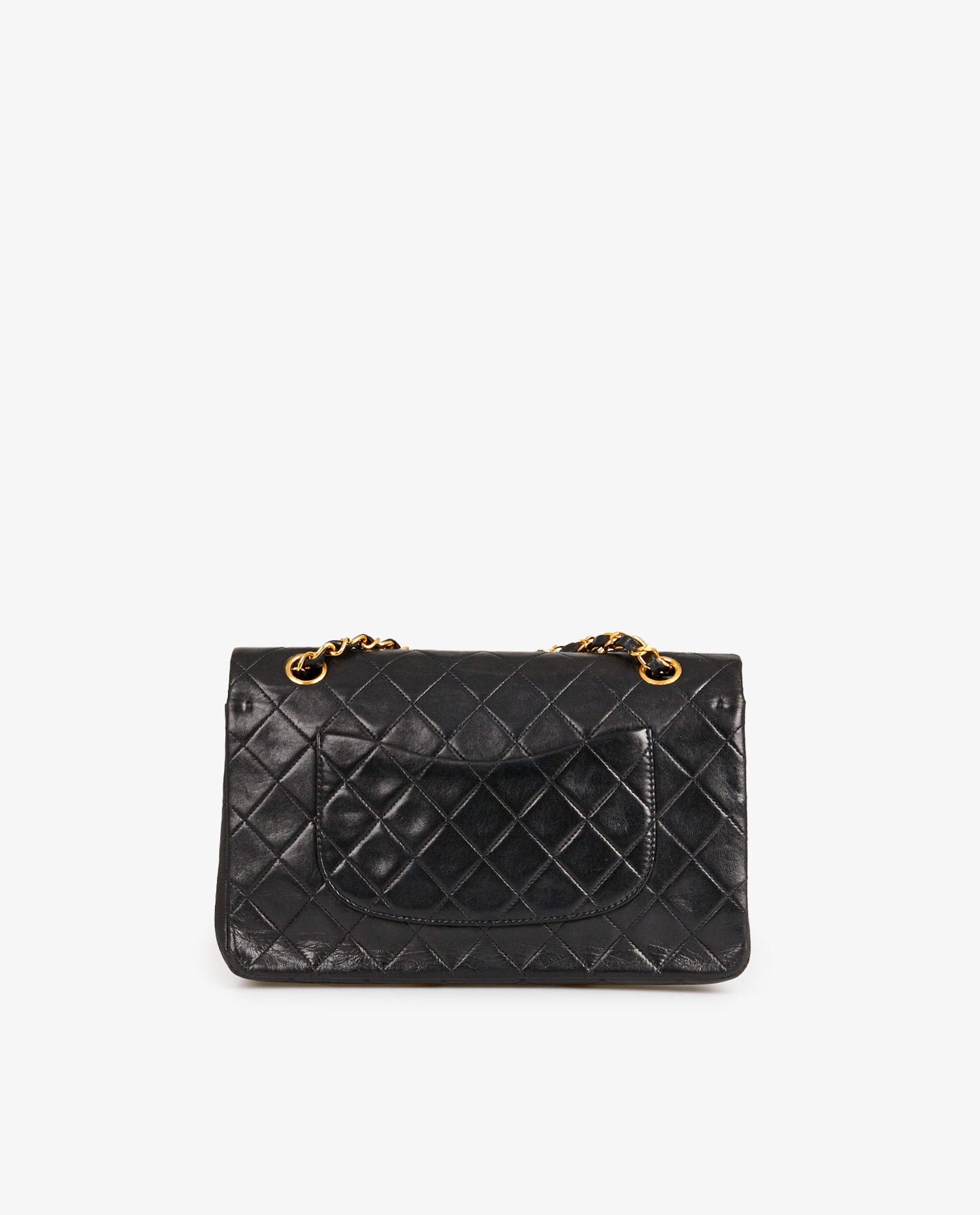 Vintage Chanel double flat in black quilted lambskin. Golden jewelry. The interior is in burgundy leather. Carried over the shoulder or crossbody (91cm). In very good condition.