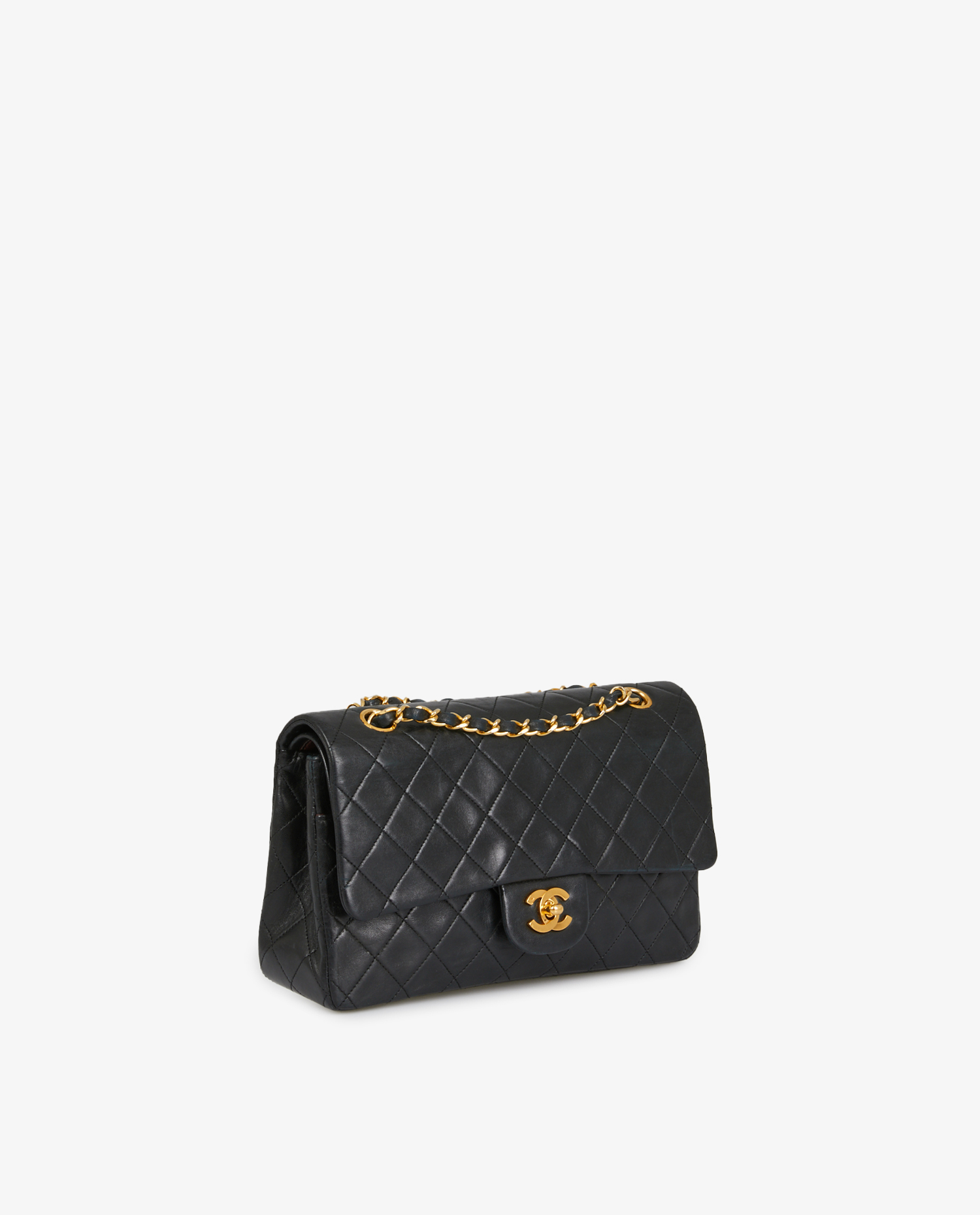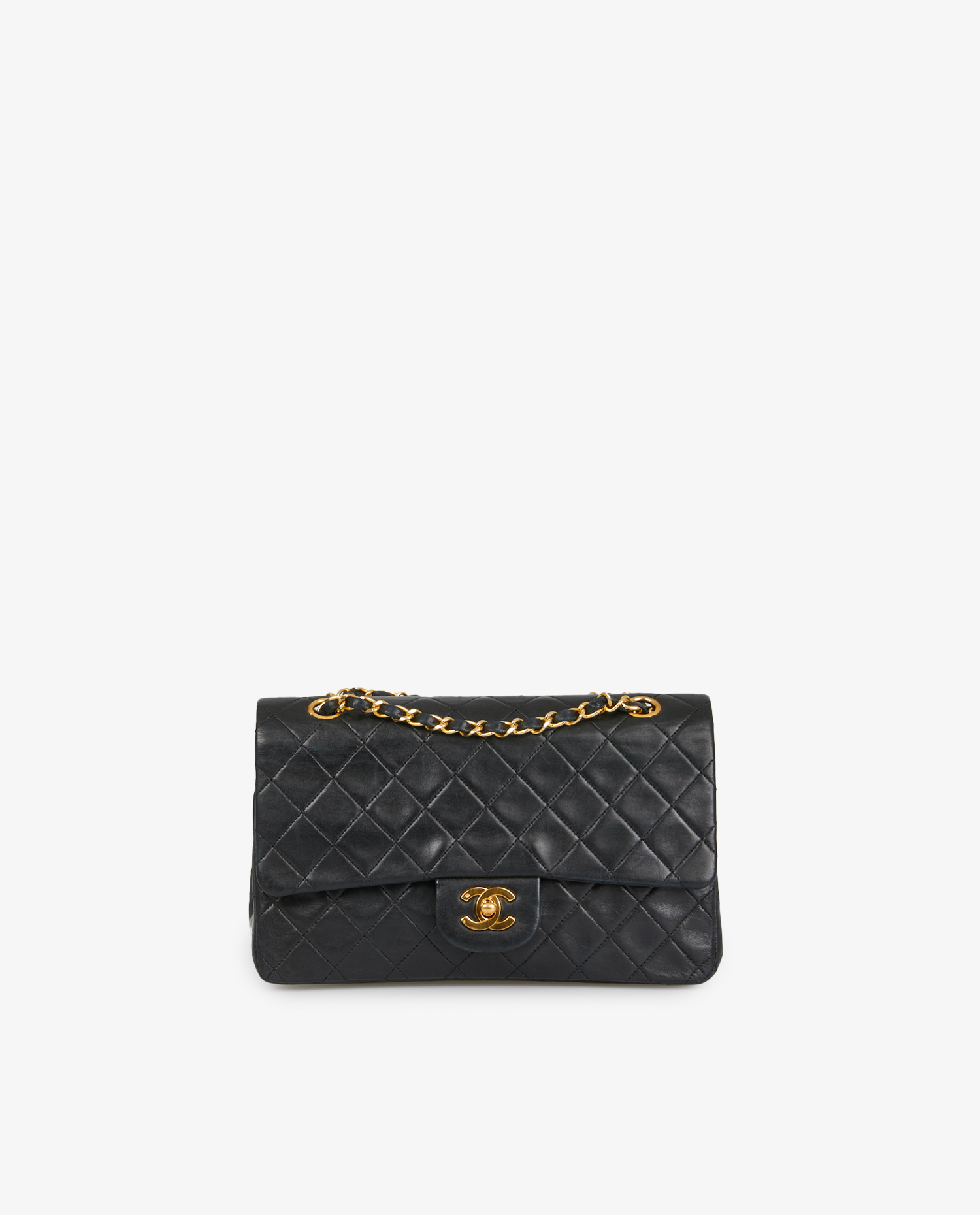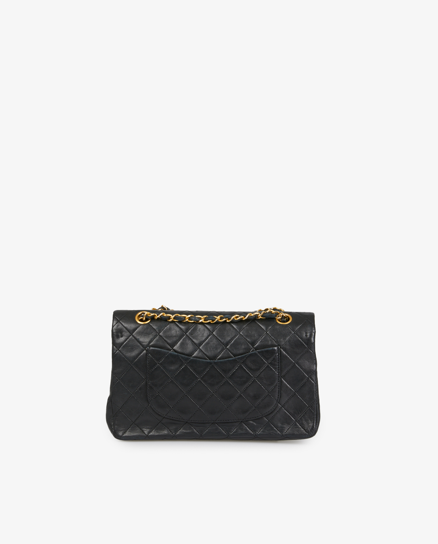 Vintage Timeless Chanel bag in black lambskin. Carried on the shoulder (86cm). Double flap. Golden jewelry. In very good condition.