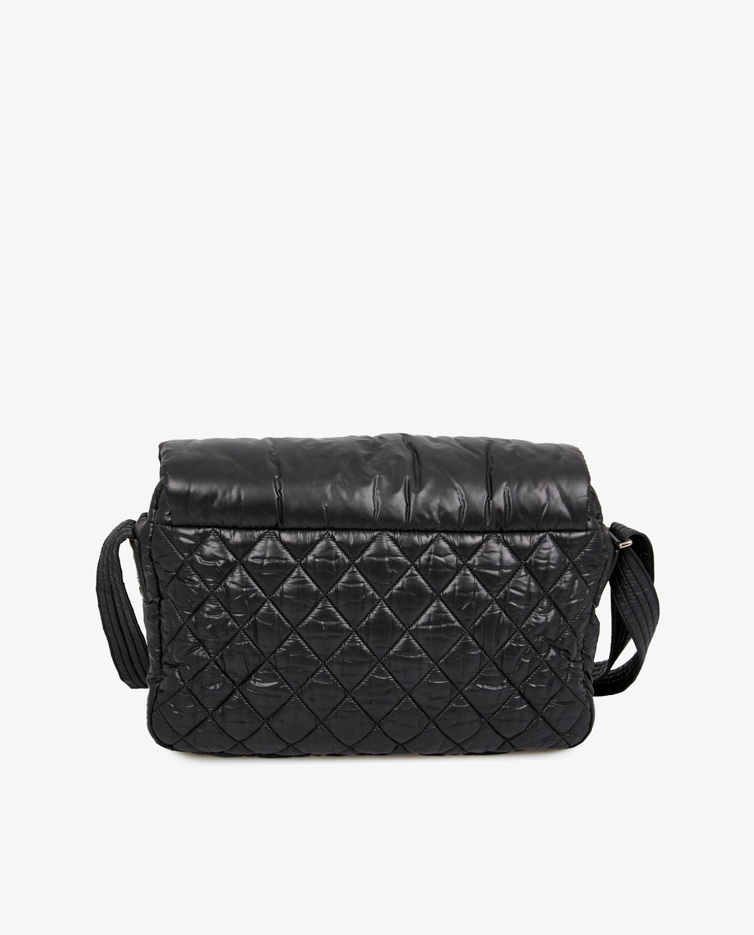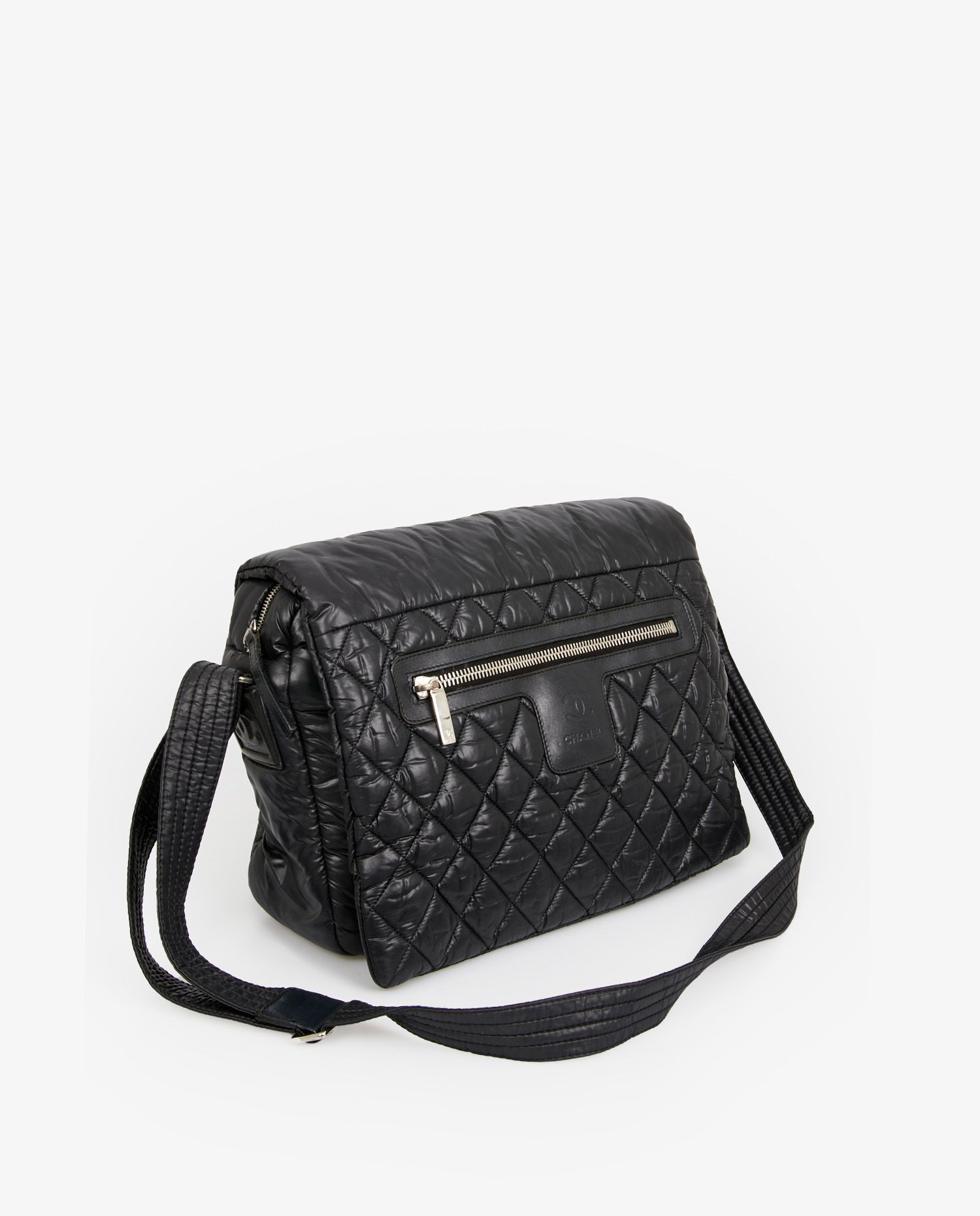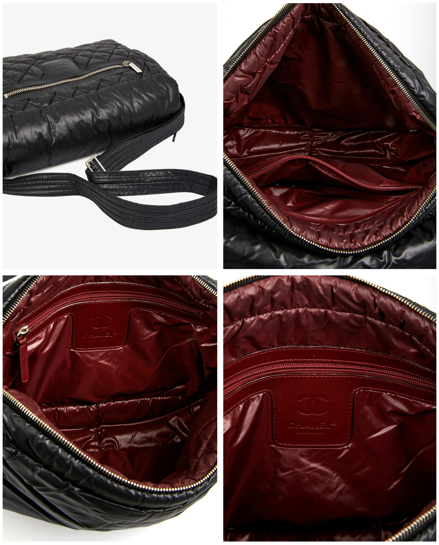 Coco Cocoon Chanel bag in black quilted waterproof canvas. Carried on the shoulder or with an adjustable shoulder strap. The interior is in burgundy canvas with a zipped pocket. Perfectly sized for a computer and documents. Silver zipper closure. In very good condition.
