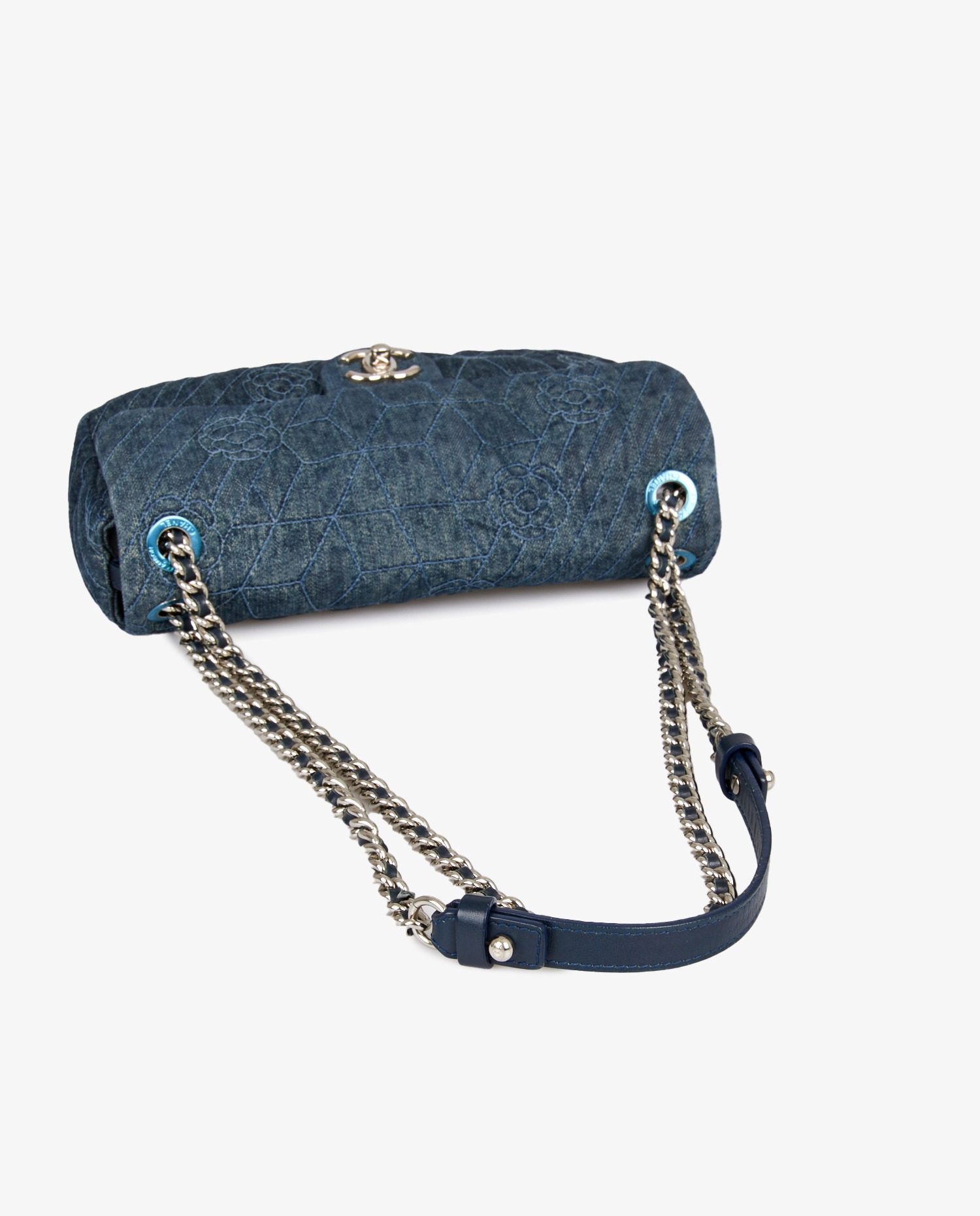 Chanel Classic denim bag. Silver jewelry. Carried on the shoulder or across the body (112cm). Blue fabric interior with 1 zipped pocket. In very good condition.