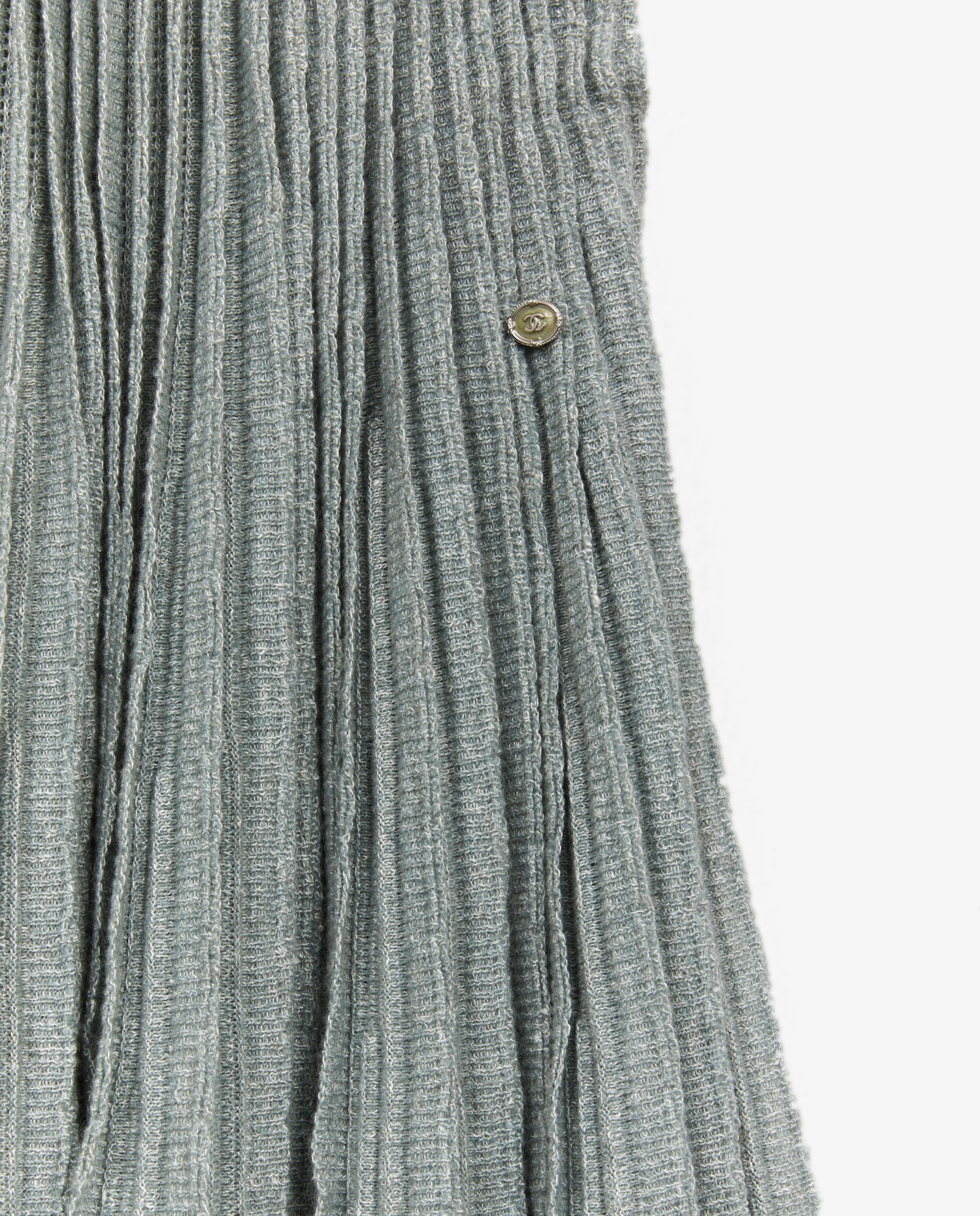 On the outside, the dress is made entirely from a fine ribbed cashmere knit that hugs the body without constricting it. Its soft, slightly fluffy texture is particularly pleasant to wear next to the skin. The skirt gently flares out from the hips thanks to wide, structured pleats, bringing fluidity and elegance to every movement. Inside, there’s no need for a lining: the quality of the knit ensures a perfect fit and optimum comfort.
