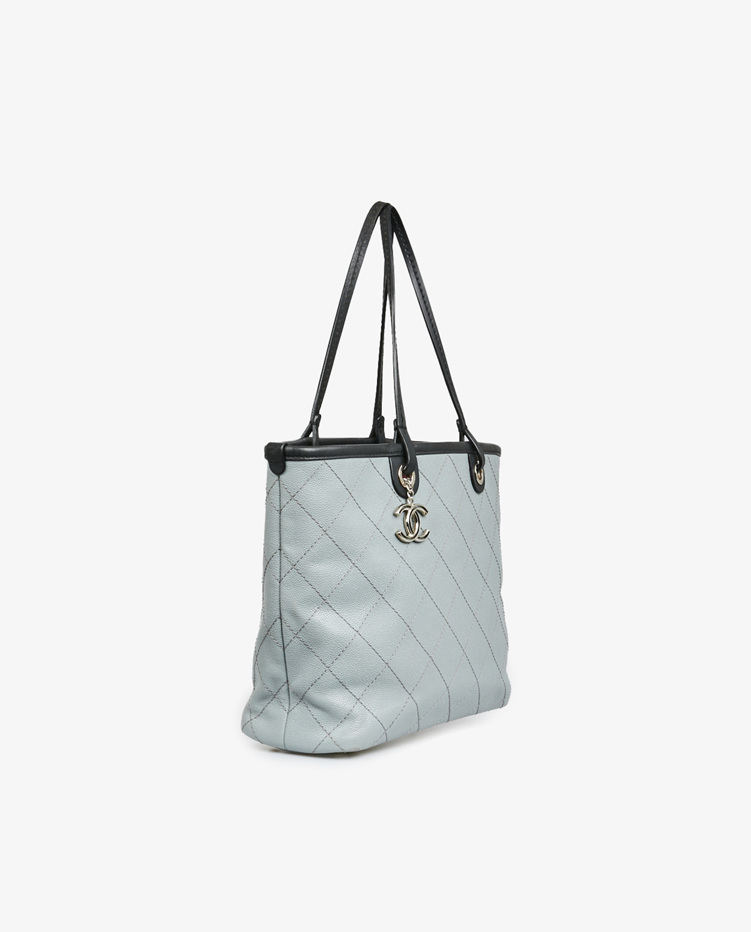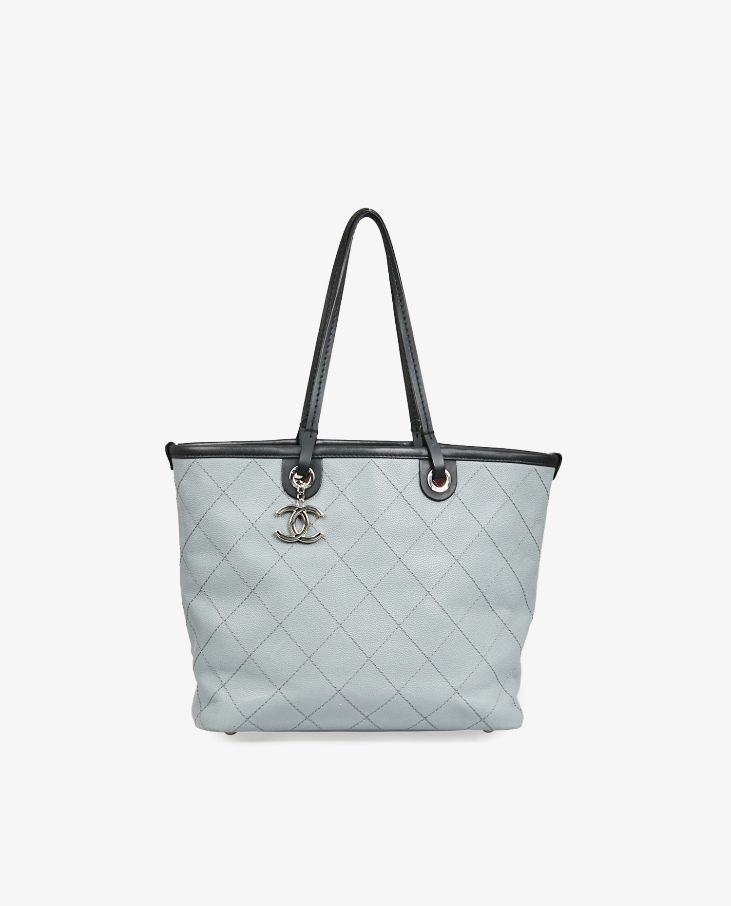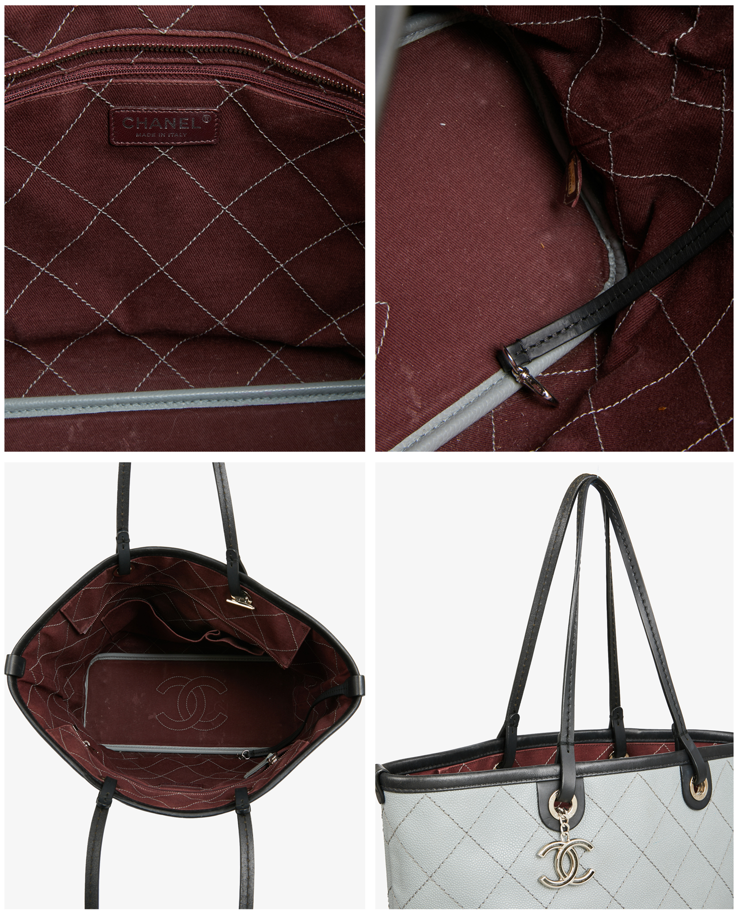 Chanel tote bag in two-tone pearl gray and black grained leather. The interior is in burgundy fabric with a large zipped pocket. Carried on the shoulder. In very good condition.
