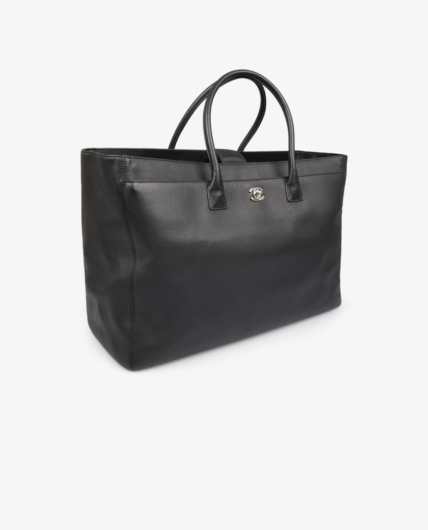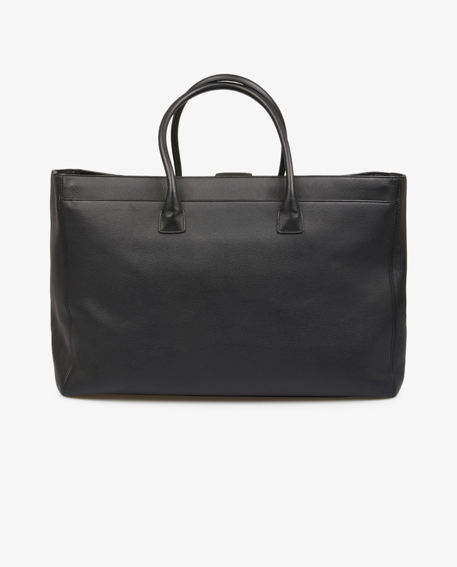 Large Chanel bag in black grained leather. Hand-carried with two handles or over the shoulder. The interior is in black fabric. In very good condition.