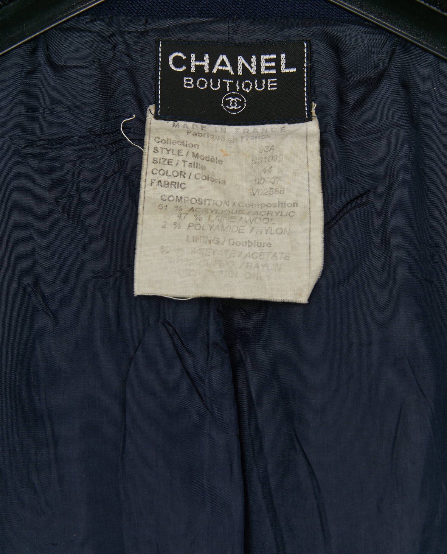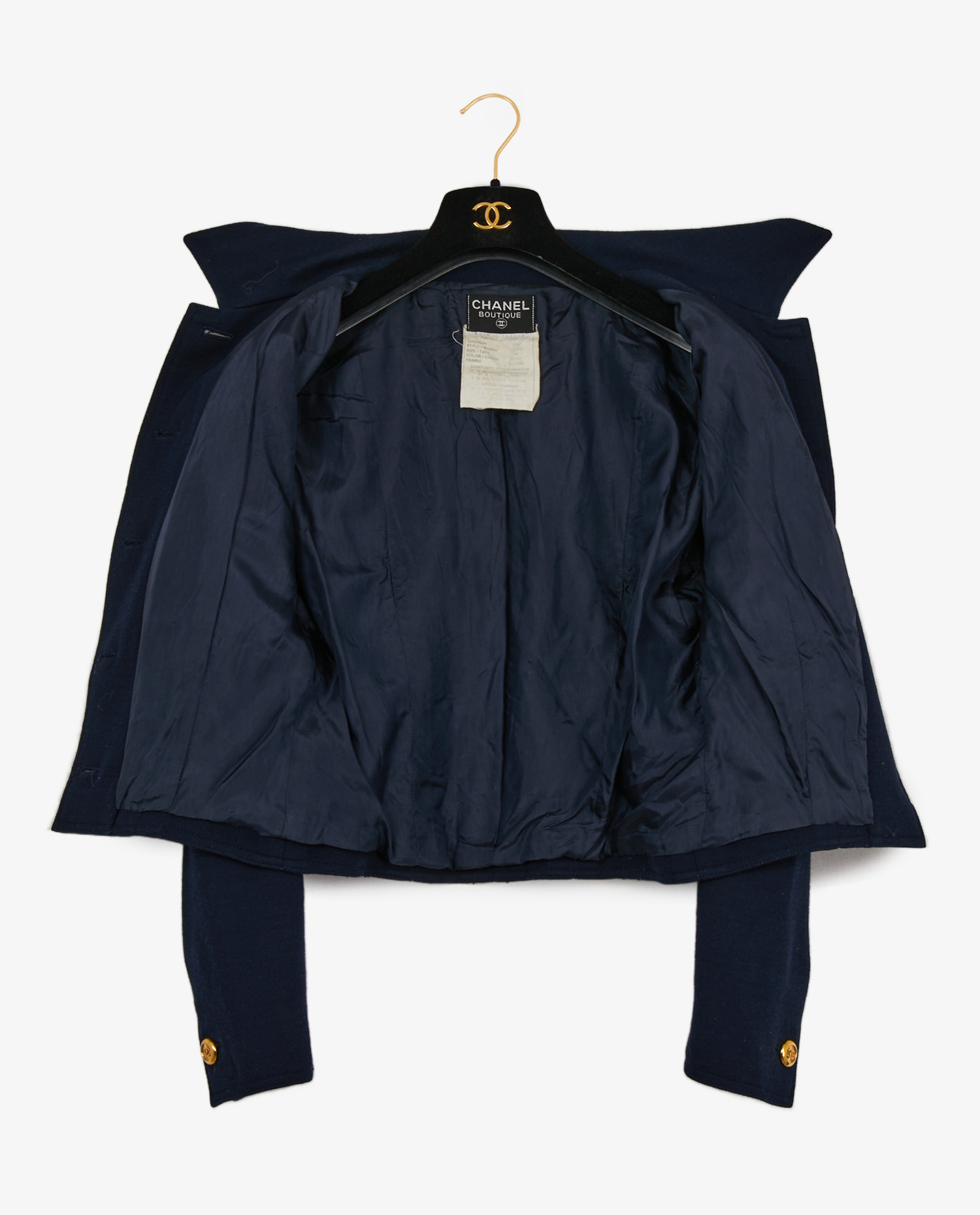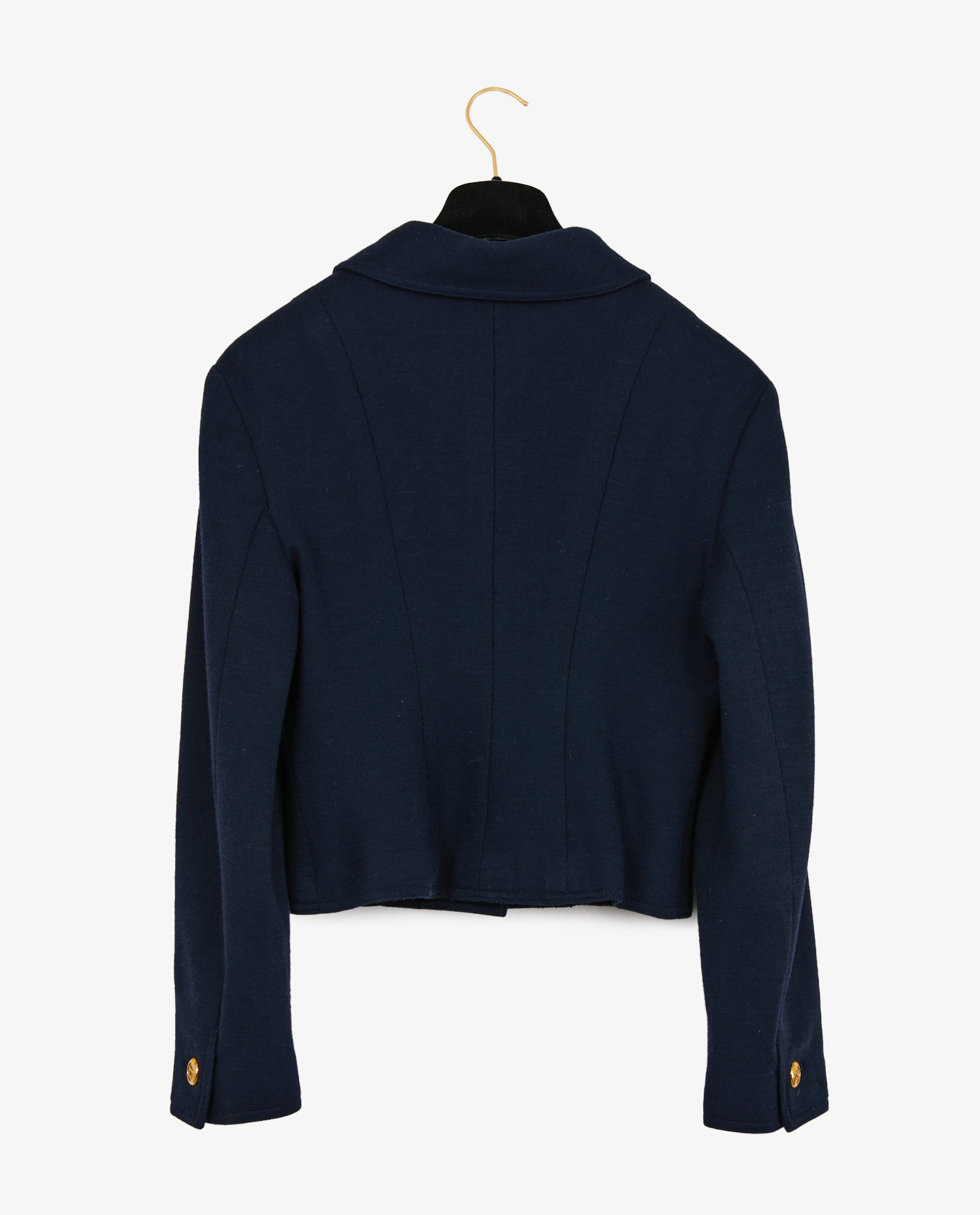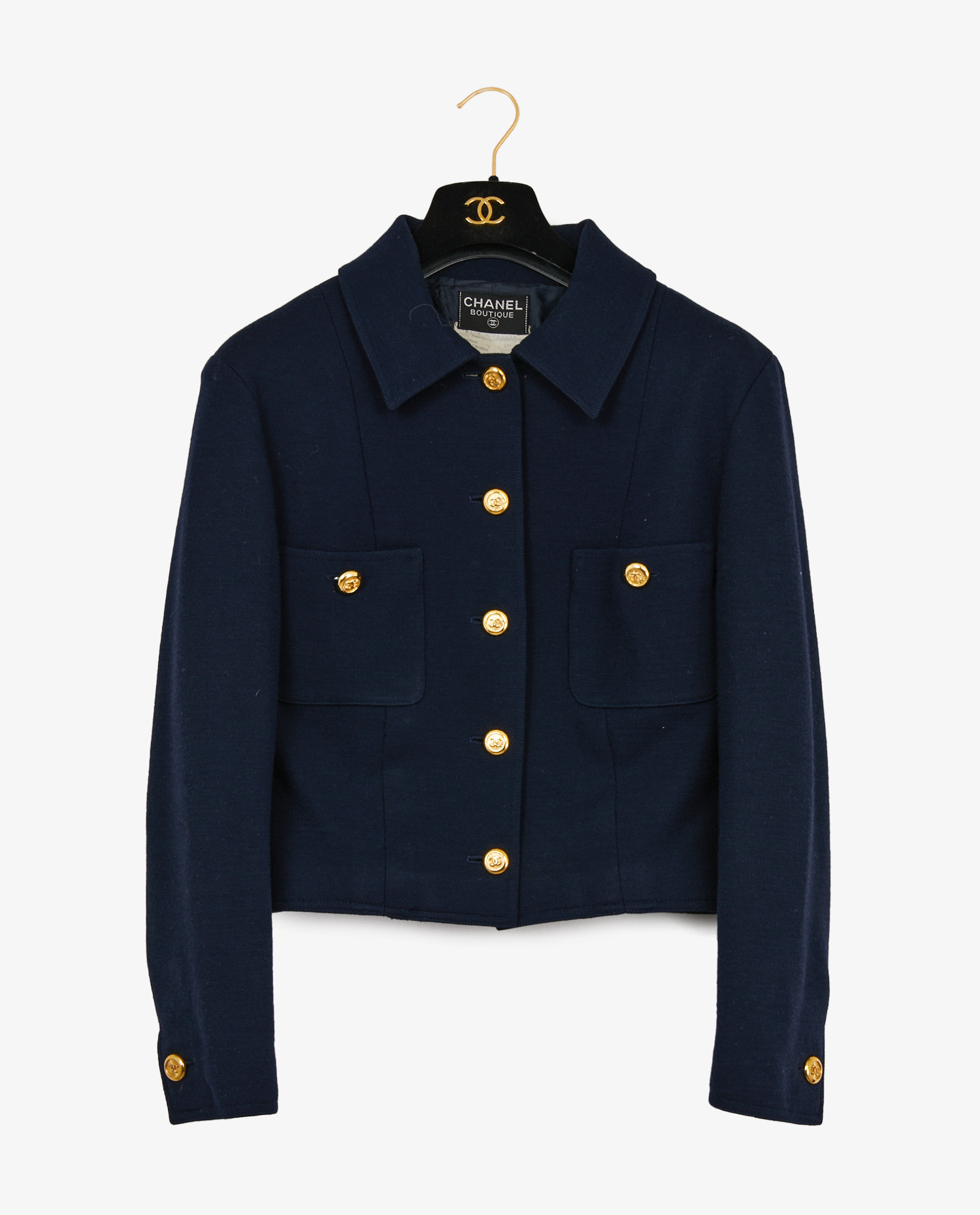 Vintage Chanel short jacket in navy blue wool, from the Autumn/Winter 1993/94 “Boots and white shirts” collection. A structured piece with a slightly boxy cut, typical of the ’90s, that highlights the shoulders while drawing a graphic silhouette. Lined in silk, the jacket features two patch pockets on the front, closed by 5 gilded metal Chanel buttons on the back, with the CC logo in relief. These iconic buttons also adorn the pockets and cuffs.
