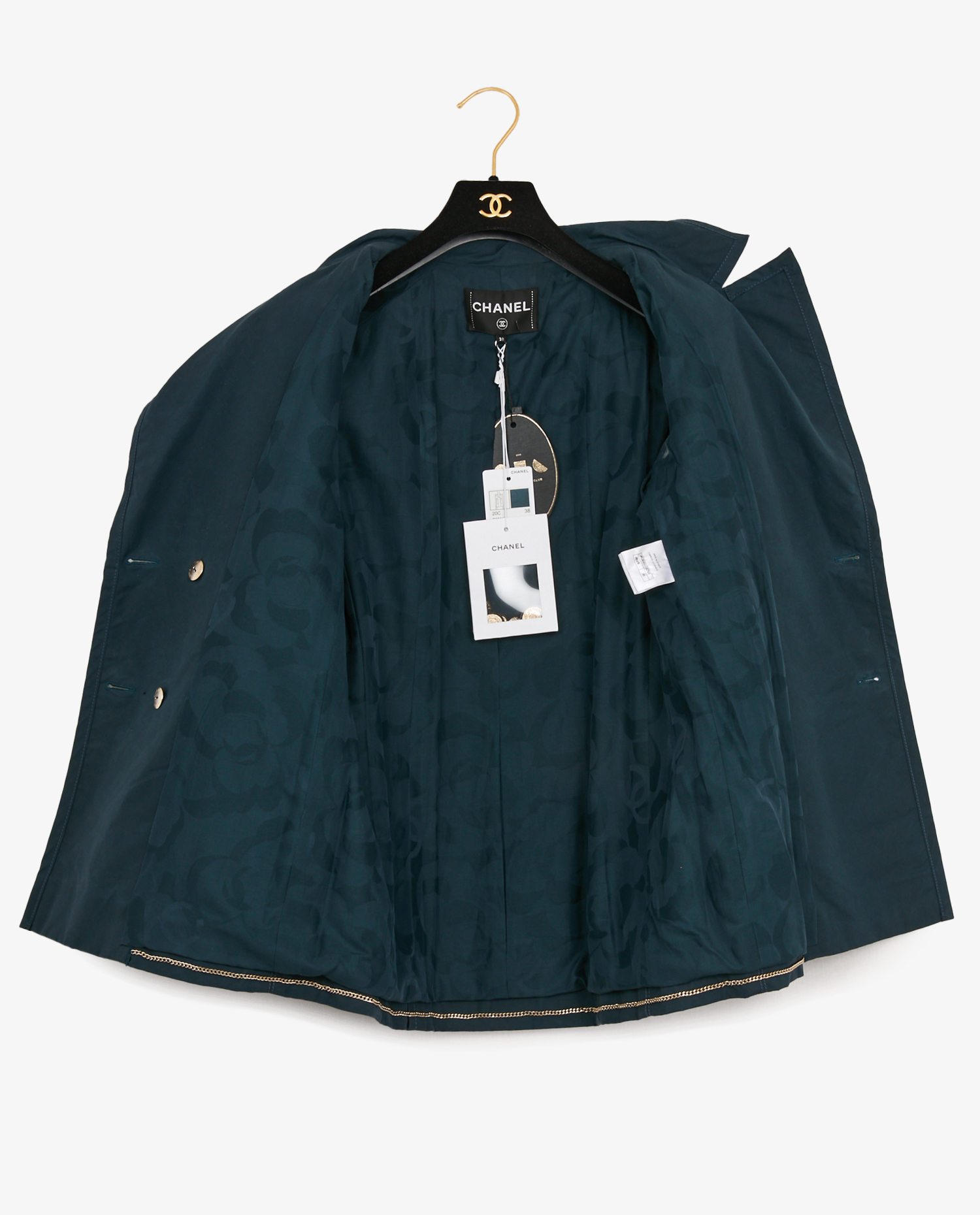 Chanel double-breasted jacket in navy blue crinkled cotton. The buttons are pale gold. It has 4 spare buttons. 4 front patch pockets. Size 38. New condition. The label is always present. From sales.