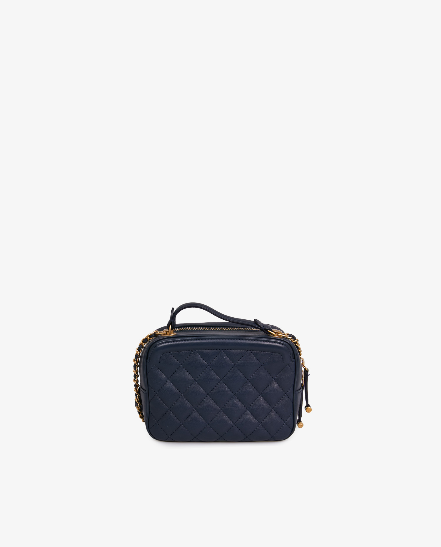 Small Chanel Vanity bag in navy blue calf leather. The jewelry is matte gold. Worn on the shoulder or crossbody. Zippered closure. This bag offers ample storage space inside, with a fabric lining and a pocket on the front and back. In very good condition. It will be delivered in an Old Fashioned Club pouch.