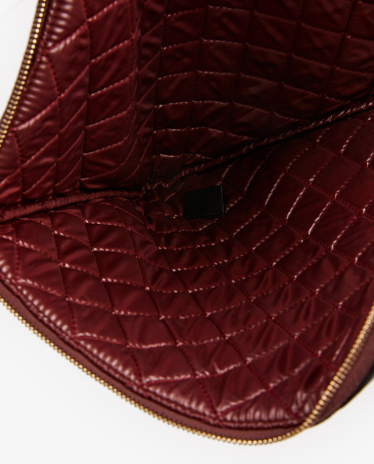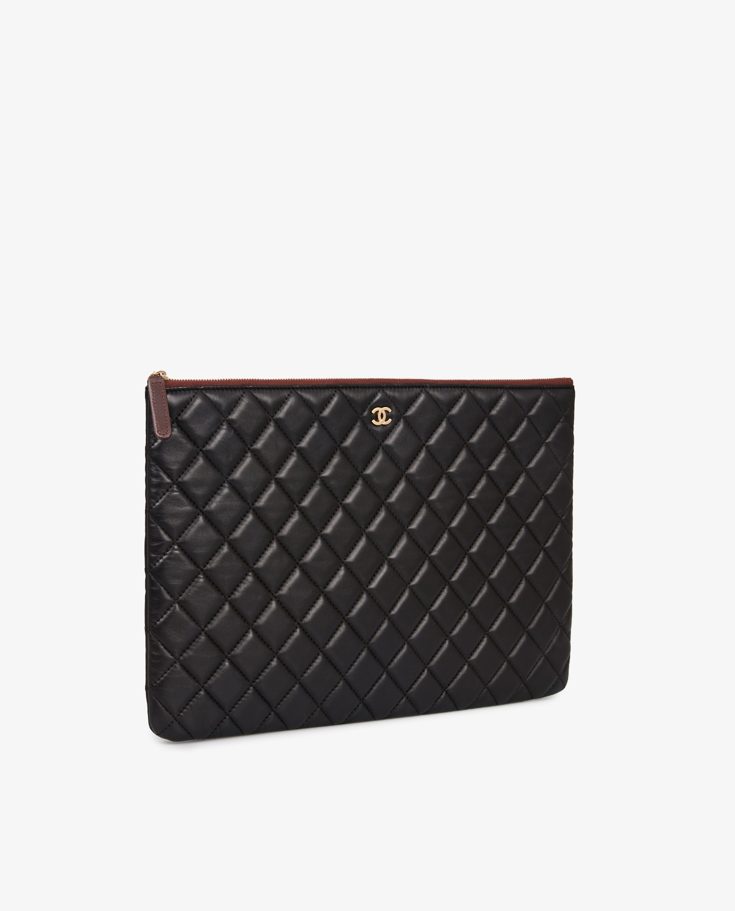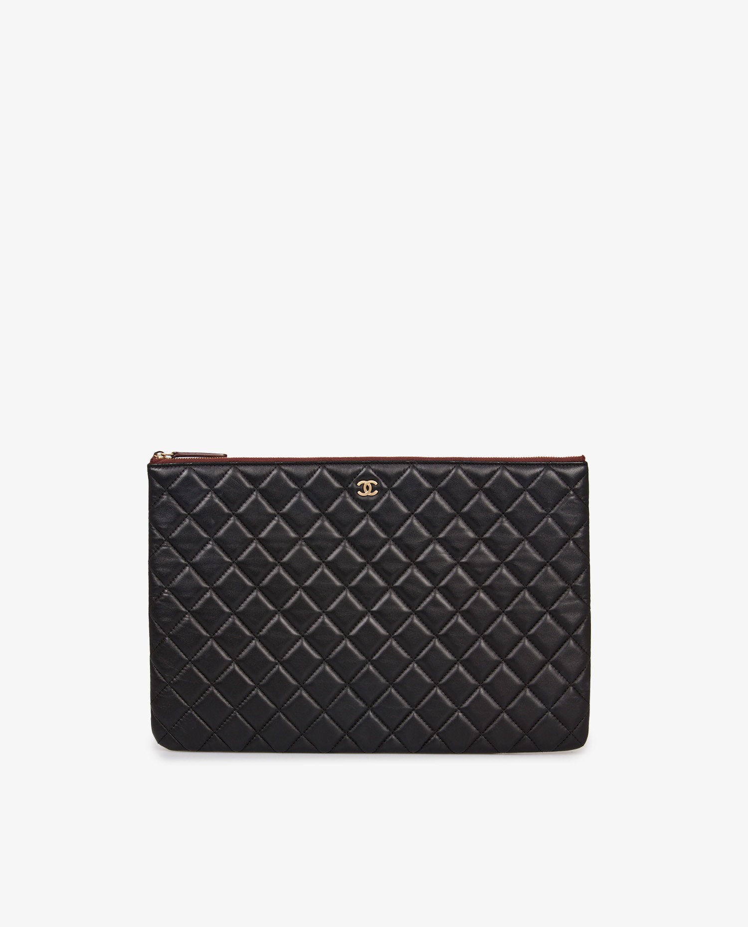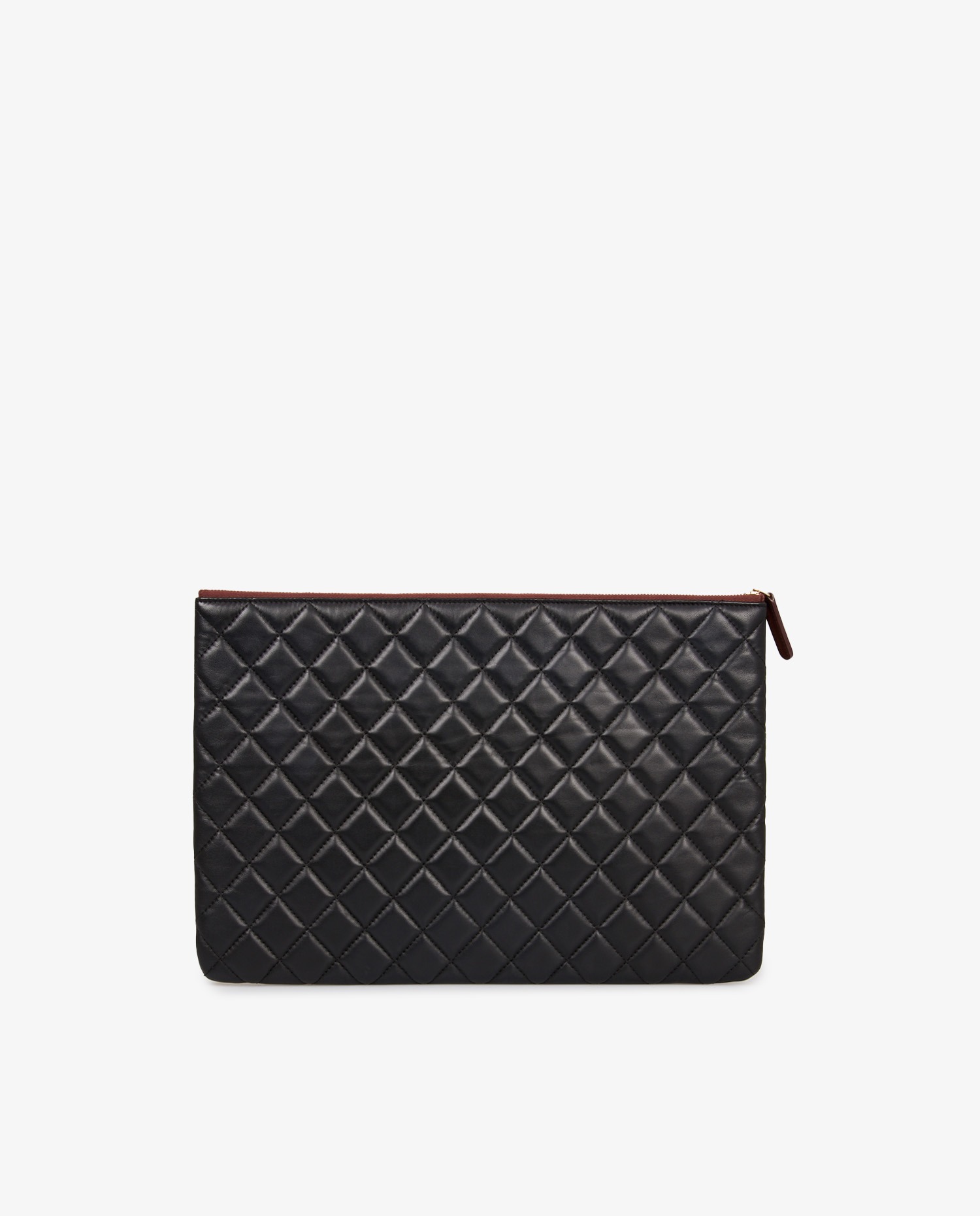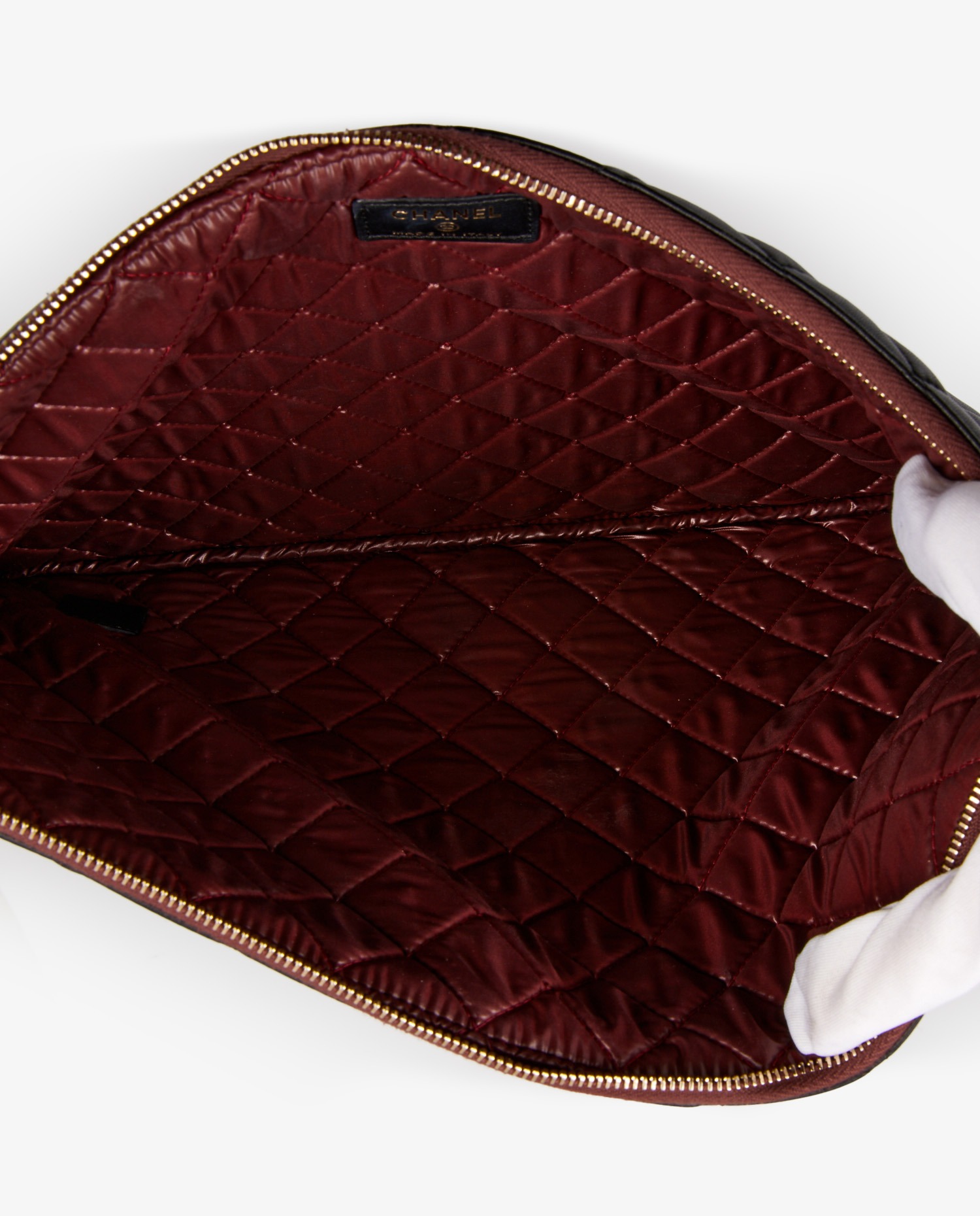 Chanel clutch bag in black quilted leather. The interior is made of burgundy waterproof material. In very good condition.