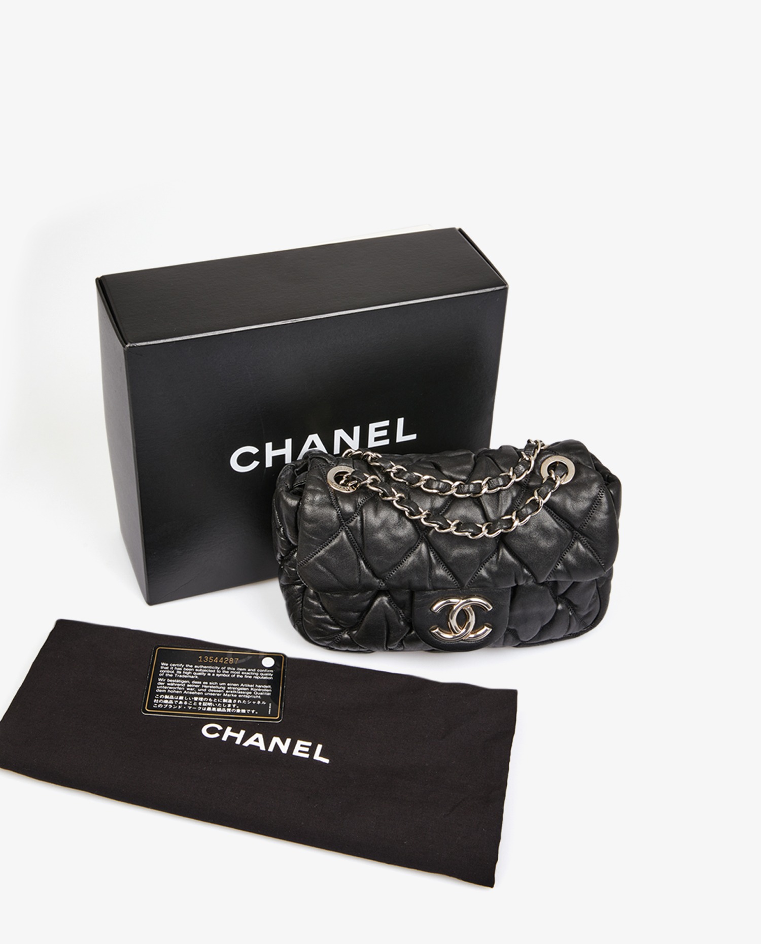Chanel mini bag in quilted lambskin. Silver jewelry. Snap closure. The interior is in gray fabric. Carried on the shoulder or crossbody. The shoulder strap measures 124cm. In very good condition.