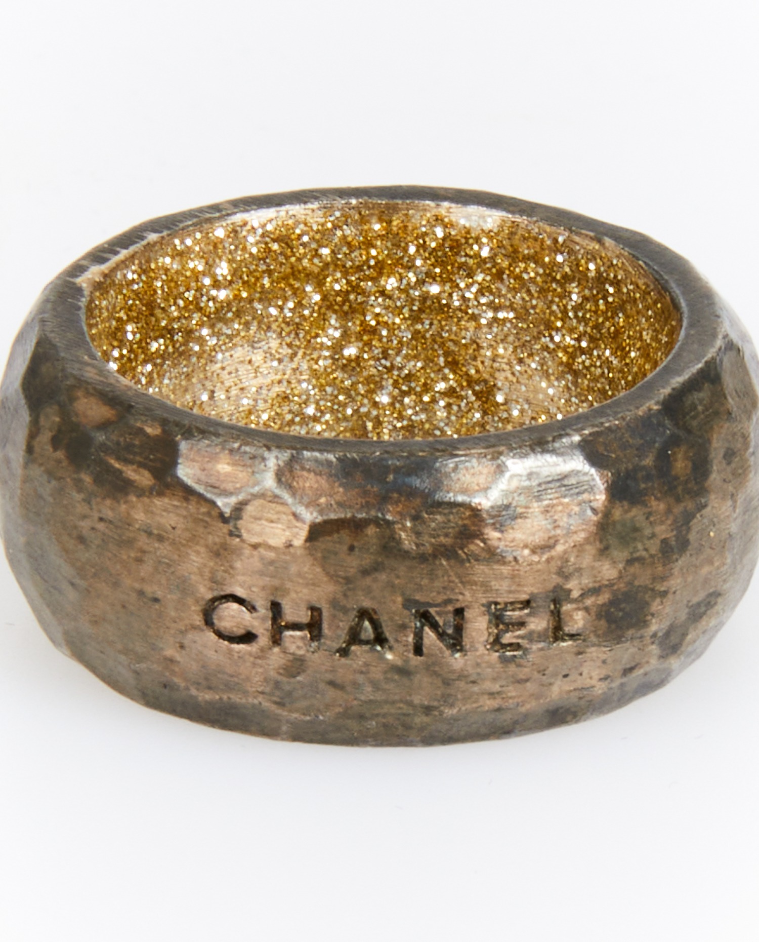 Chanel ring in bronze-colored hammered metal, rhinestone interior. Size 52. In very good condition.