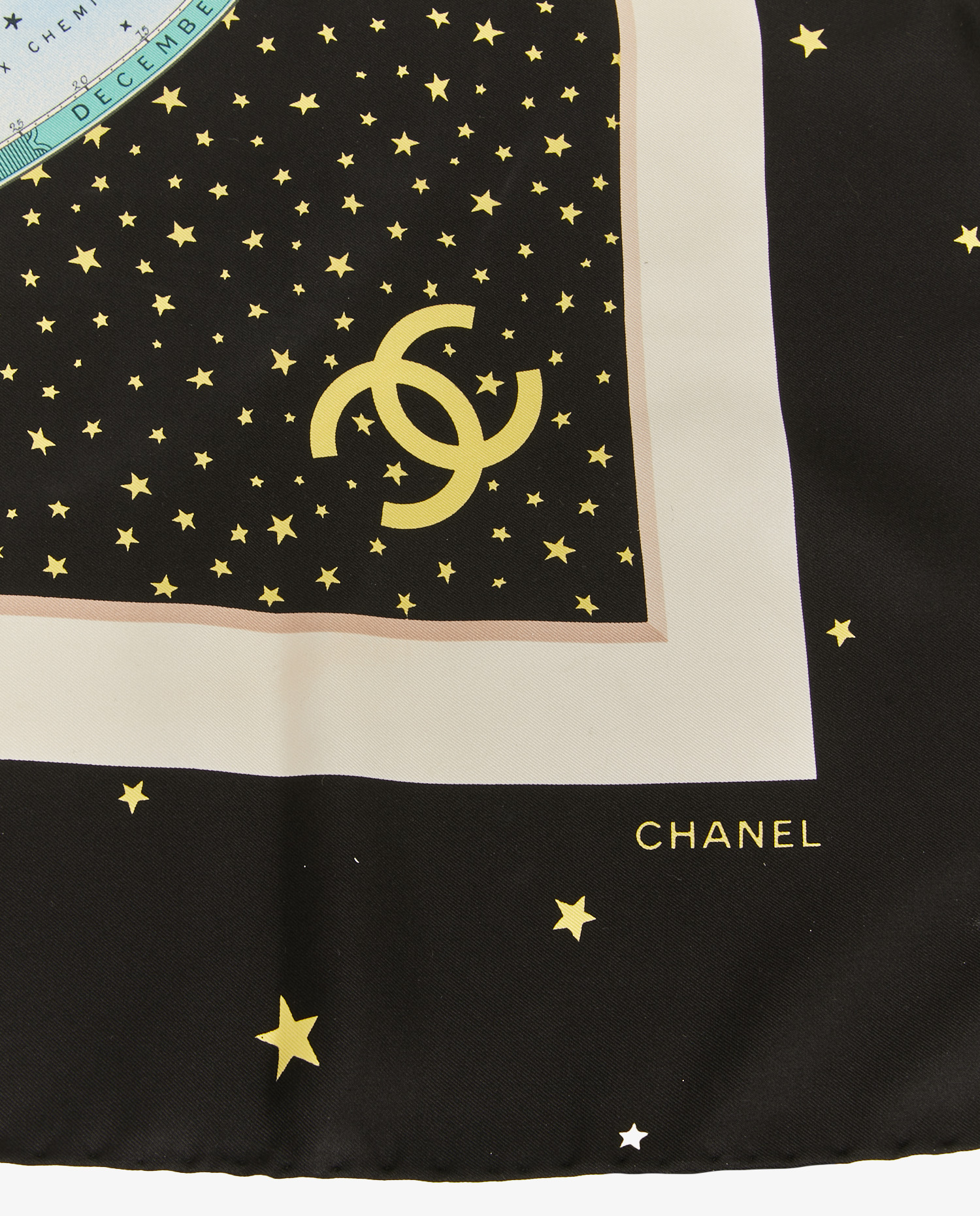 Astral-themed Chanel silk square in midnight blue with gold stars. The initials “CC” are on each corner. In very good condition.