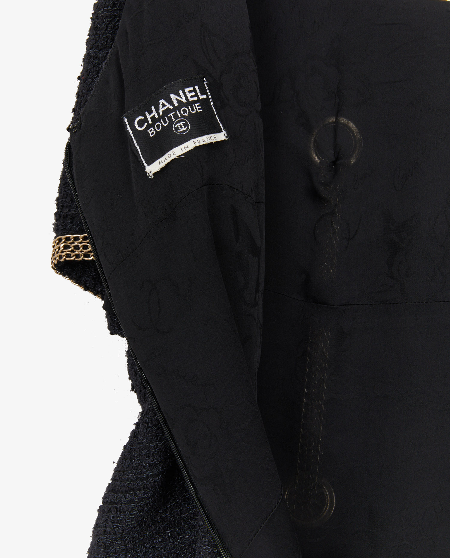 Chanel navy blue tweed dress from the “Nuits d’été” Spring-Summer 2008 collection. Silk lining. Pale gold chains. In very good condition.