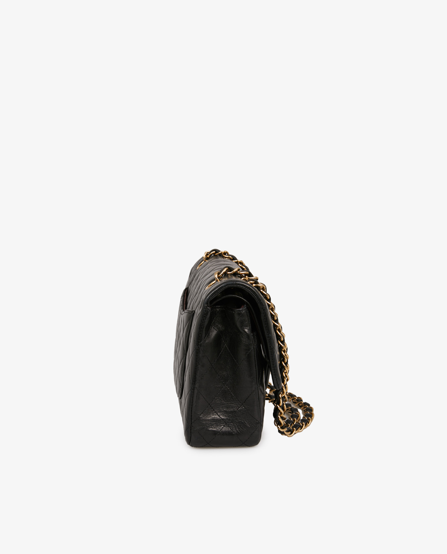 This bag is crafted in black lambskin leather with a supple feel and satin finish, enhanced by Chanel’s signature diamond quilted motif. The jewelry is in gold-tone metal. The sliding chain can be worn double on the shoulder or long cross-body. The back of the bag features a “Mona Lisa” pocket, subtle and functional. Dimensions are approx. 25.5 cm long, 15 cm high and 6.5 cm deep.