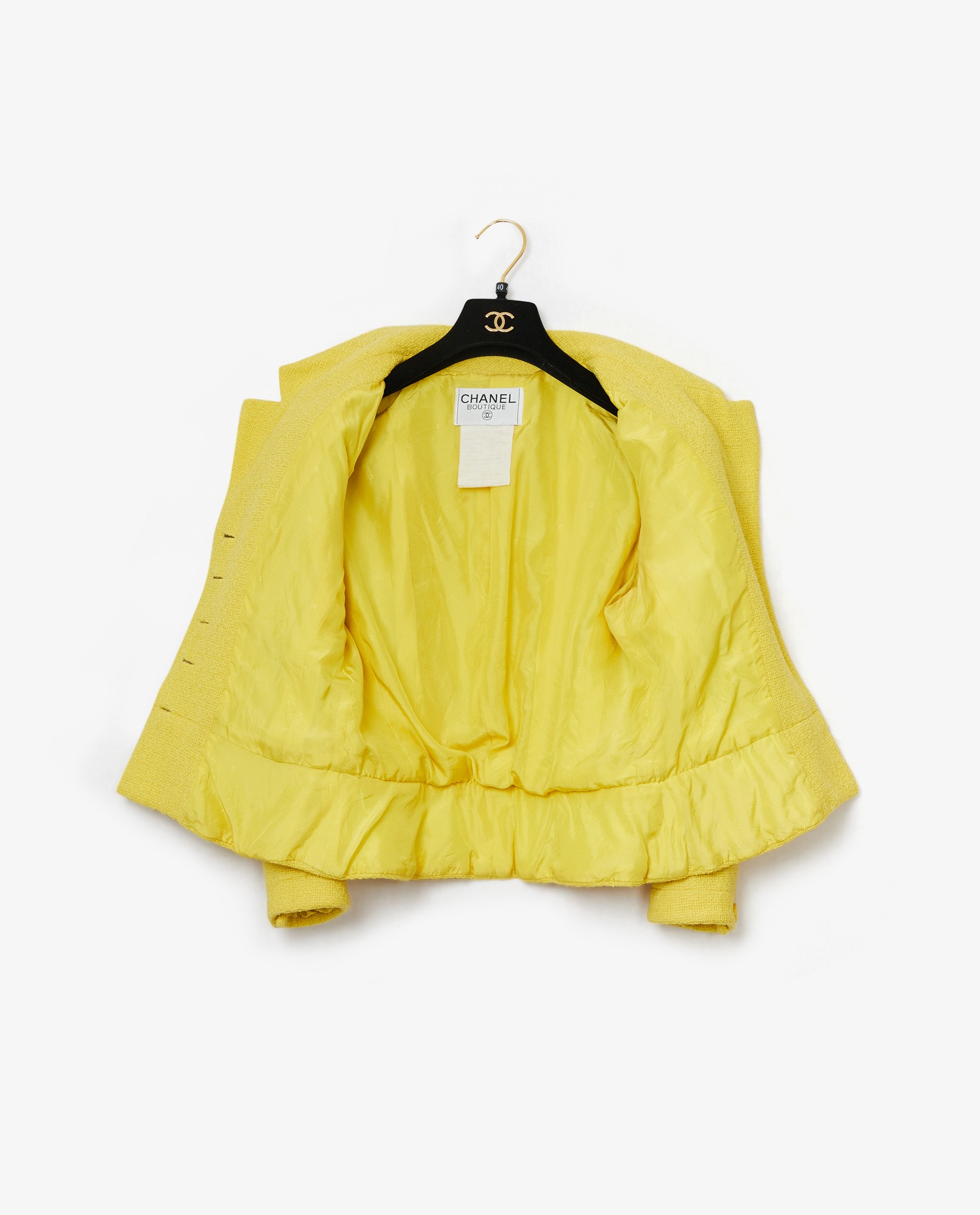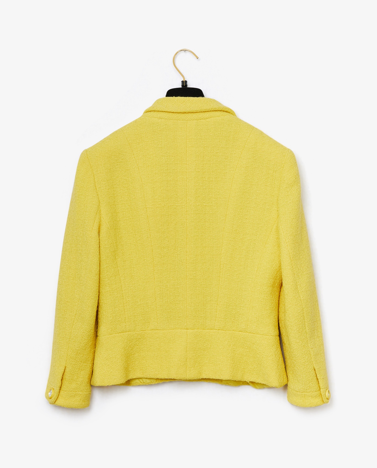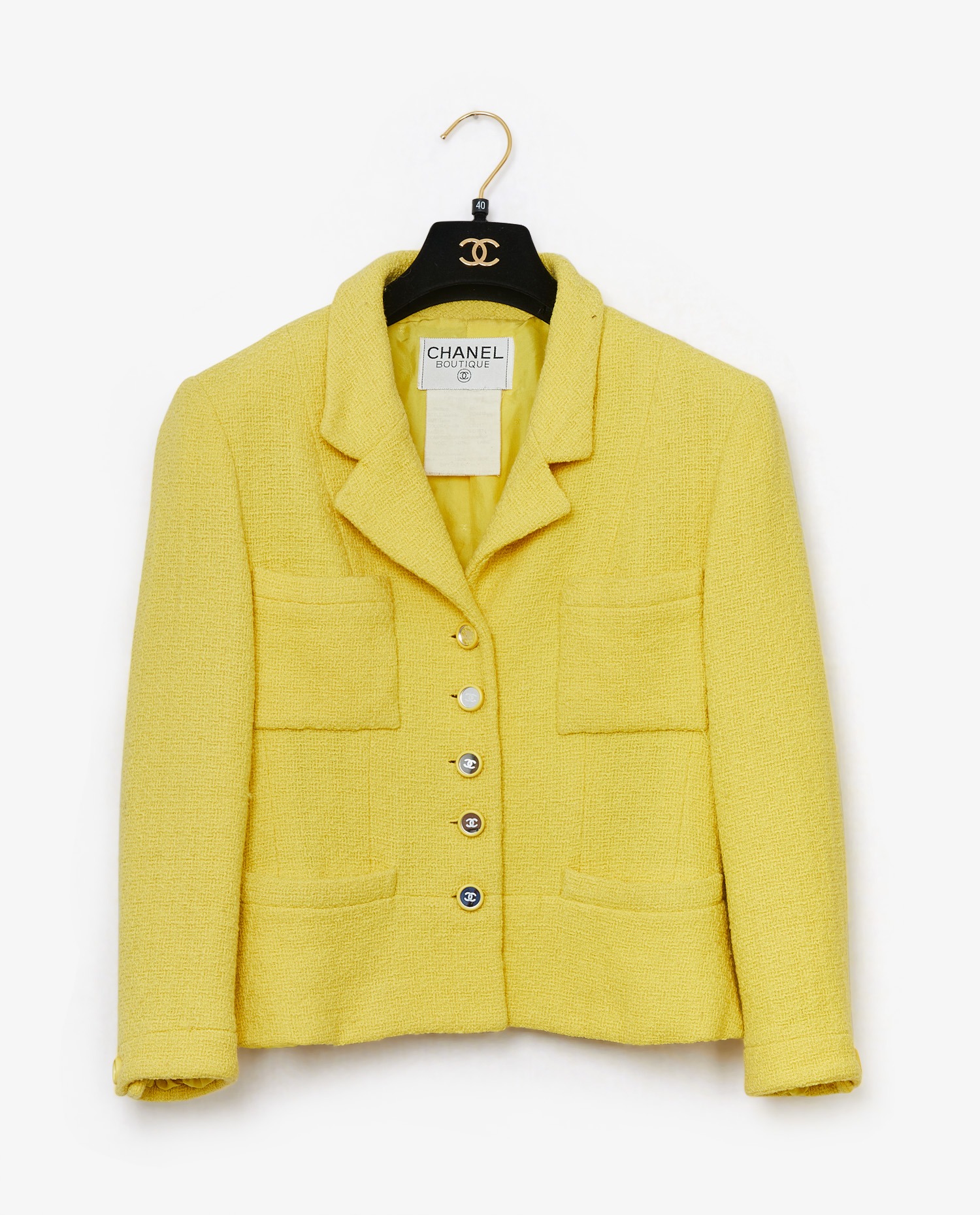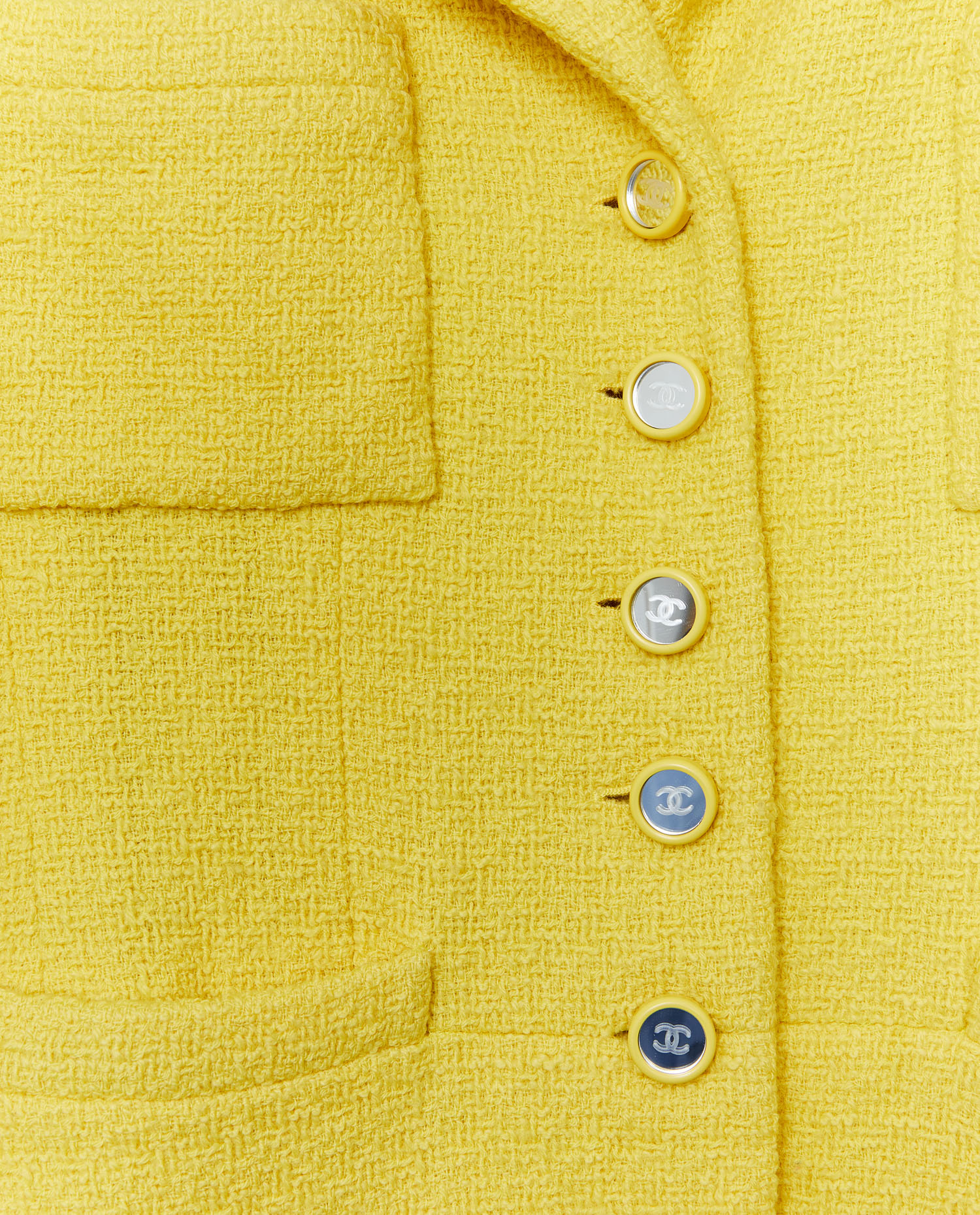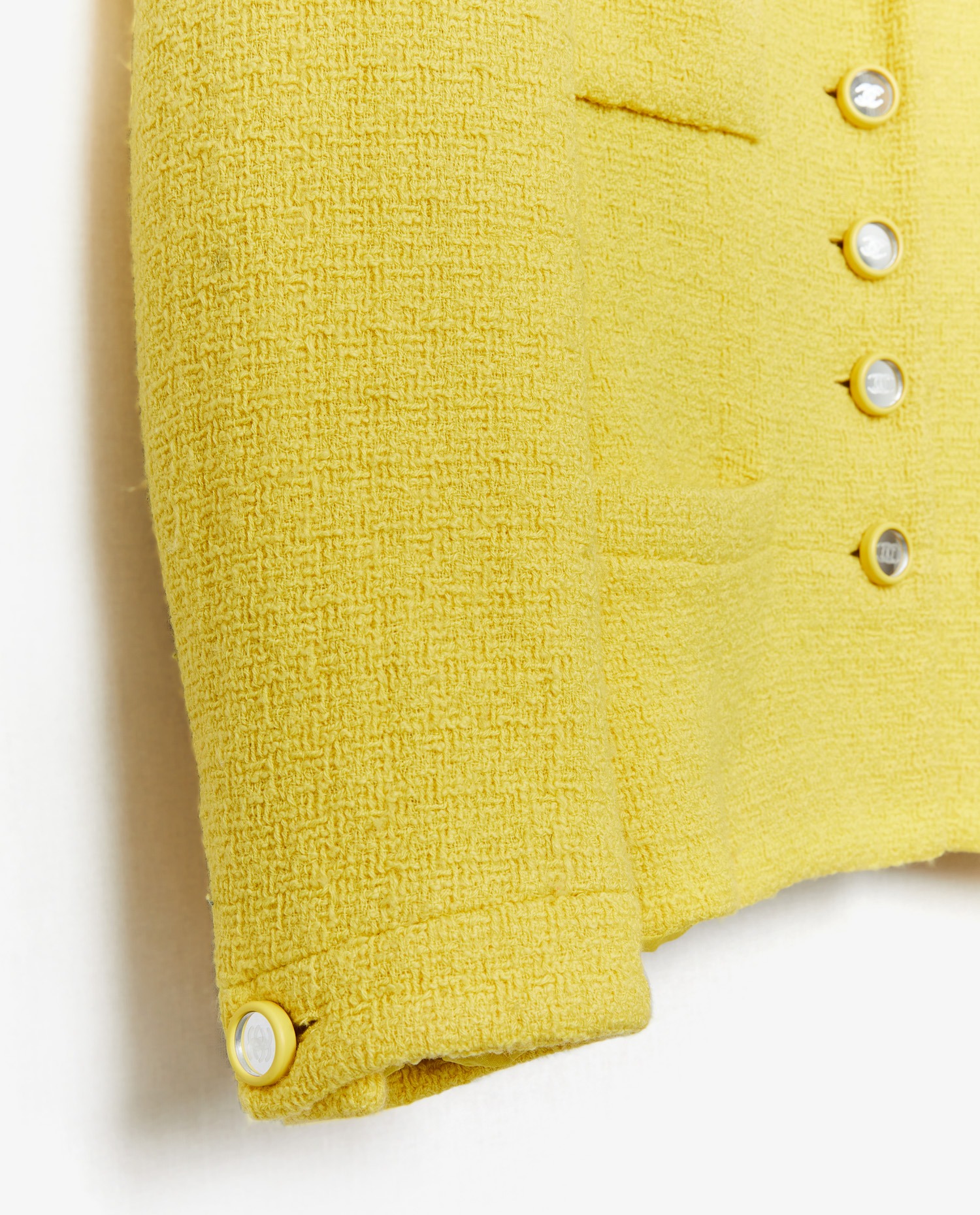 Chanel jacket in lemon-yellow tweed. Size 40. Four front patch pockets. Mirror buttons with a “cc” in the center. In very good condition. Slight wear under the arms.