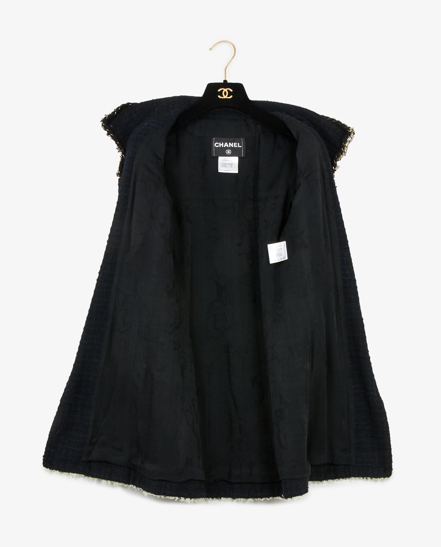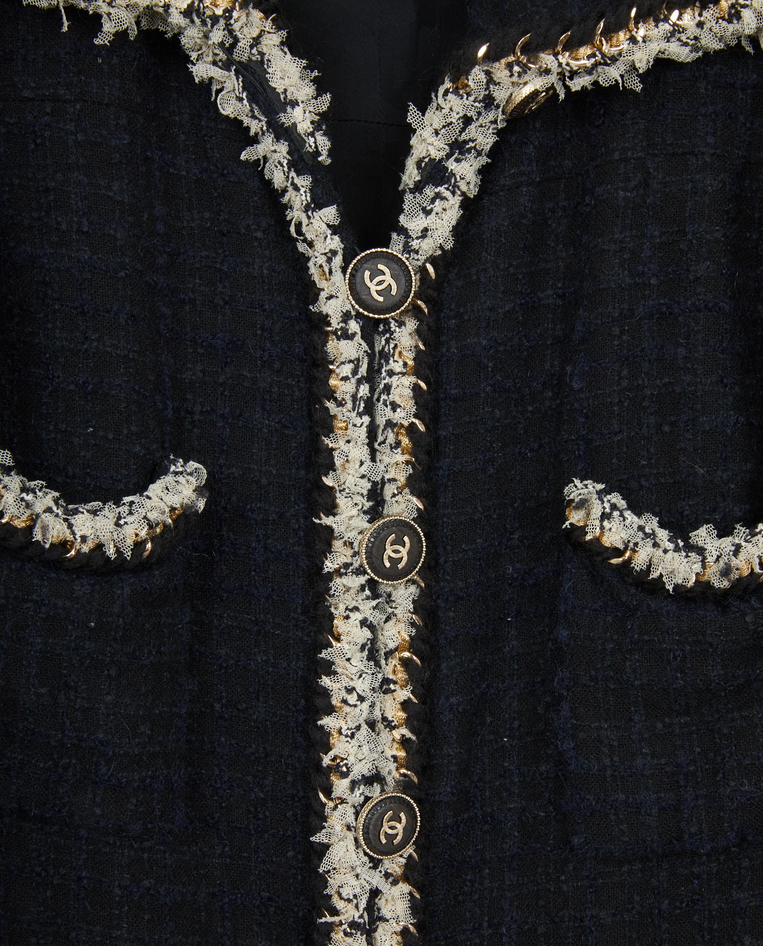Chanel tweed navy blue jacket with lace trim and chain. Four front pockets. Camellia silk lining. Size 38. In very good condition.