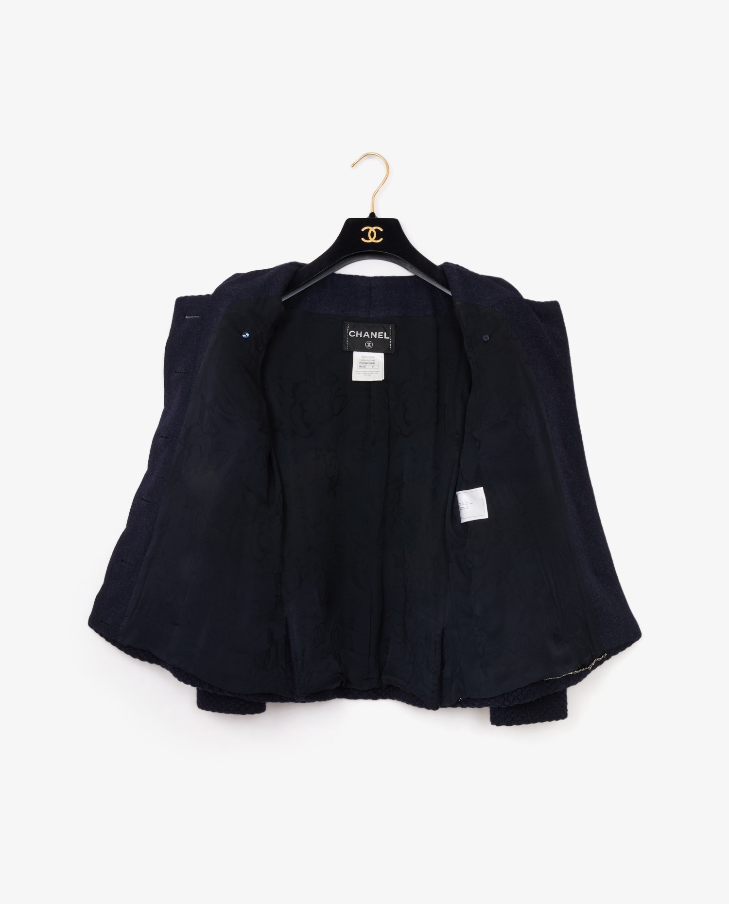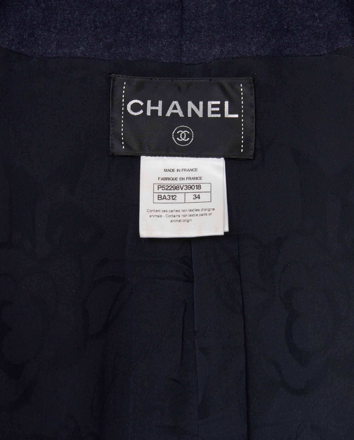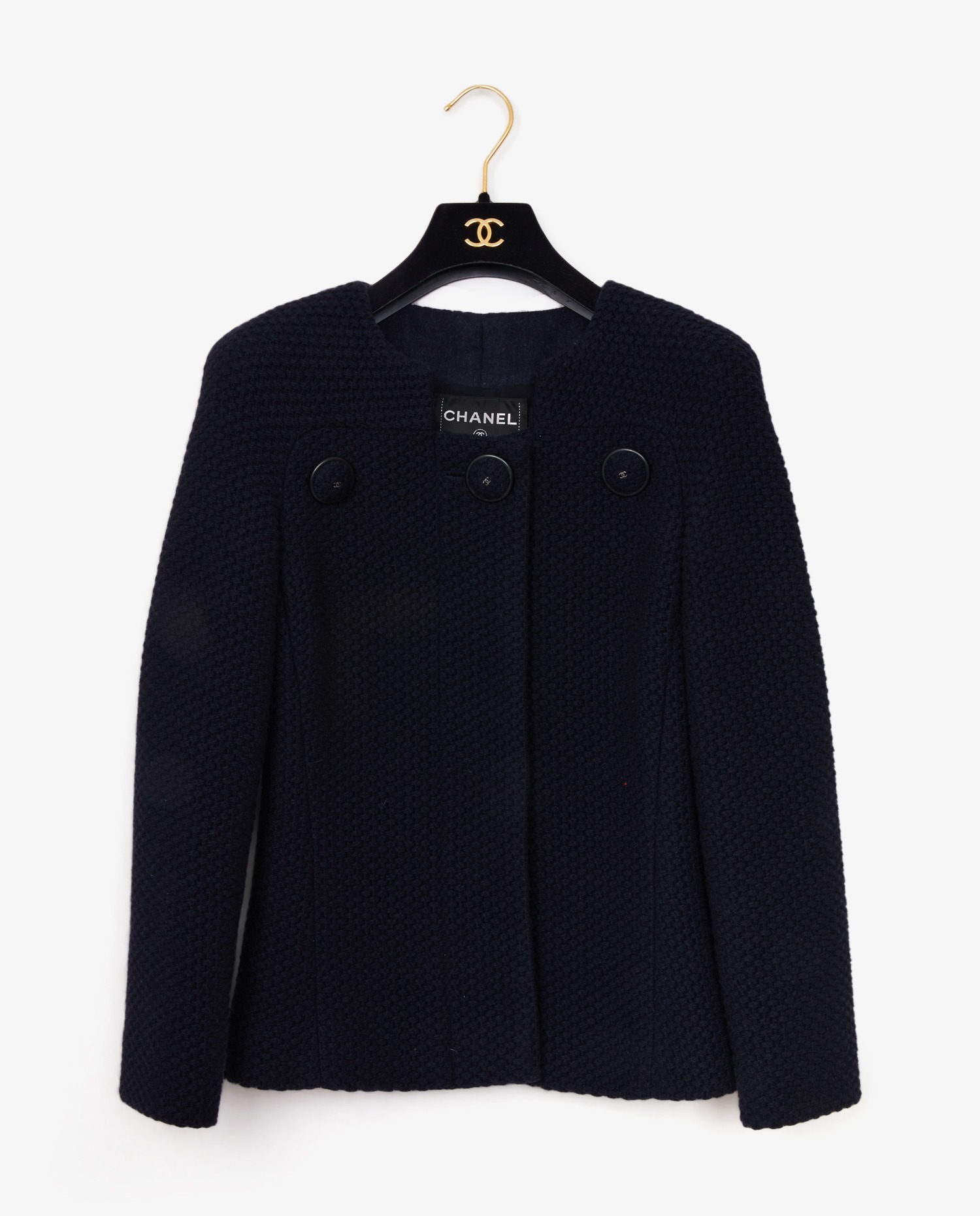 Chanel jacket in navy blue wool. Size 34. Closed with hidden buttons and a large CC button. Chanel lining. In very good condition.