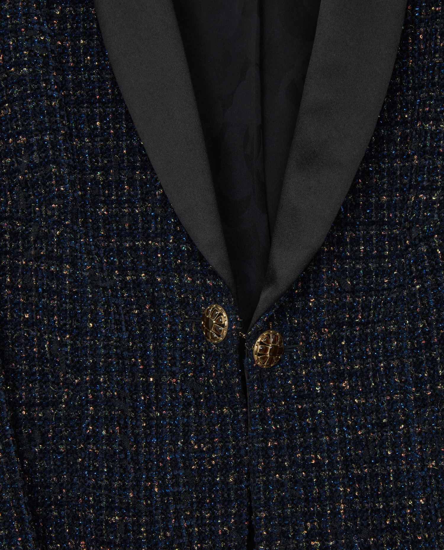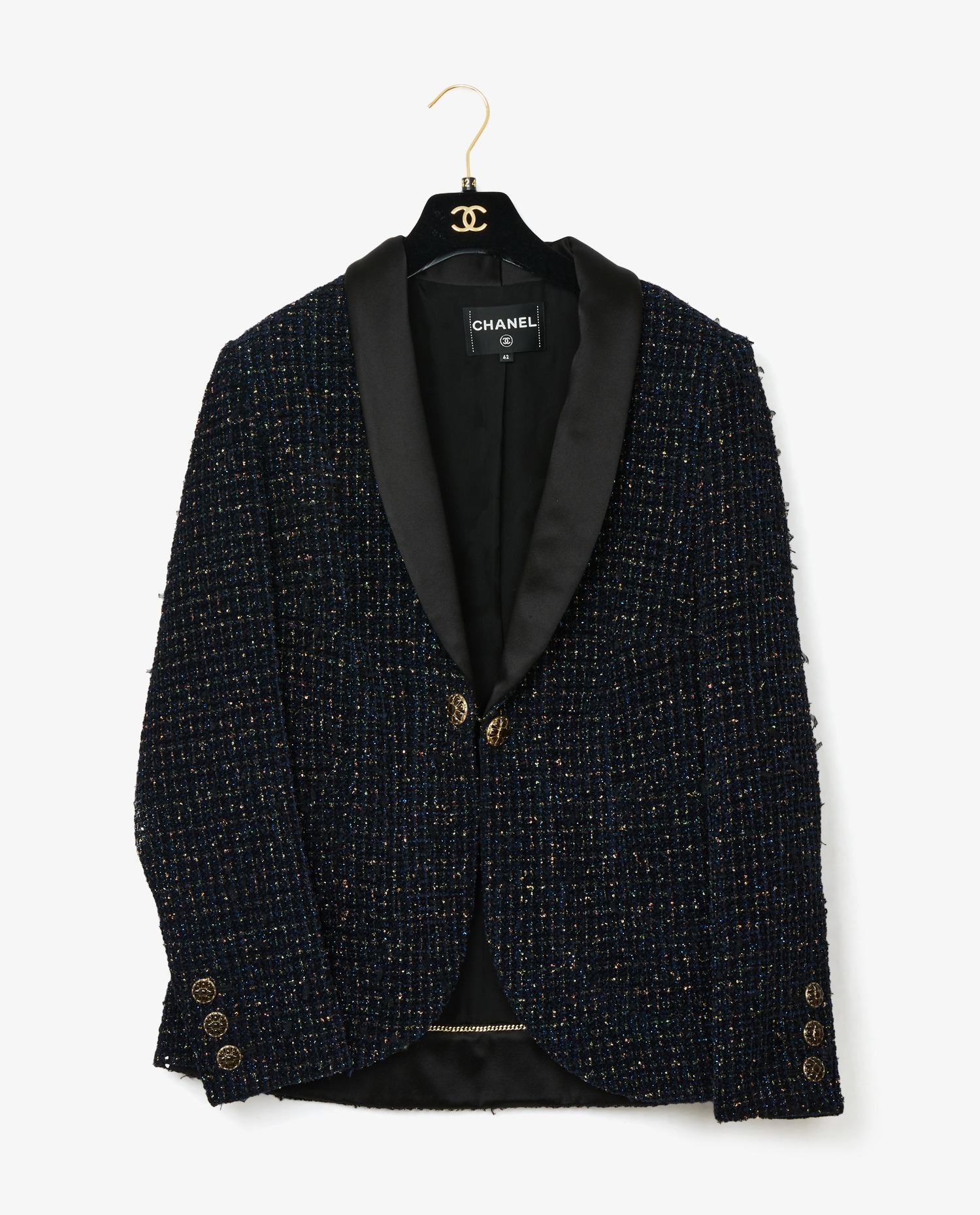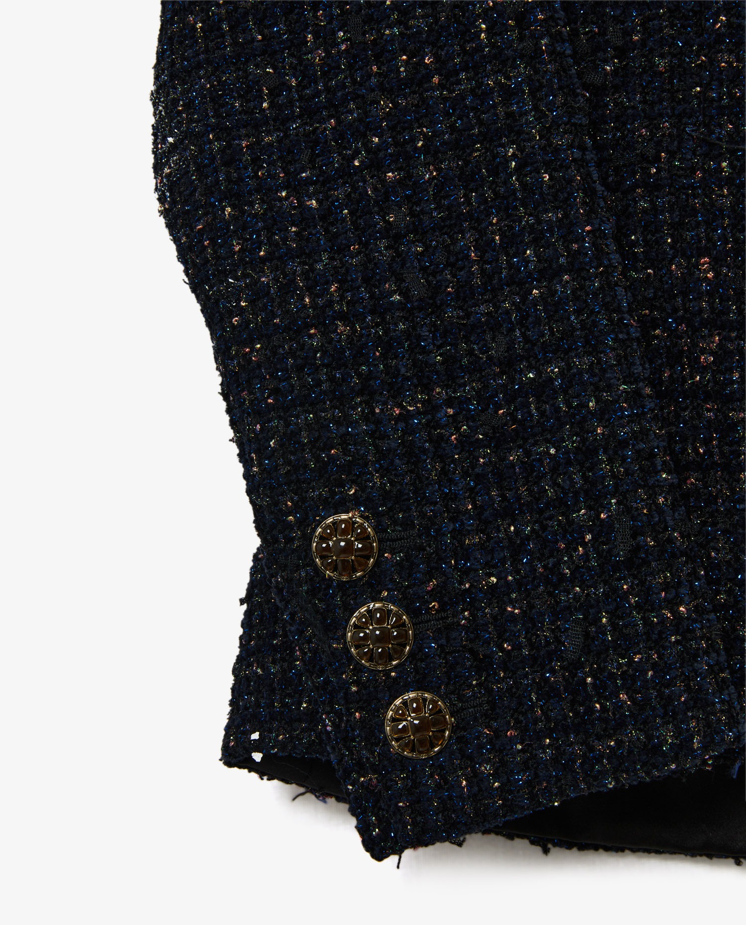 Chanel jacket in navy blue tweed with gold sequins. Size 42. The collar is in black satin. The buttons are made of resin in the shape of flowers with the CC logo. The lining is silk.