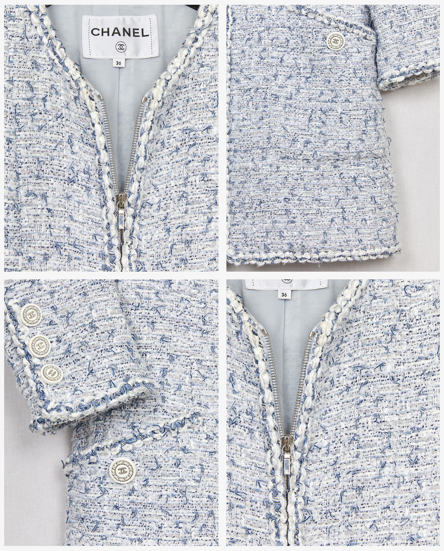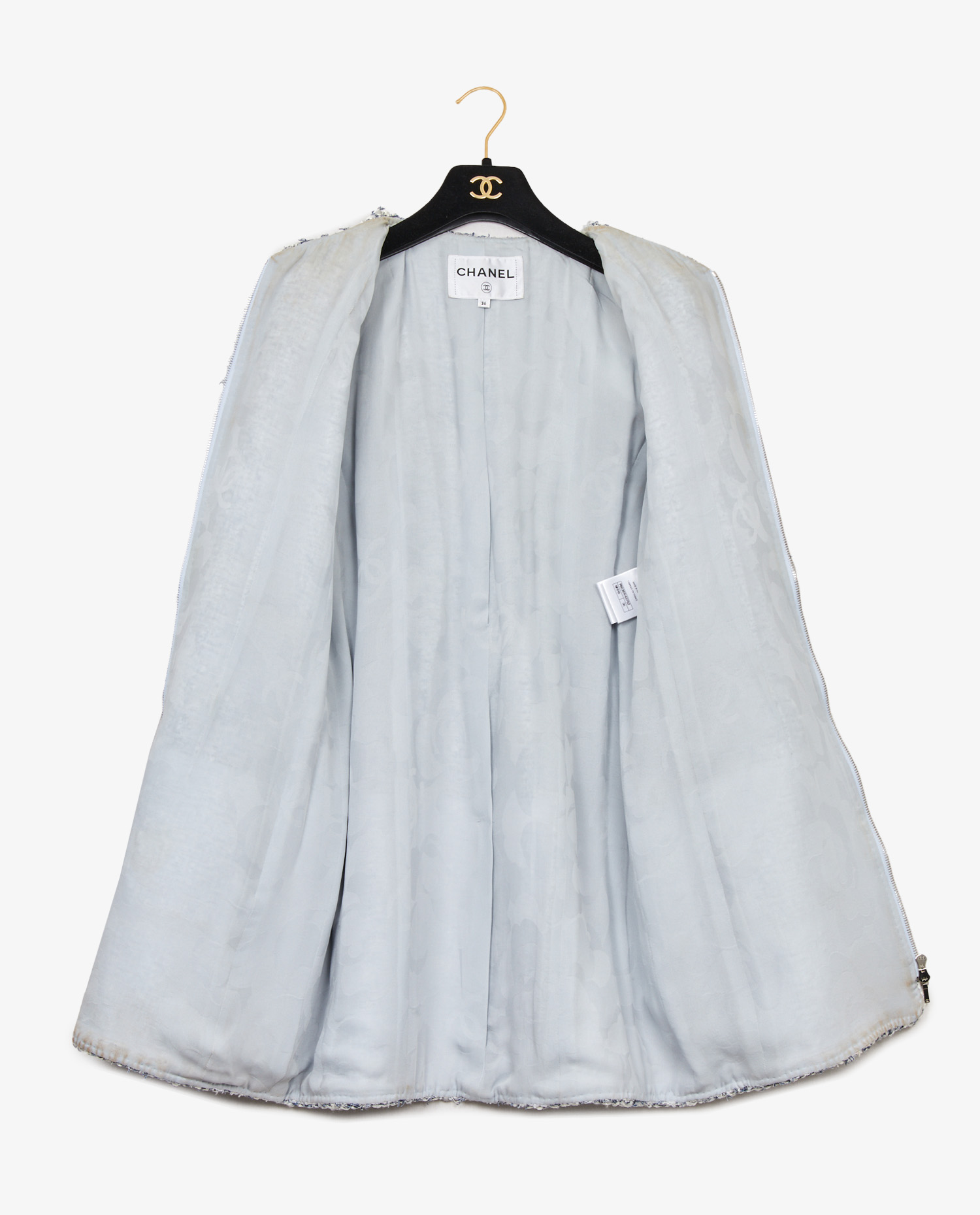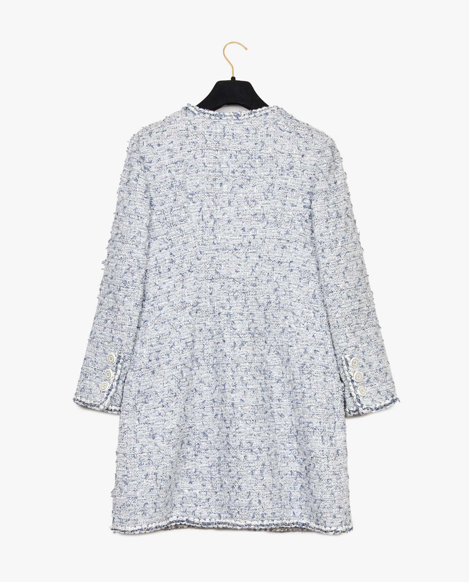 Chanel long jacket in sky-blue tweed. It can also be worn as a dress. Size 36. The lining is silk. Zipper closure.