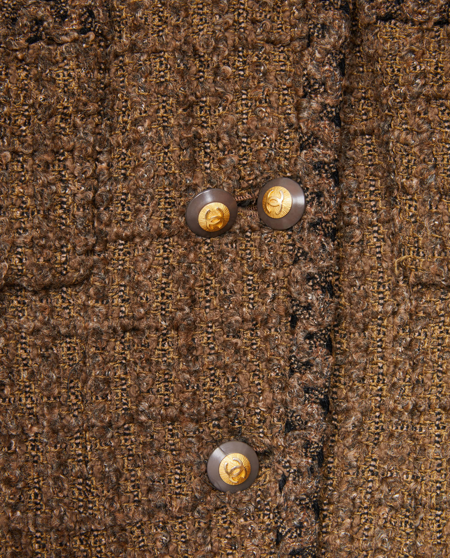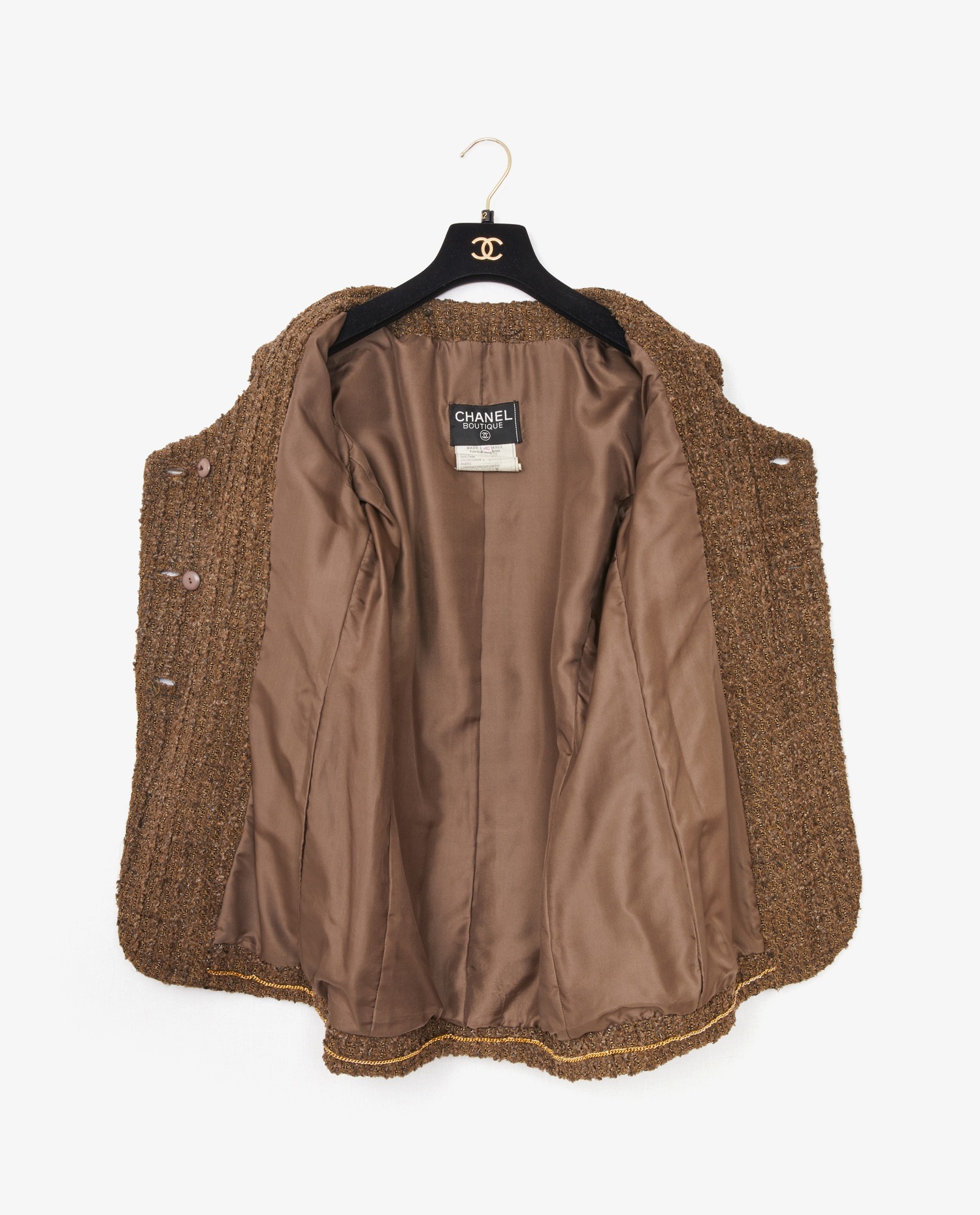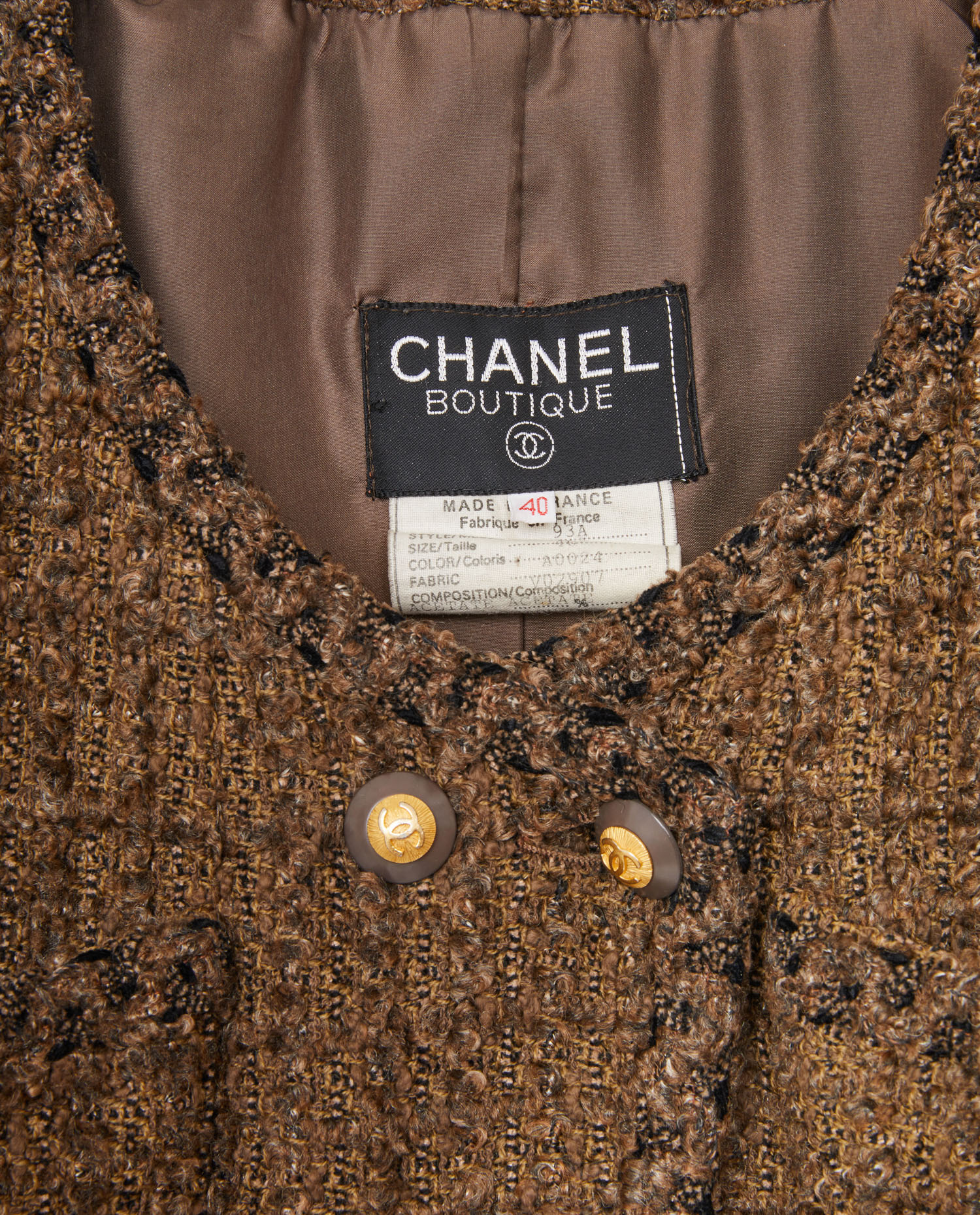 Chanel jacket in vintage brown tweed. Gilded CC buttons. Silk lining. In very good condition.