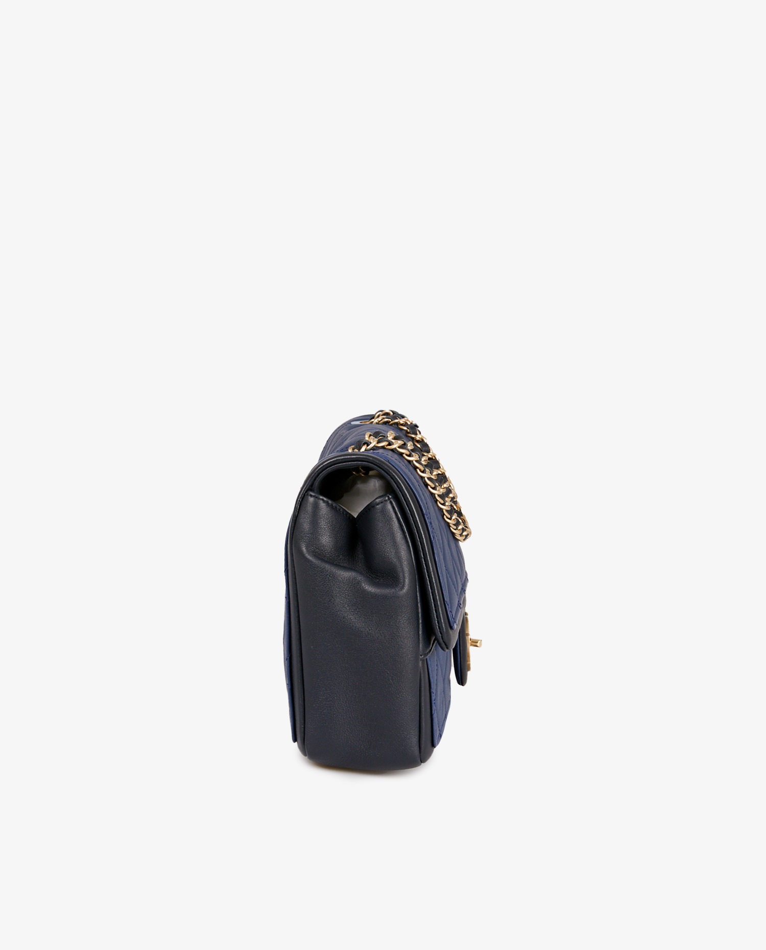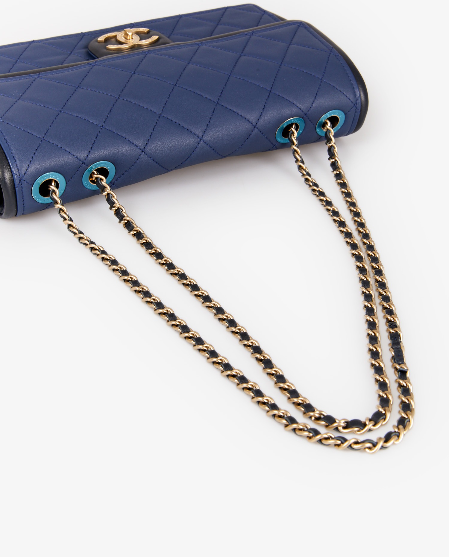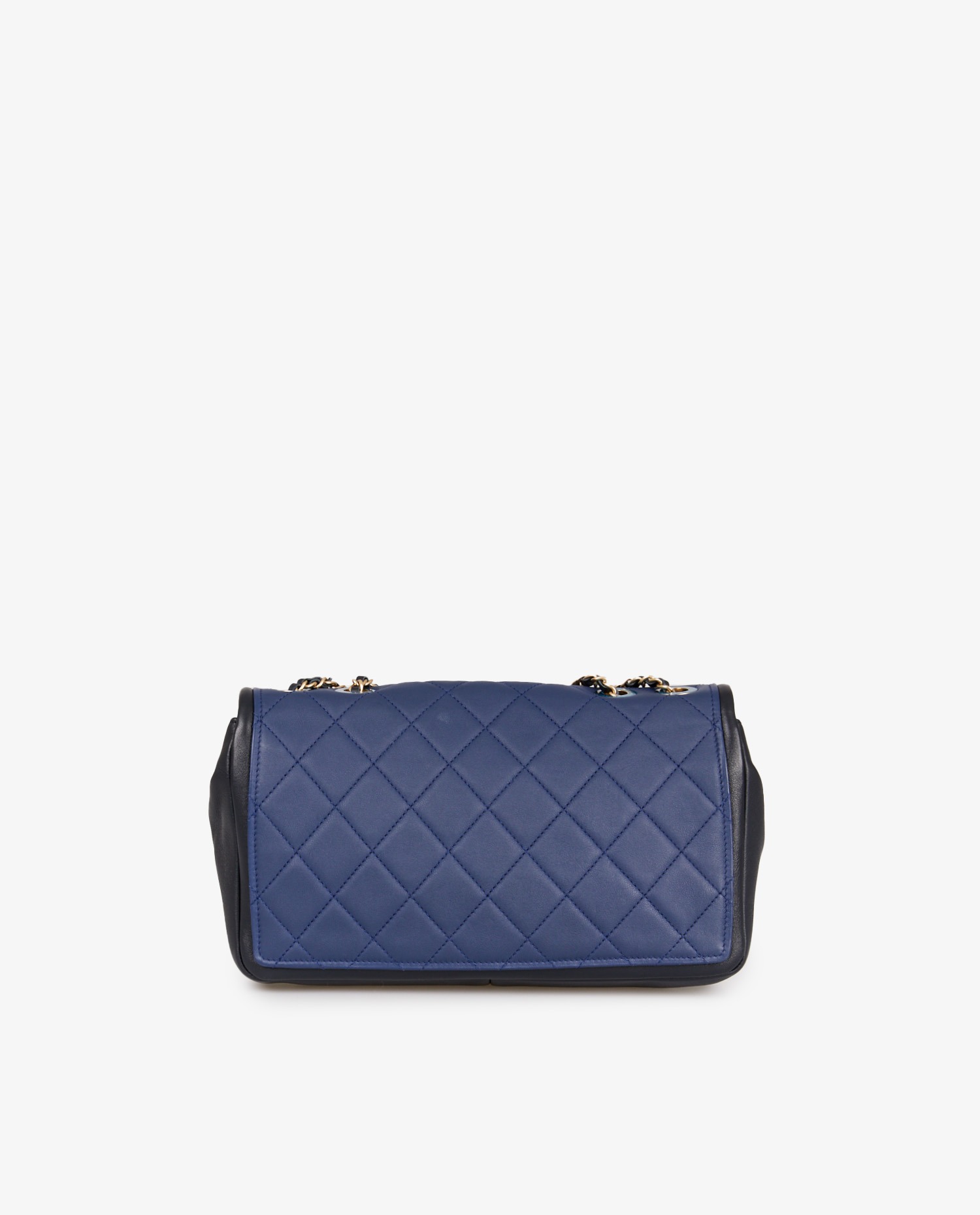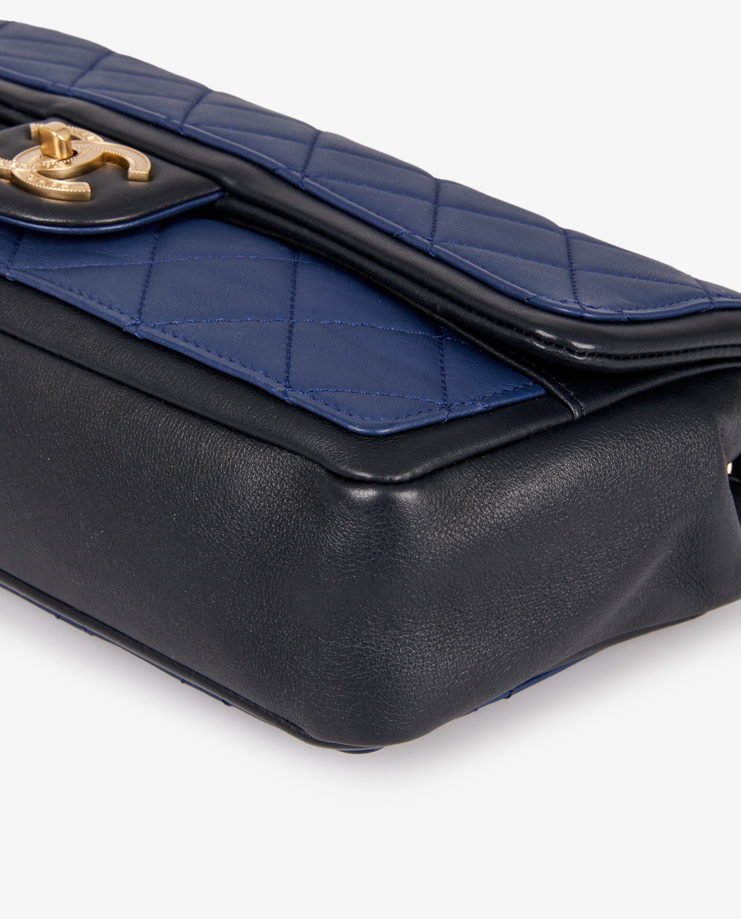 Chanel bag in two-tone black and blue leather. Carried over the shoulder or across the body (108cm). Fabric interior with zipped pocket. In very good condition. Presence of protective plastics.
