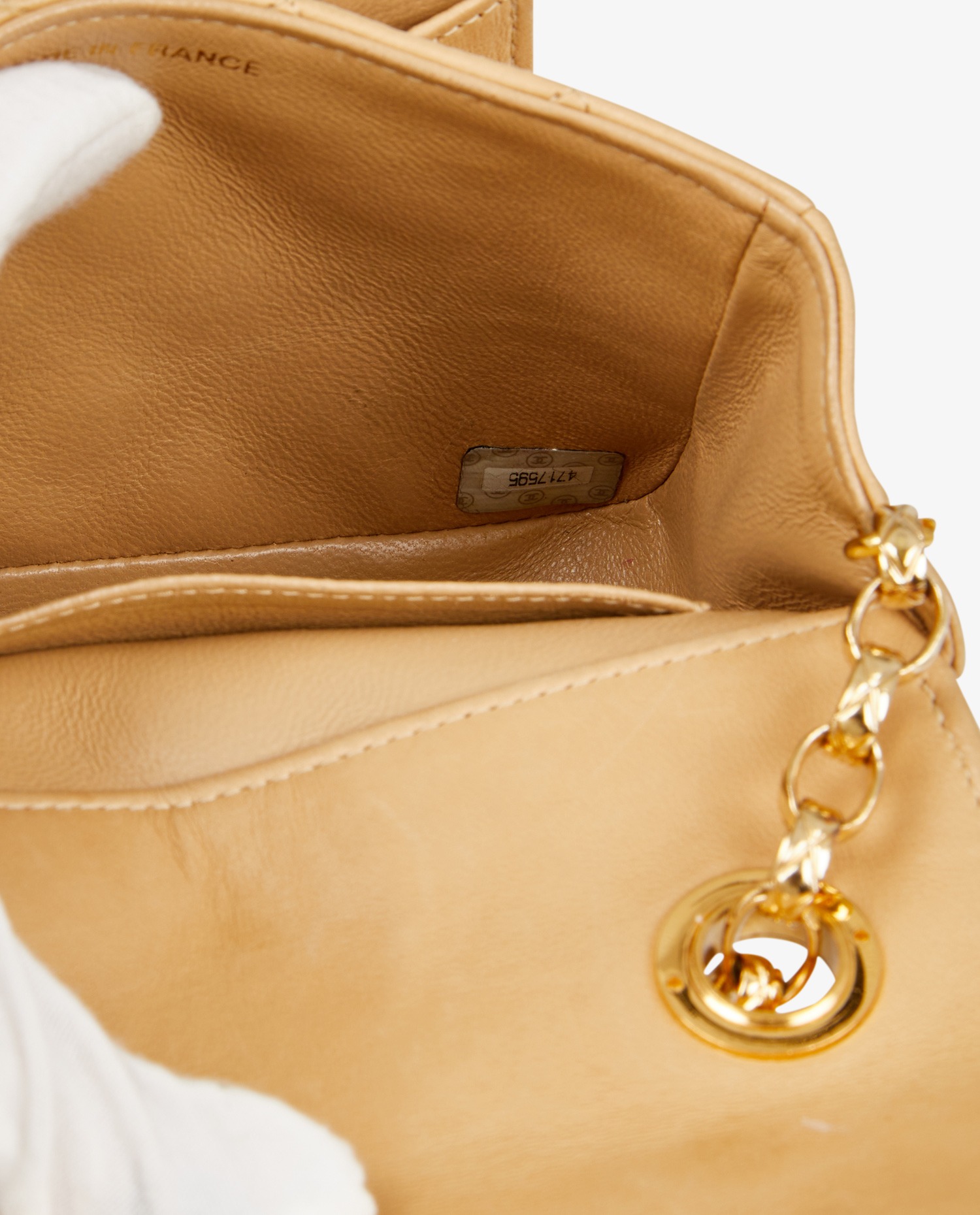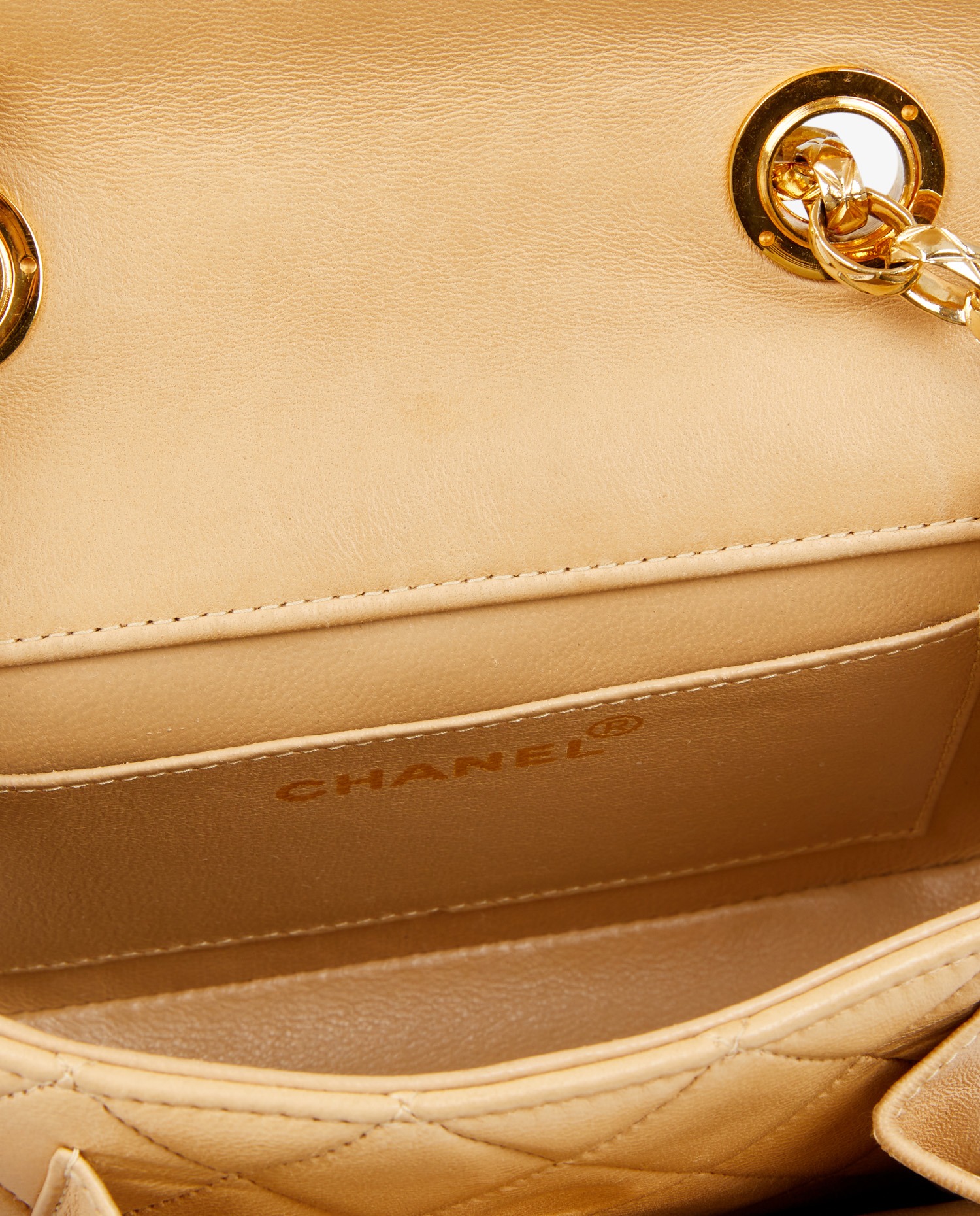 Vintage Chanel mini bag in beige lambskin. The shoulder strap is a real jewel in quilted gold metal. CC clasp. In very good condition. Very slight wear to corners.