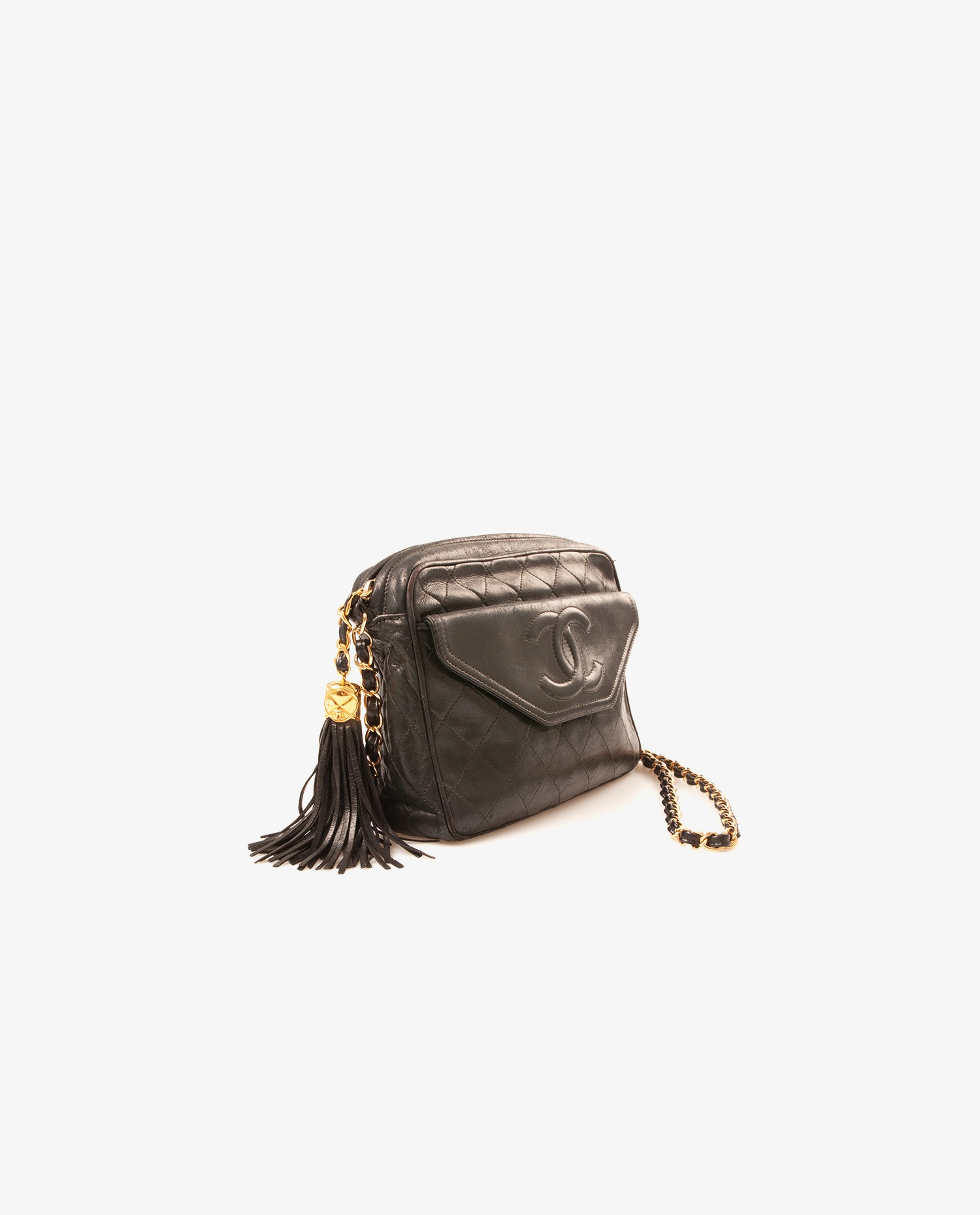 Chanel bag in vintage black lambskin. Worn on the shoulder or crossbody.