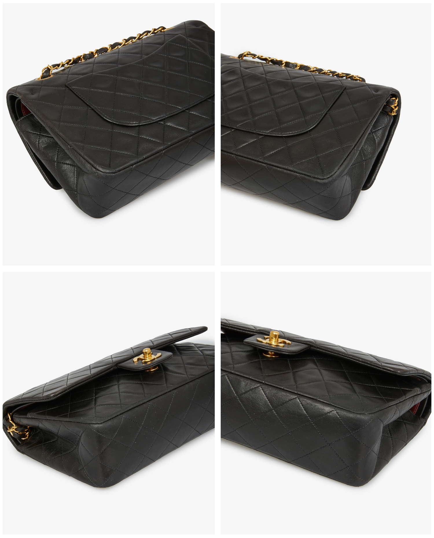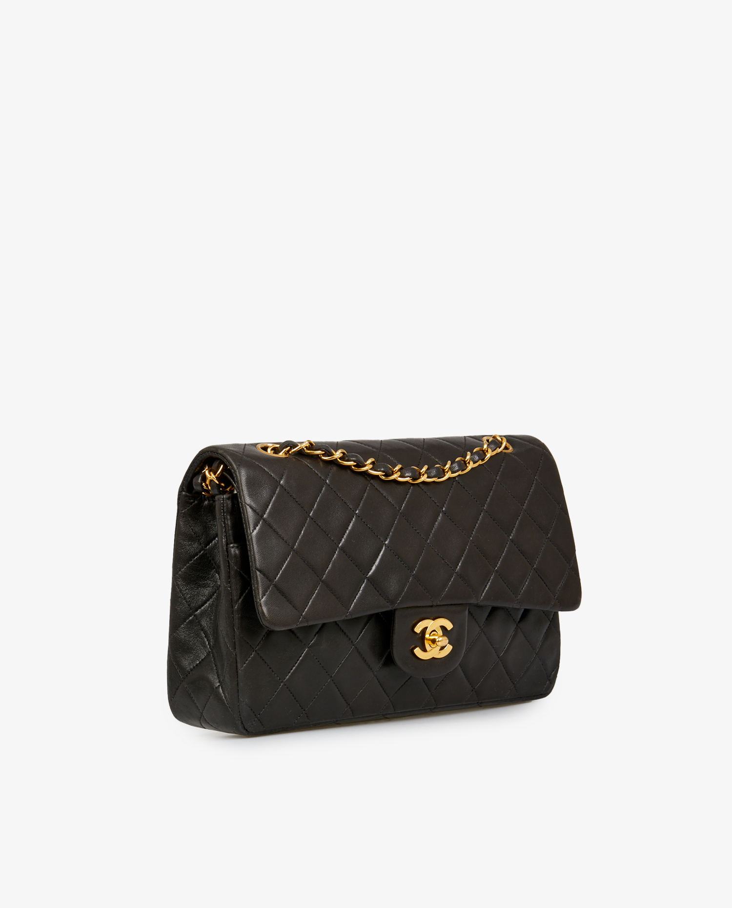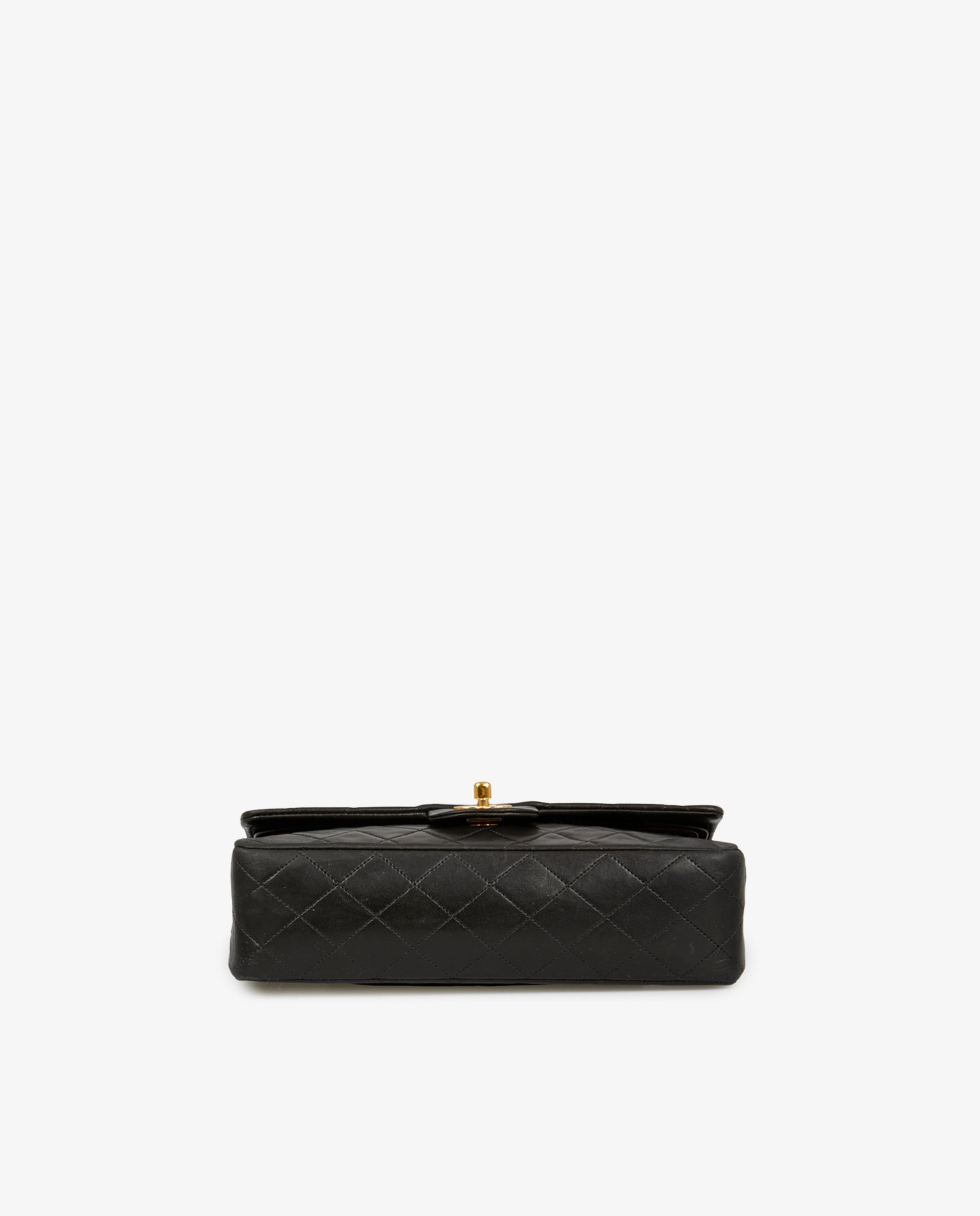 Classic vintage Chanel flap bag in black lambskin. Gold clasp. Double flap. Shoulder-mounted (91cm). In very good condition.